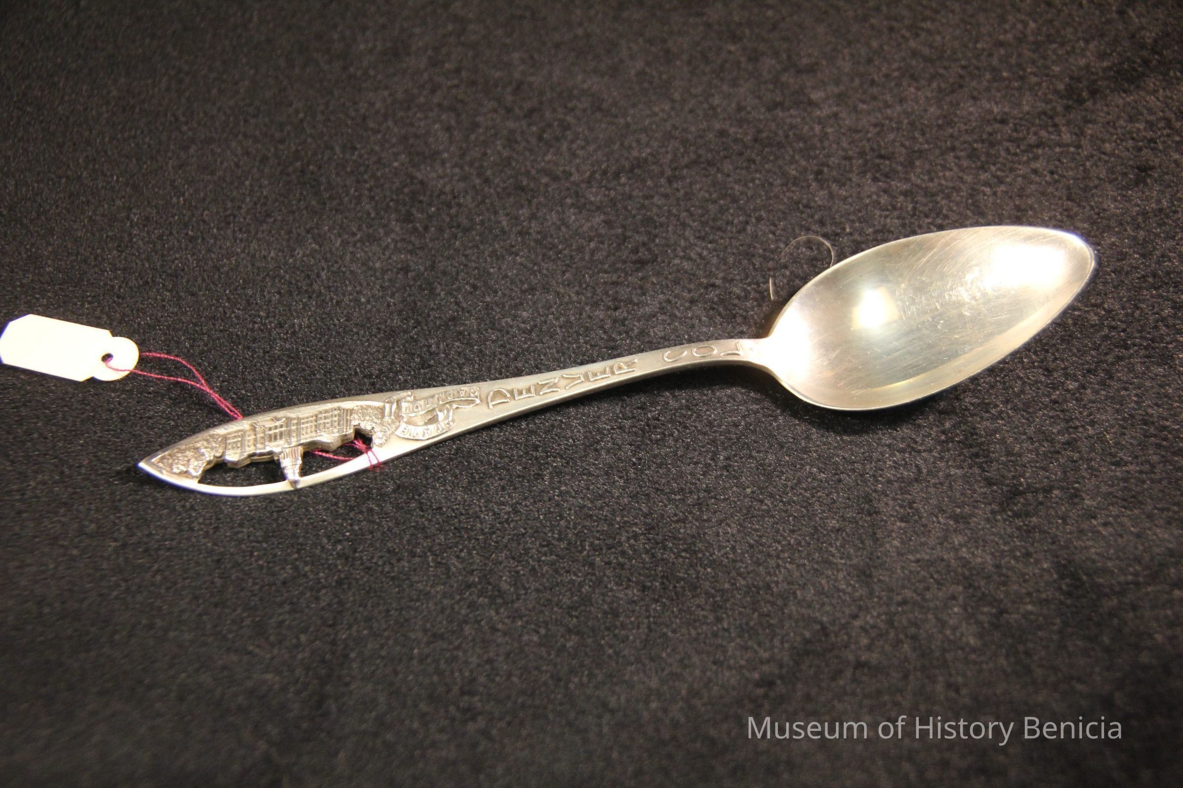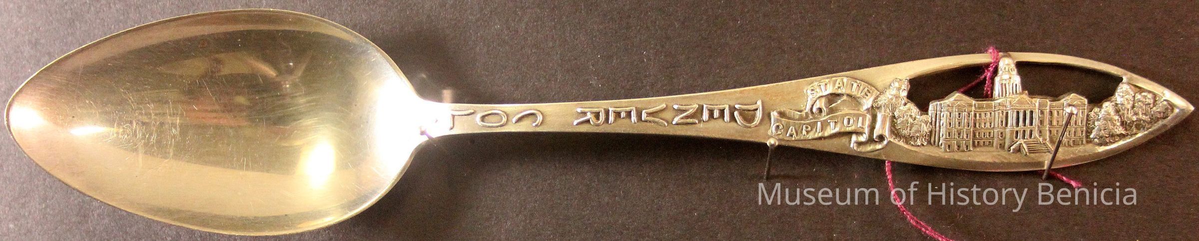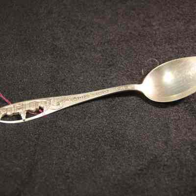 Souvenir spoon from Myrtle Mann collection. This spoon has the word "Denver Col)" on the handle and the words "State Capitol". There is a cutout design of the Denver skyline too. It is 5.75" long.