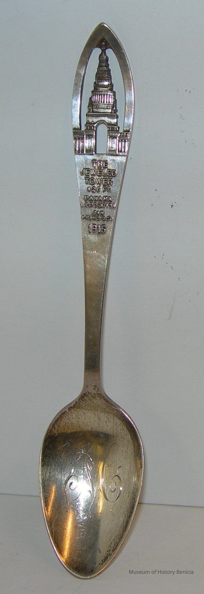 Souvenir spoon from Myrtle Mann collection. This spoon has a building on the handle with the words "The Jeweled Tower 126 ft Panama Exposition San Francisco 1915" underneath. The spoon has initial "M".