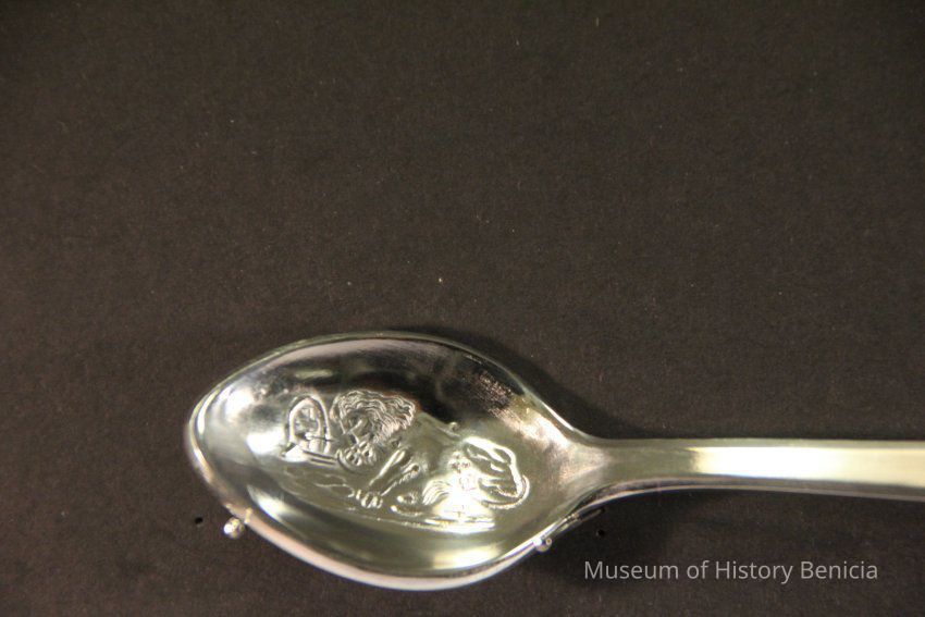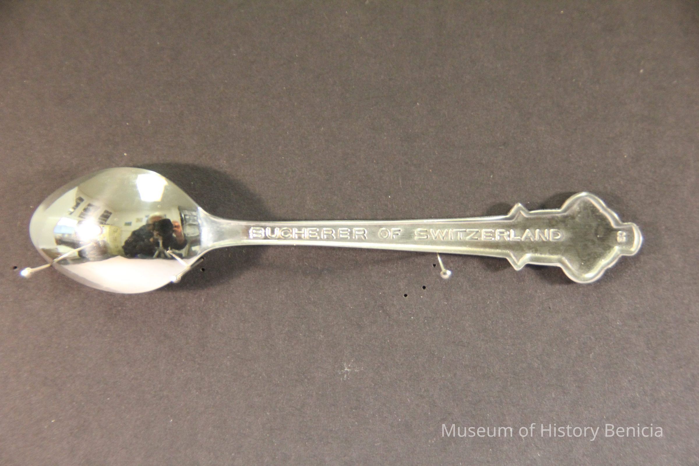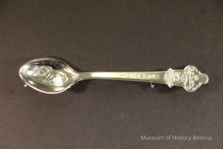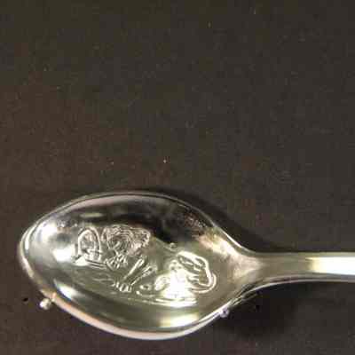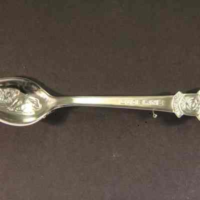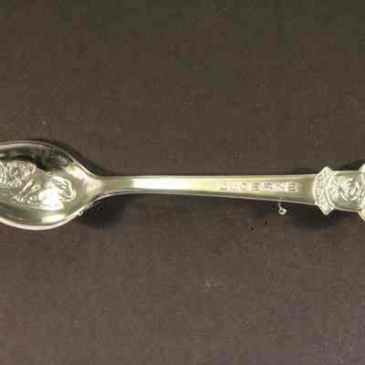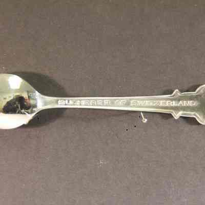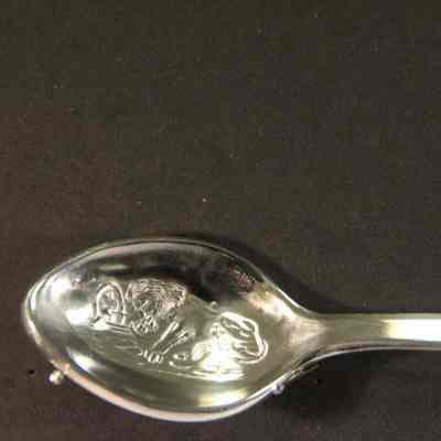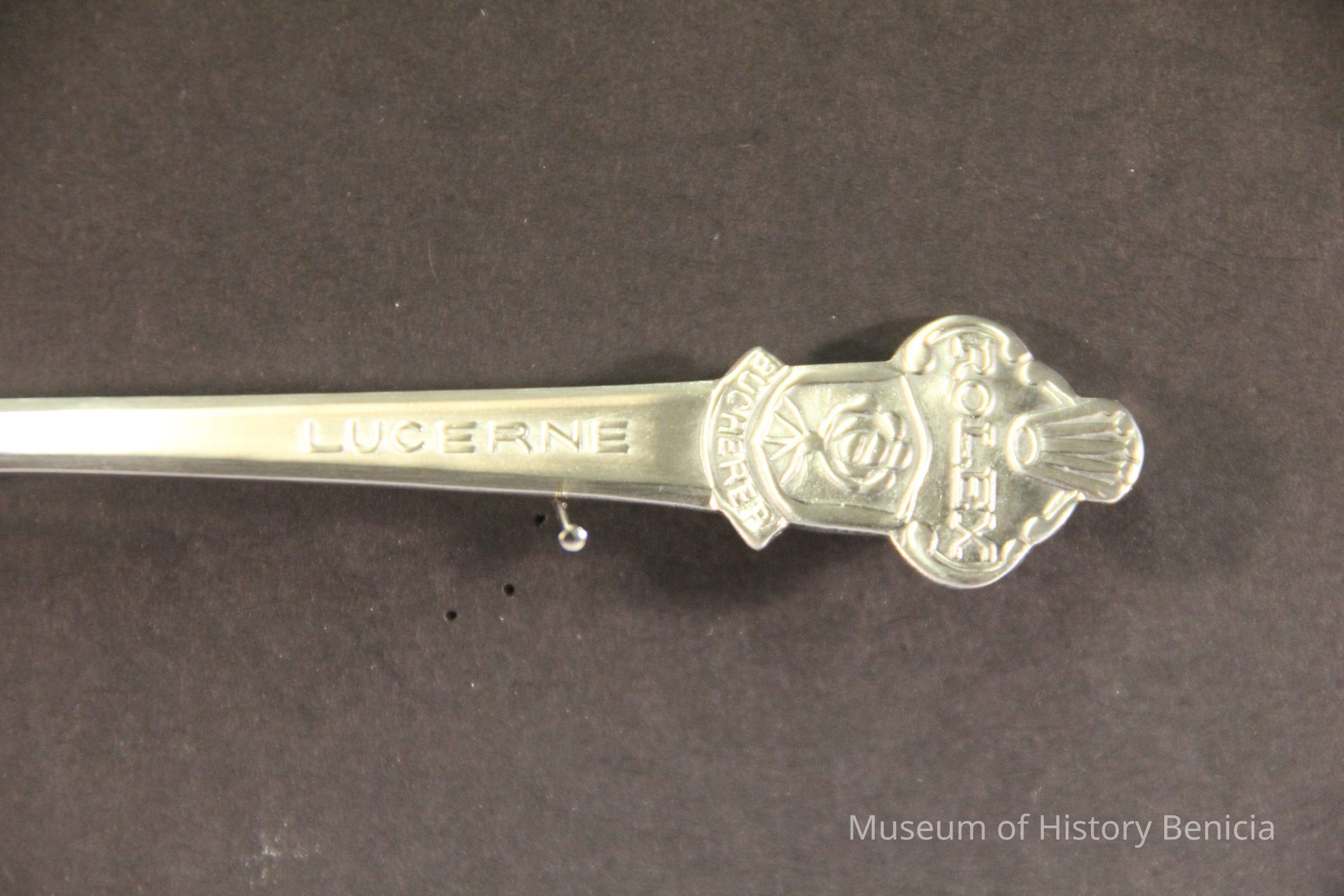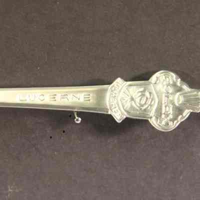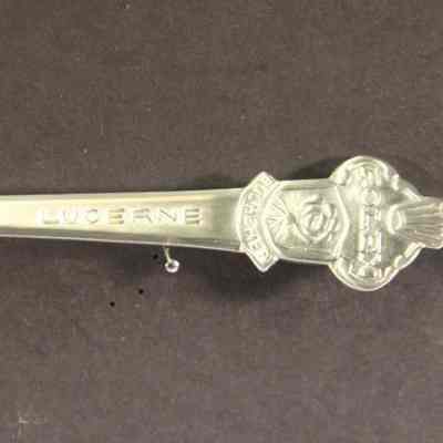 Souvenir spoon from Myrtle Mann collection. This spoon is a Rolex spoon. It has those words on end and the word "Lucerne" on the handle. There is a lion design in the bowl of the spoon. The handle is plain. It is 4.25." long.