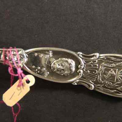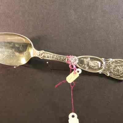 Souvenir spoon from Myrtle Mann collection. This spoon is from Belgium. It has an image of Albert and his name on the stem. The end of the spoon has a royal crest. It is 6.00" long.