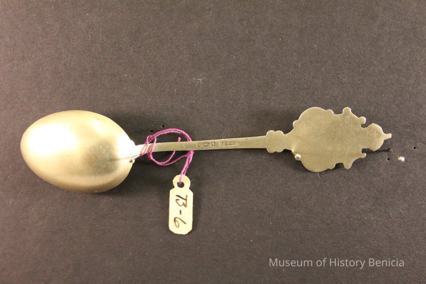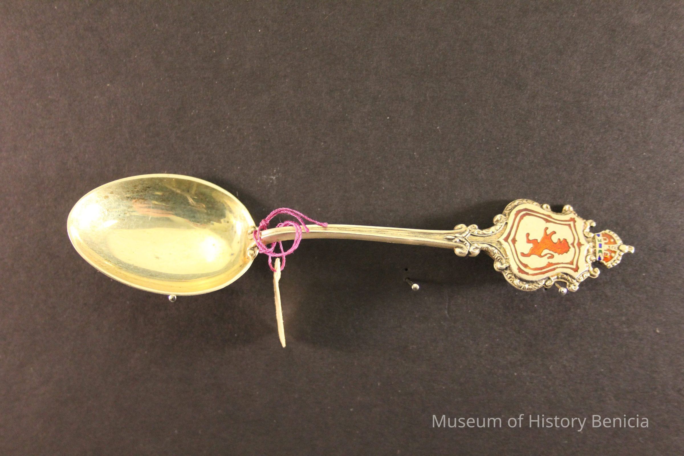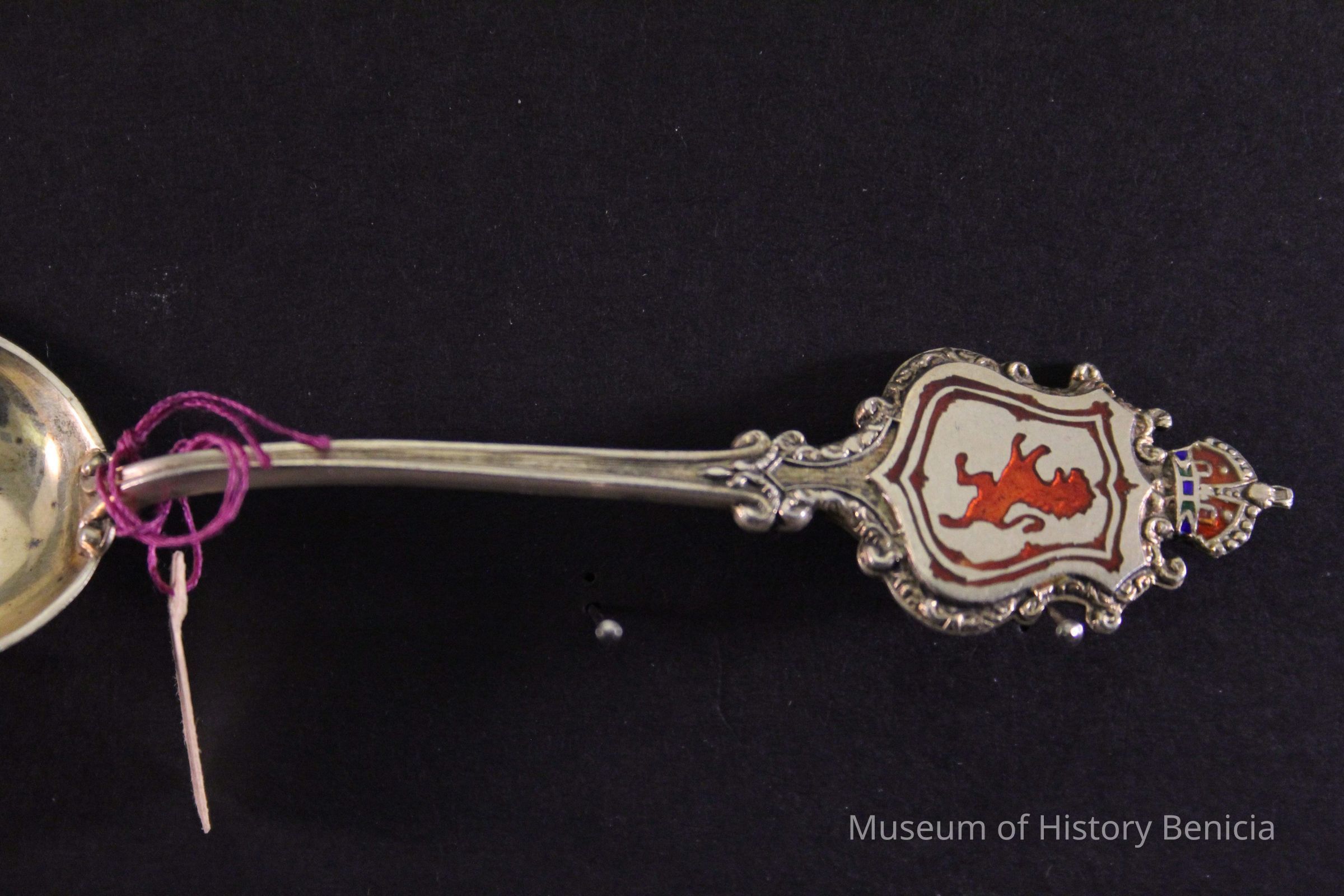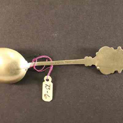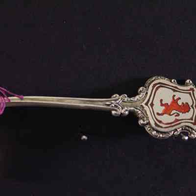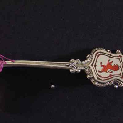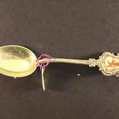 Souvenir spoon from Myrtle Mann collection. This spoon is from London England. It has a red lion and crown on the end of the handle. It is 4.25" long.