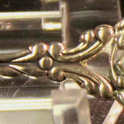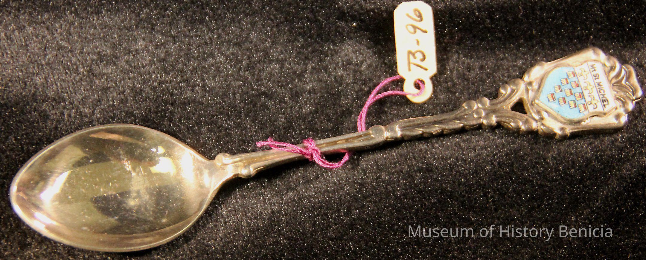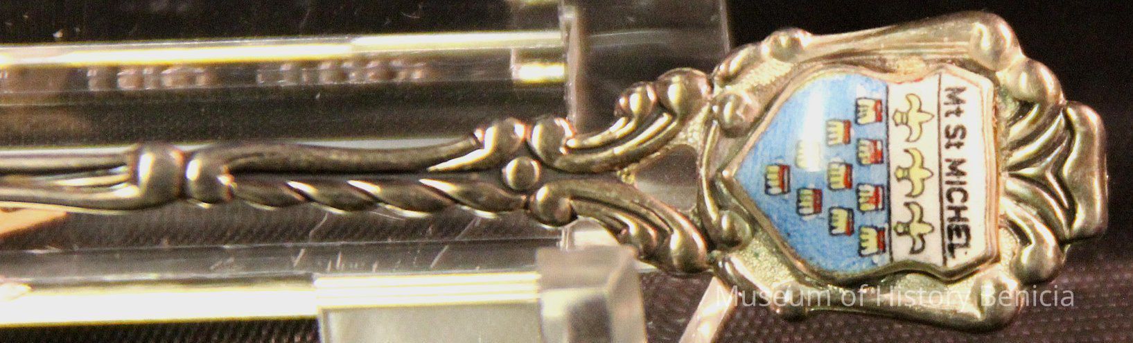 Souvenir spoon from Myrtle Mann collection. This spoon has a shield on the end with the words "Mt St Michel", 4 fleur-de-lis and 10 other objects on a field of blue. The back has the "P/B" and a hallmark. There is another word but it is too tarnished to read.