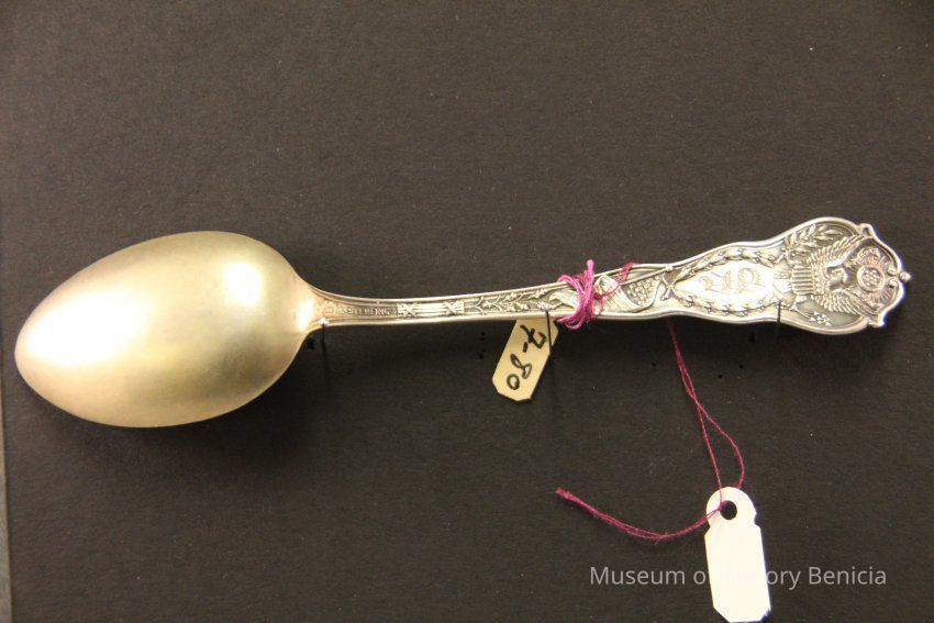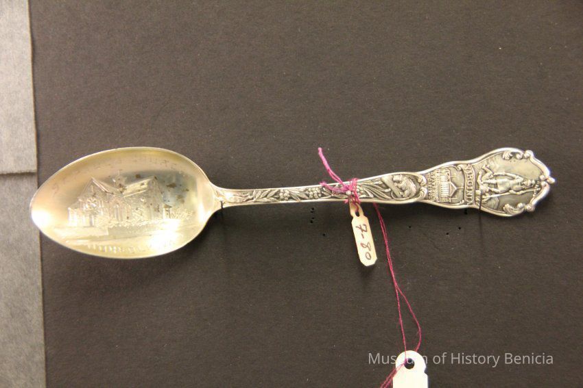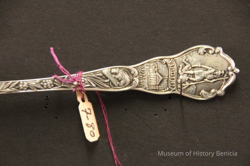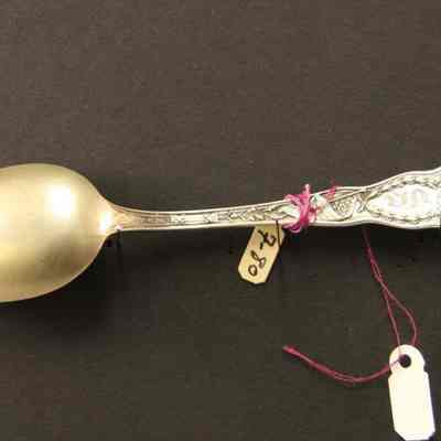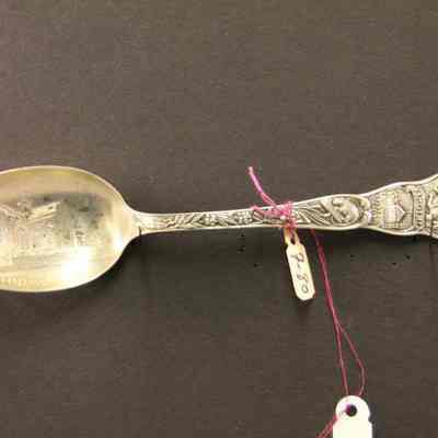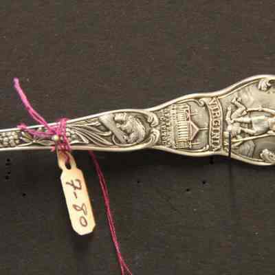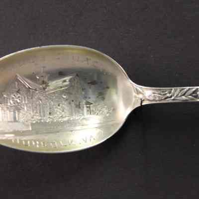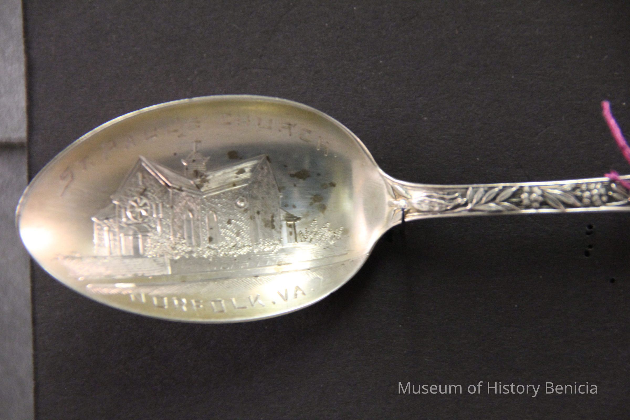 Souvenir spoon from Myrtle Mann collection. This spoon is from Norfolk Va.. The end has the Viorginia State seal and the word Virginia. The stem has a possom and flowers and the bowl has an engraving of St. Paul's church in Norfolk . It is 6.00" long.
