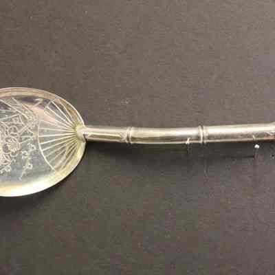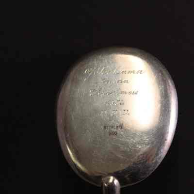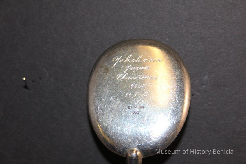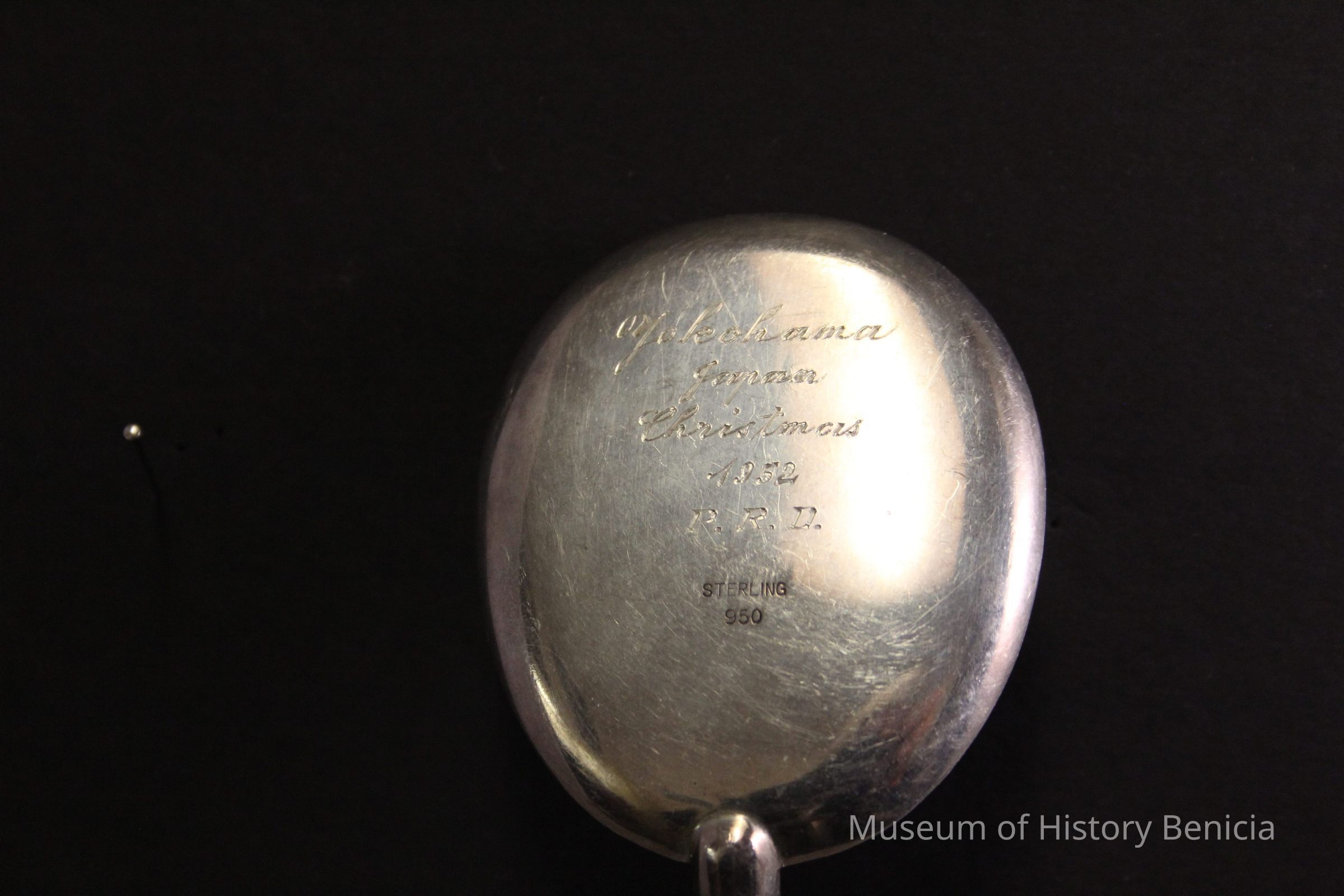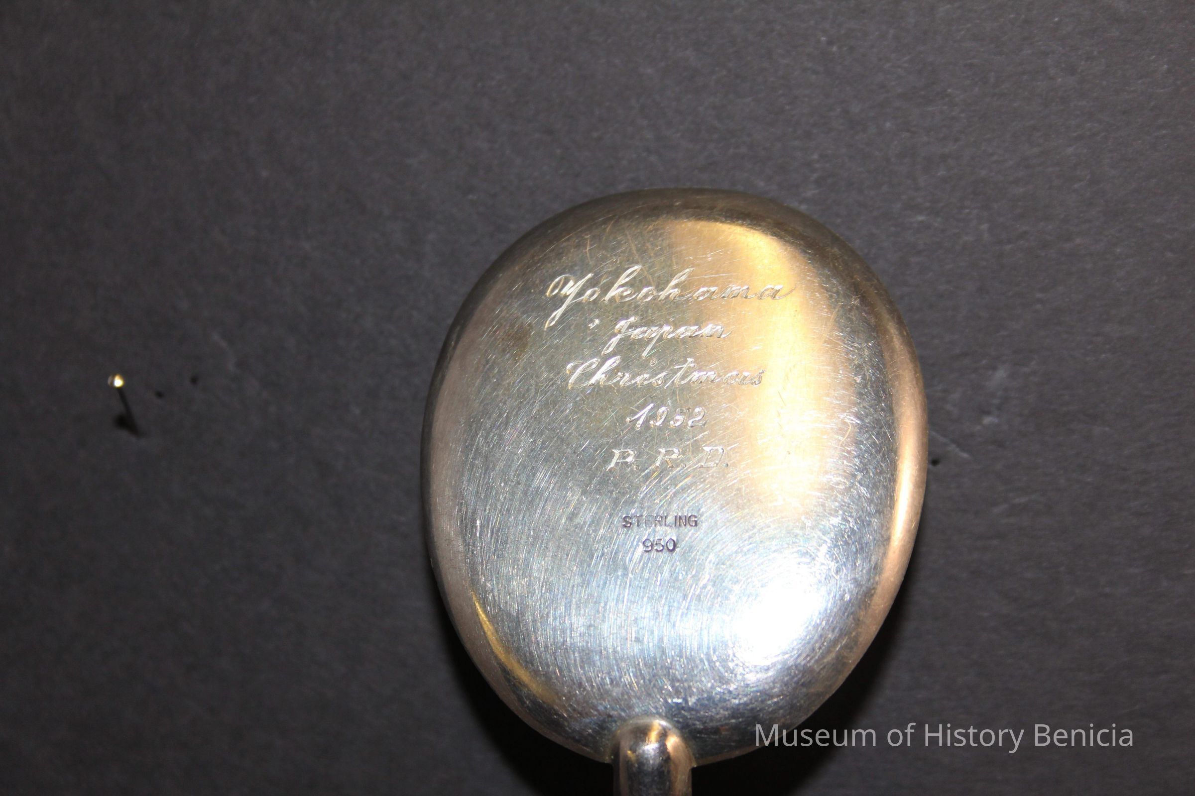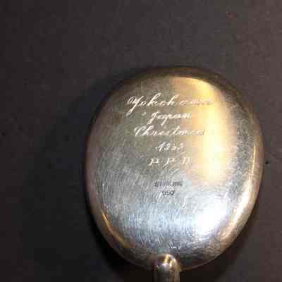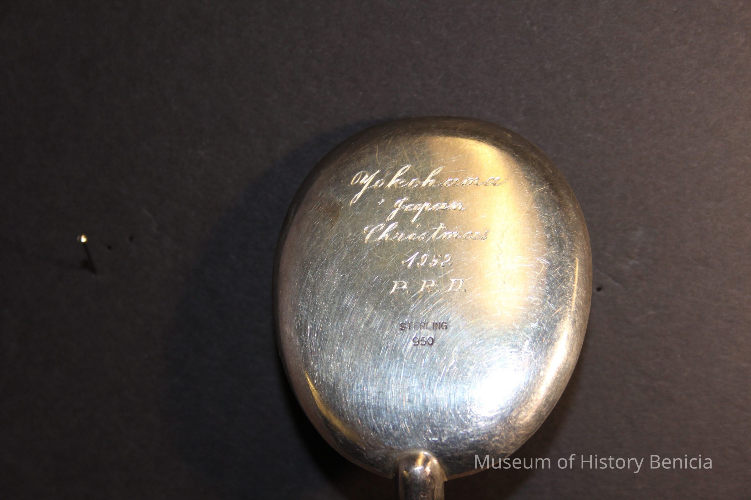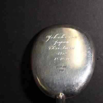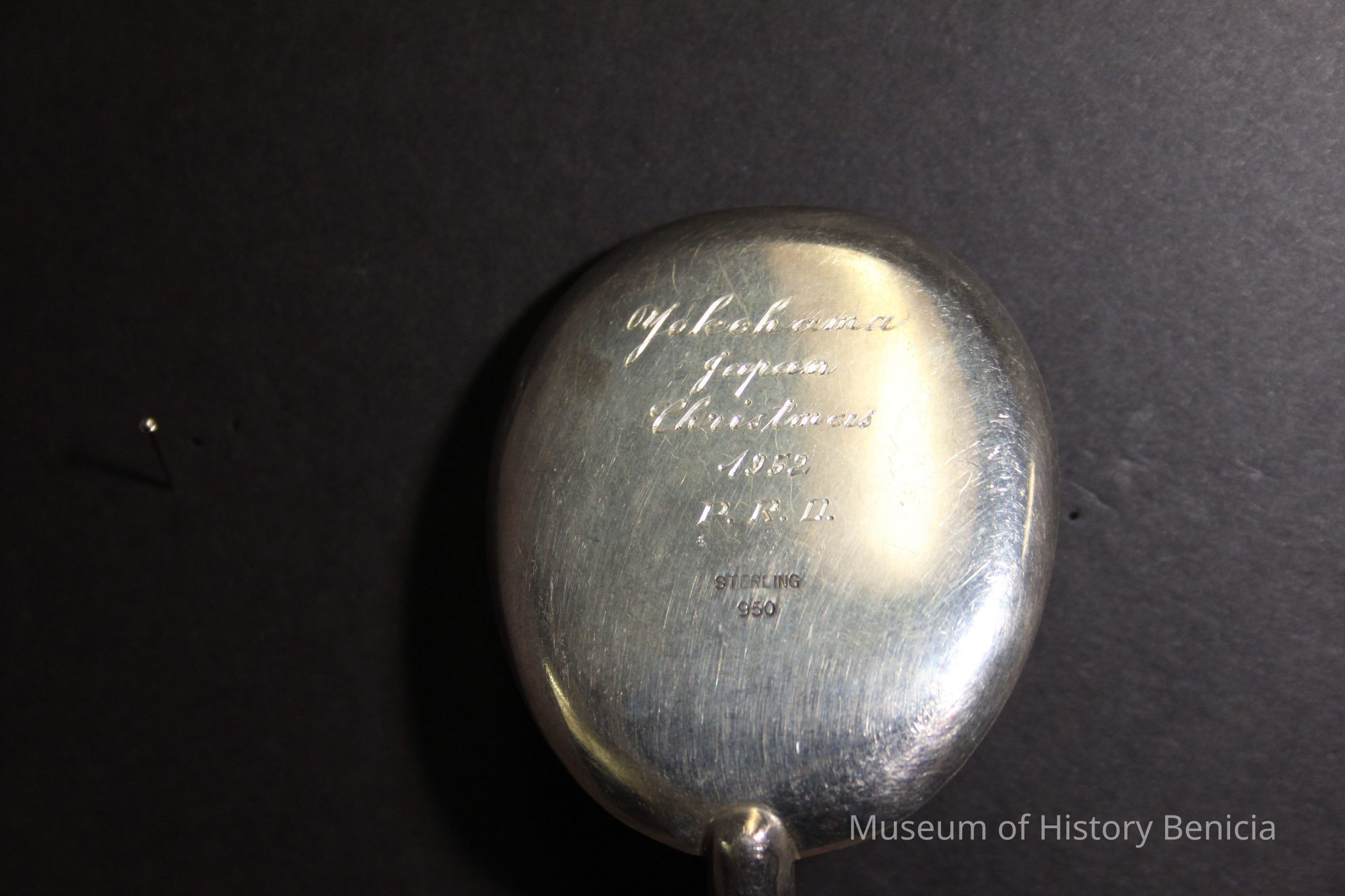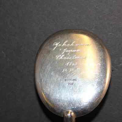Souvenir spoon from Myrtle Mann collection. This spoon has "an inscription on the back of the bowl "Yokohama Japan Christmas 1952 P.R.D." There is a mountain and flower design in the bowl. It is 5.75" long.