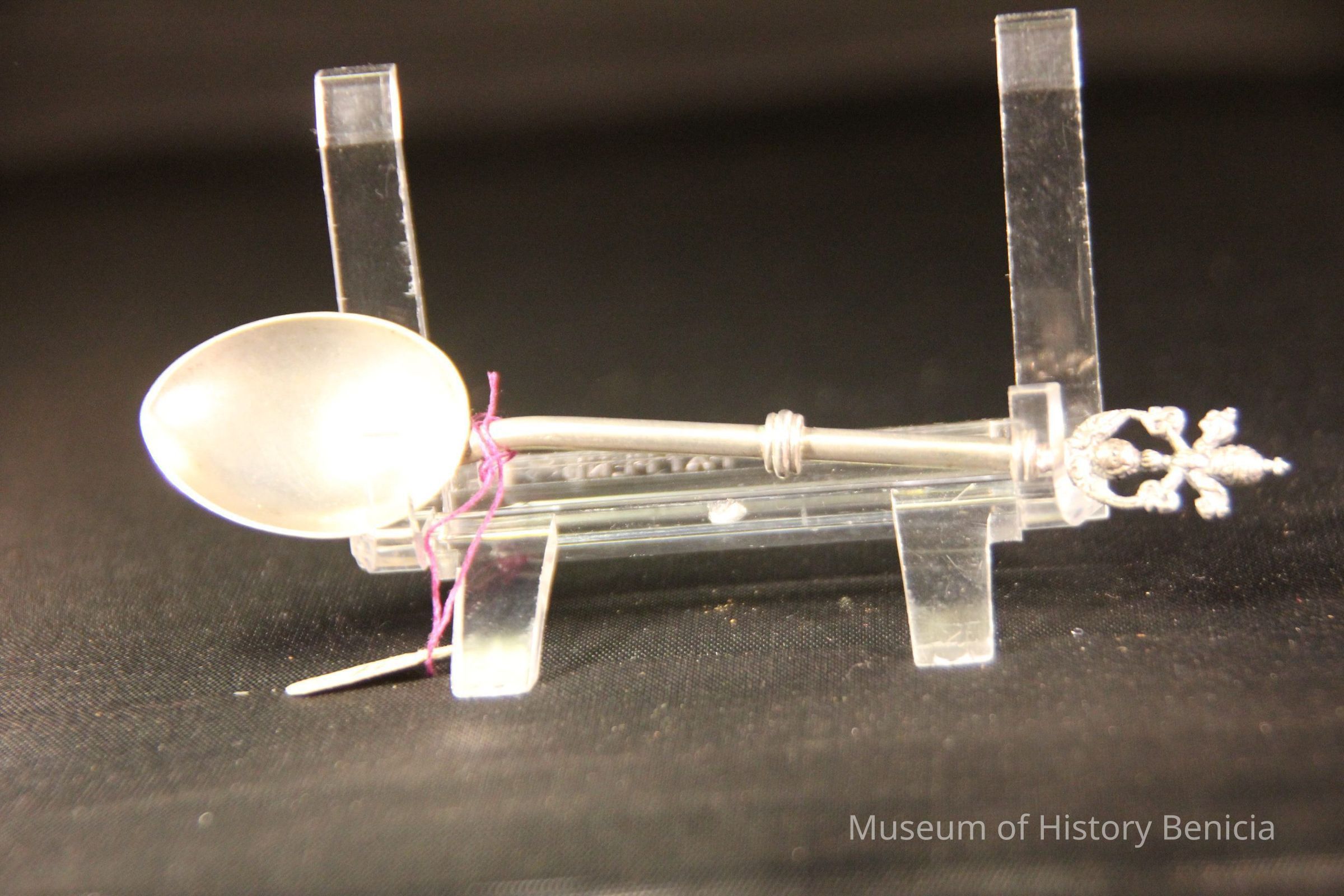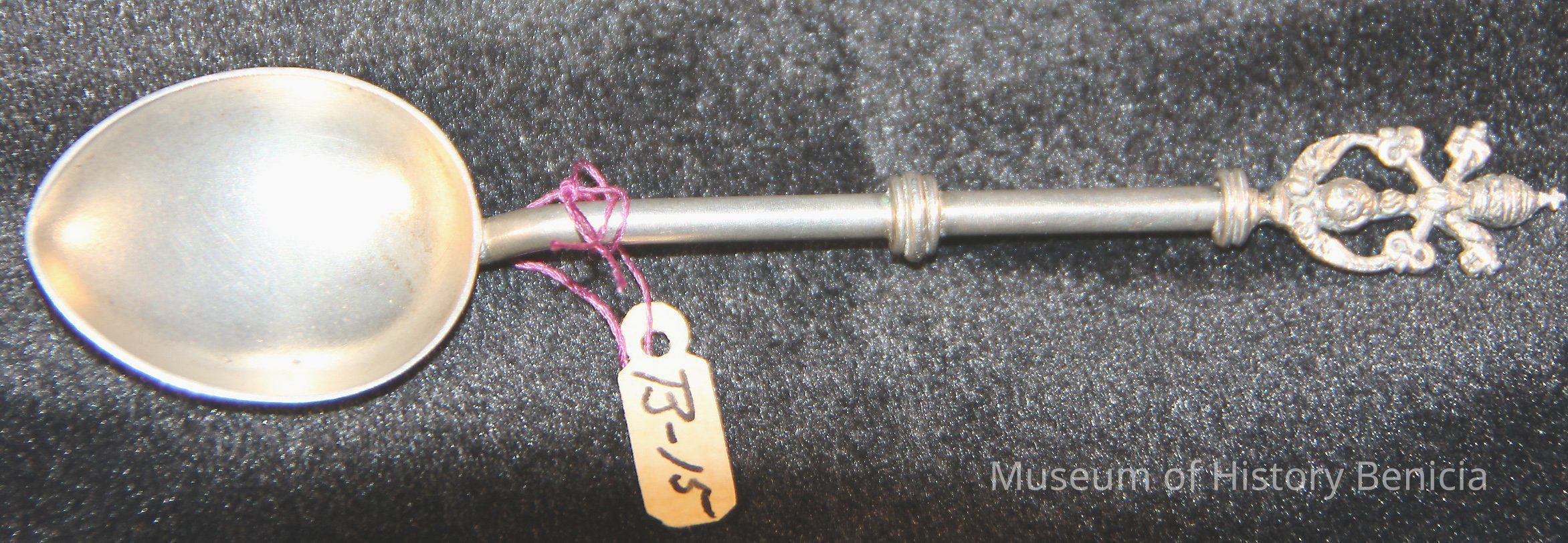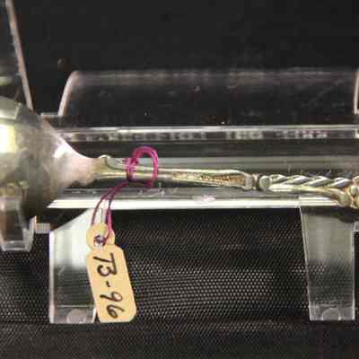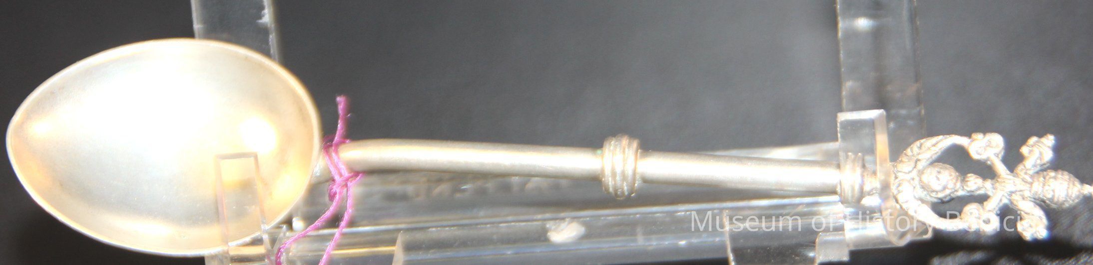 Souvenir spoon from Myrtle Mann collection. This spoon has a figure on the handle holding two keys and a basket with a cross on top.