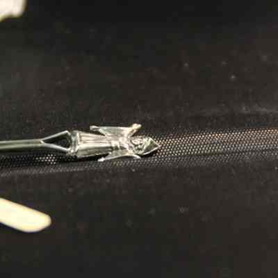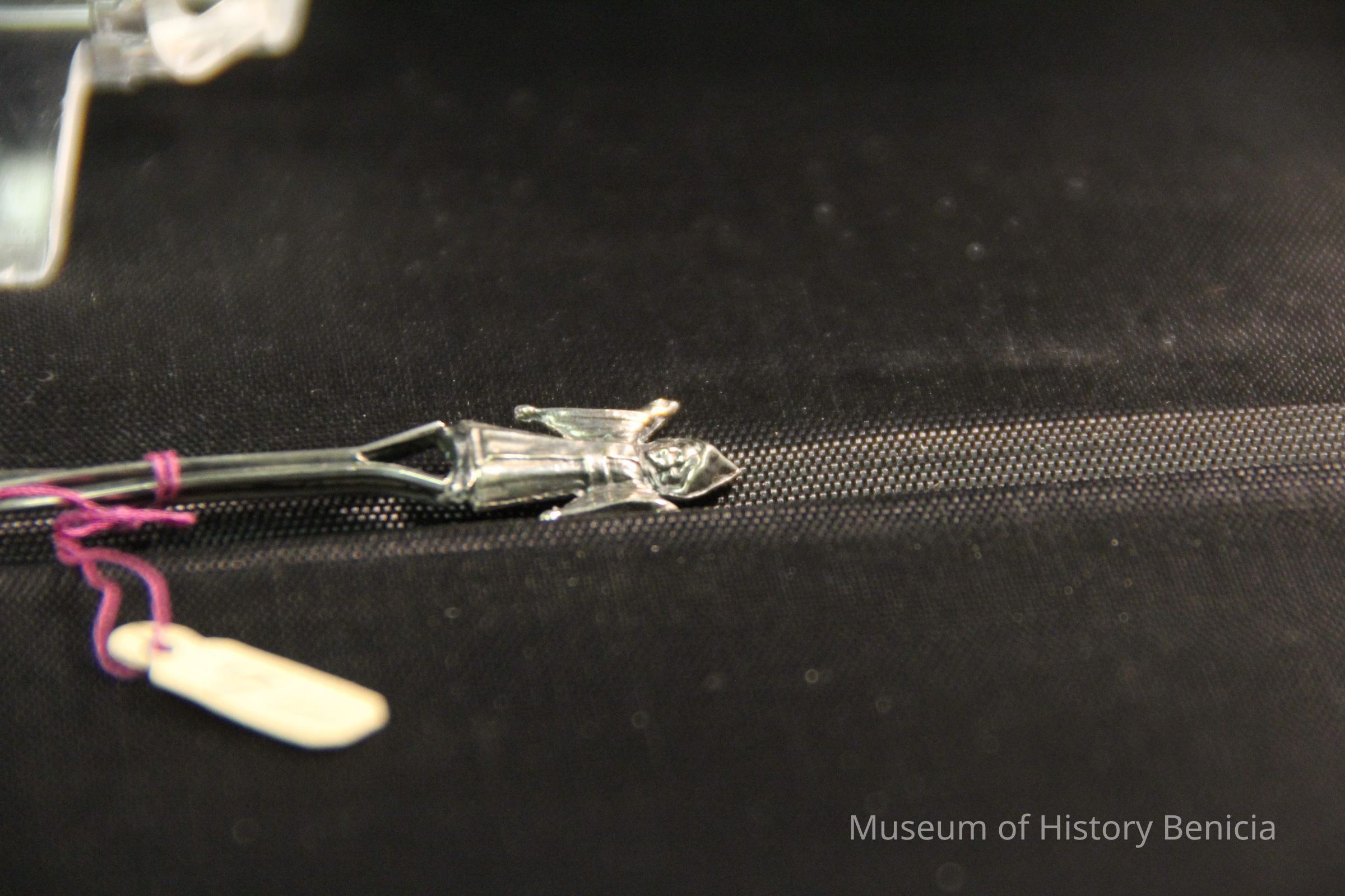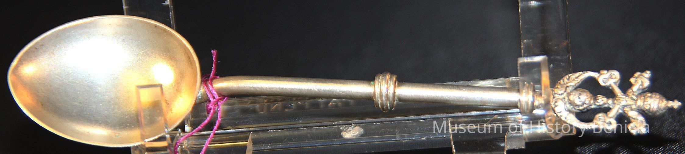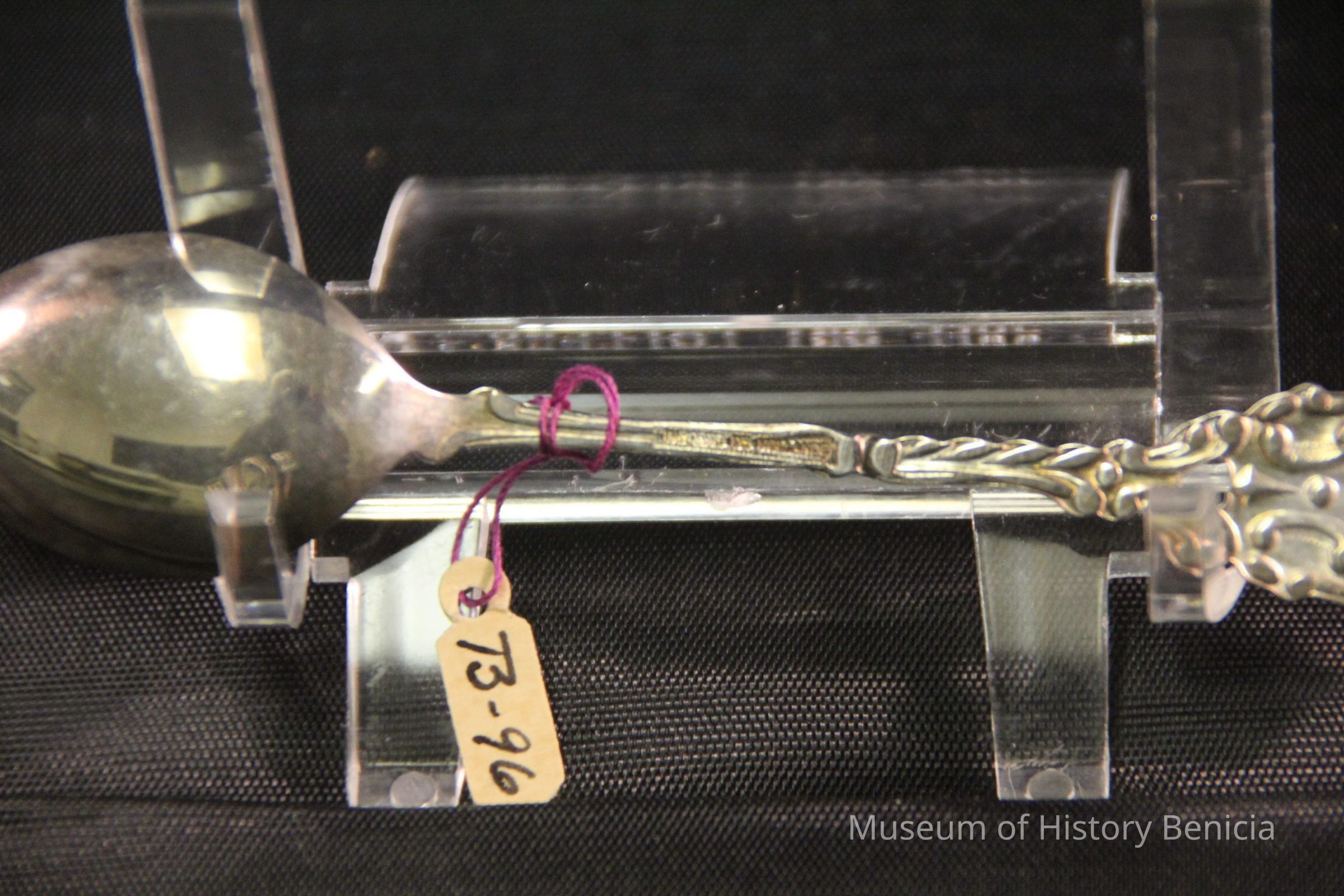 Souvenir spoon from Myrtle Mann collection. This spoon has a figure on the handle holding two keys and a basket with a cross on top.