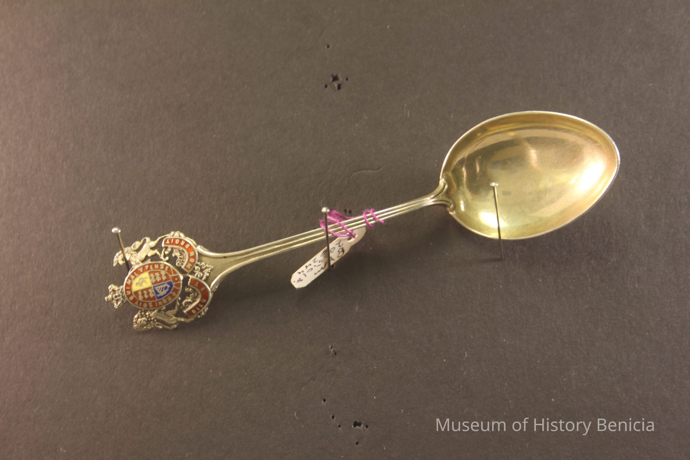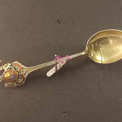 Souvenir spoon from Myrtle Mann collection. This spoon is from Great Britain. It has the Royal Coat of Arms on the handle with the motto "Honi Soit Qui Mal y Pense" (Shame be to him who thinks evil of it). This is the motto of the British Order of the Garter. It is 4.00" long.