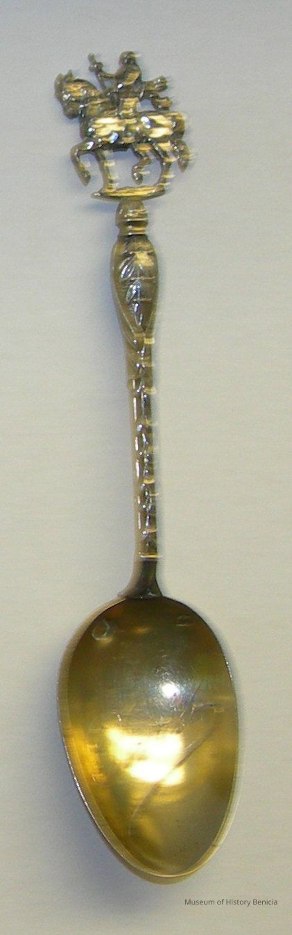 Silver spoon from Paris. A figure of Charlemagne riding on horseback is on the top of the handle.