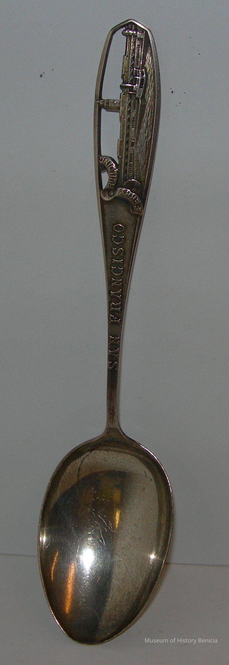 Souvenir spoon from Myrtle Mann collection. This spoon has a view of the San Francisco Ferry Building on top with the words "Ferry Building" and "San Francisco" below. On the back it says sterling and has three metal proof marks.