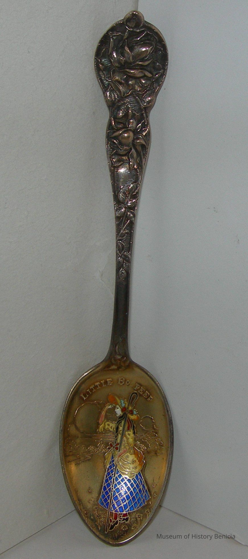 Souvenir spoon from Myrtle Mann collection. This spoon has flowers on the handle. The spoon has an enamled picture of a shephard girl with the words "Little Bo Peep" above it. The back says "sterling". It also has the initials "RSC".Collection
