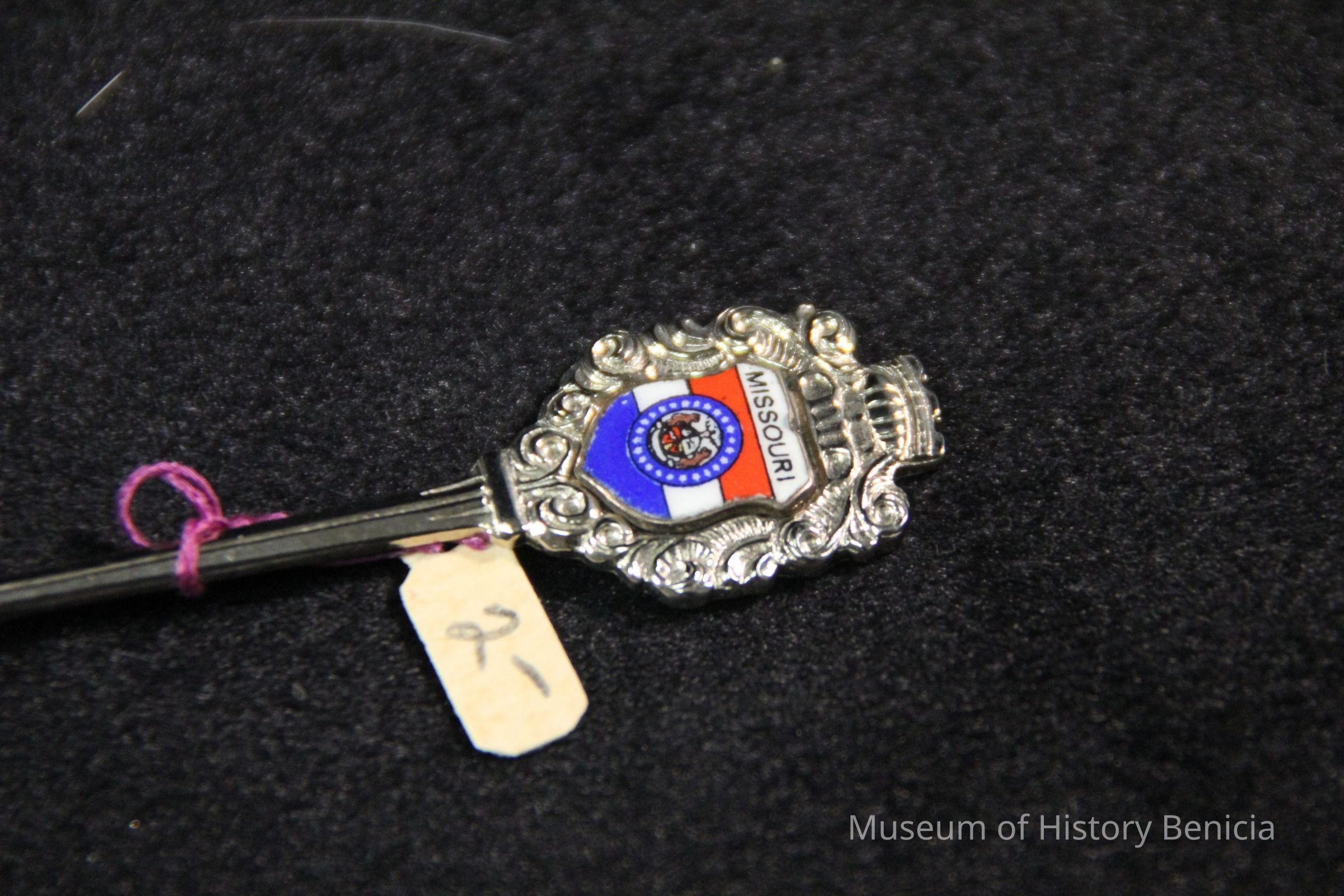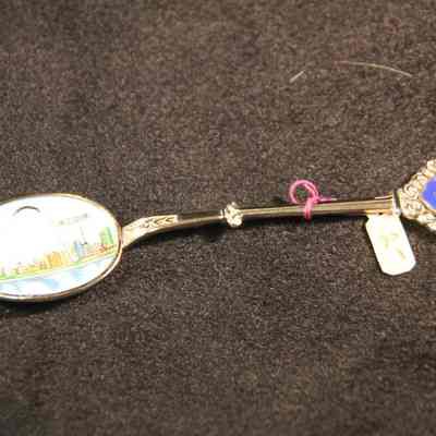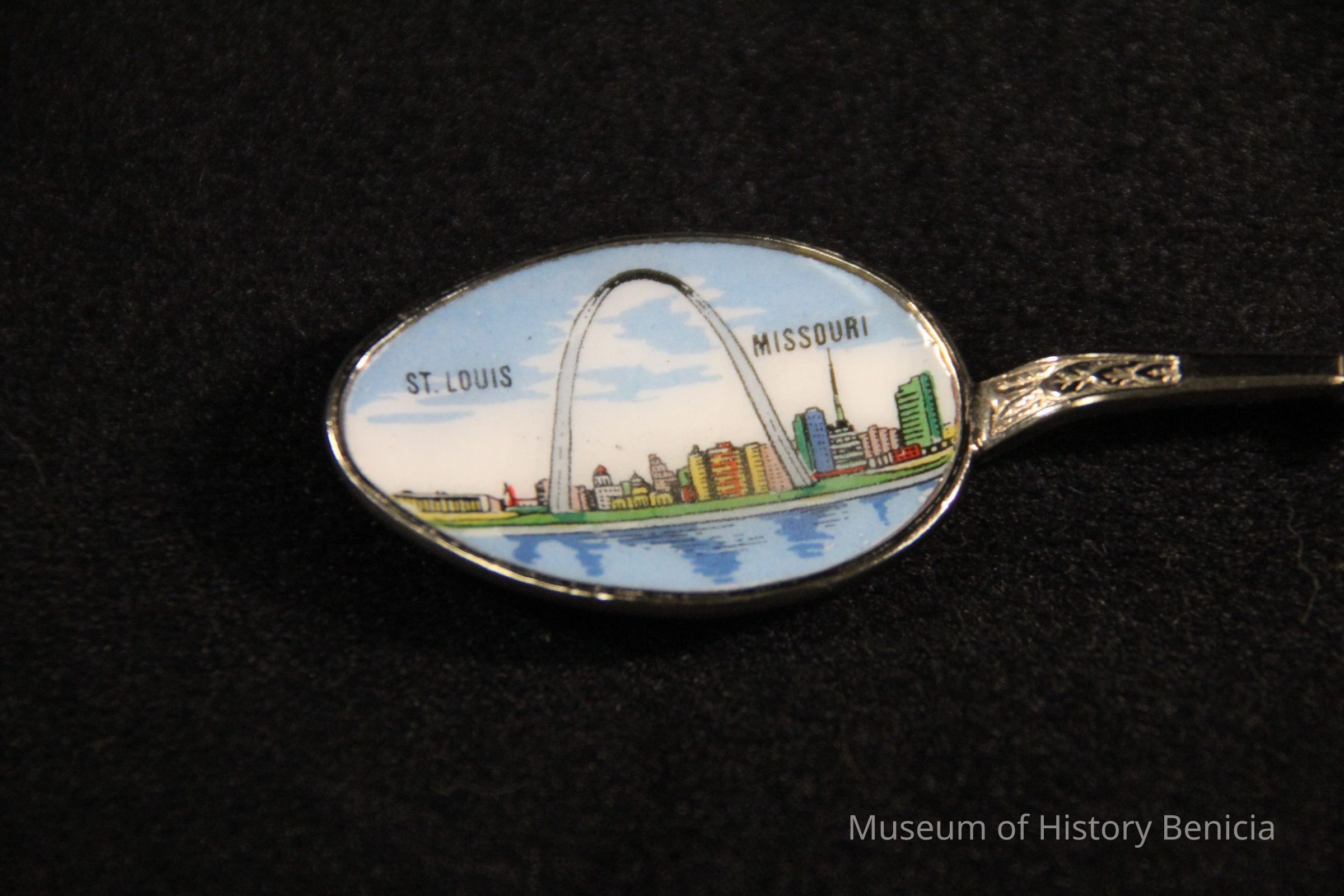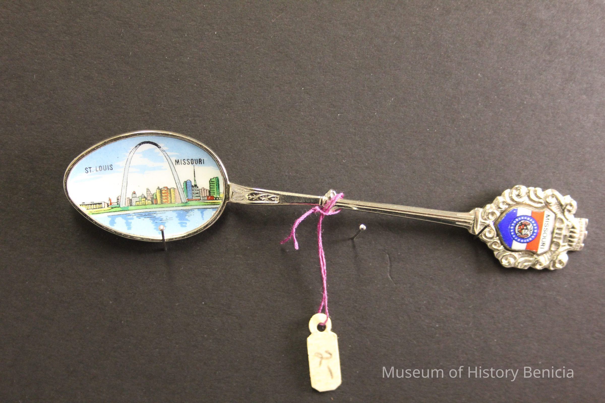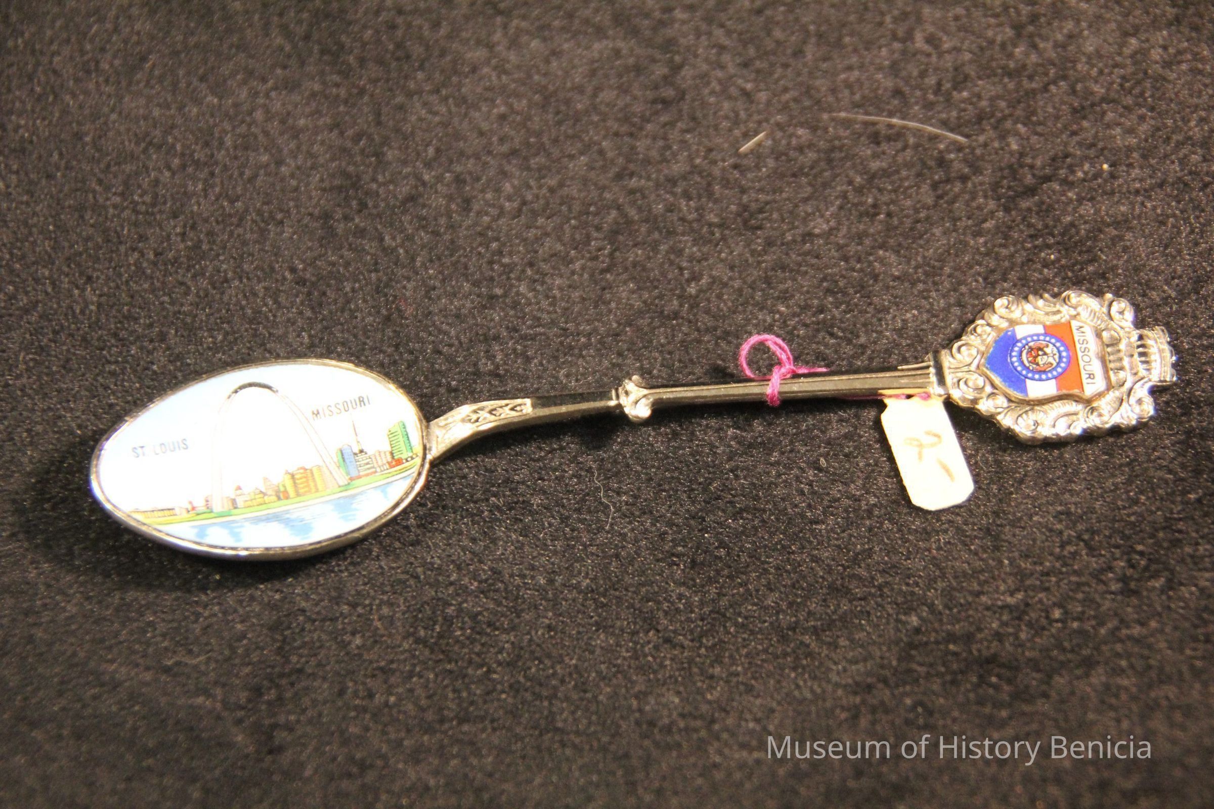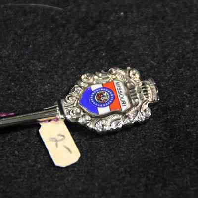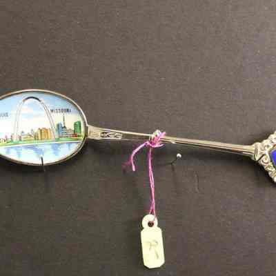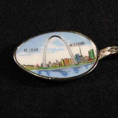 Souvenir spoon from Myrtle Mann collection. This spoon has "St. Louis Missouri and the arch" in the bowl. The end has scrolls and the word "Missouri". It is 4.5" long.
