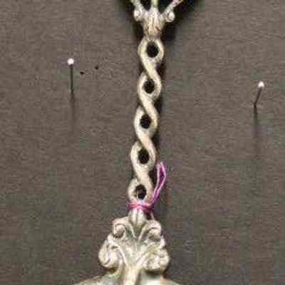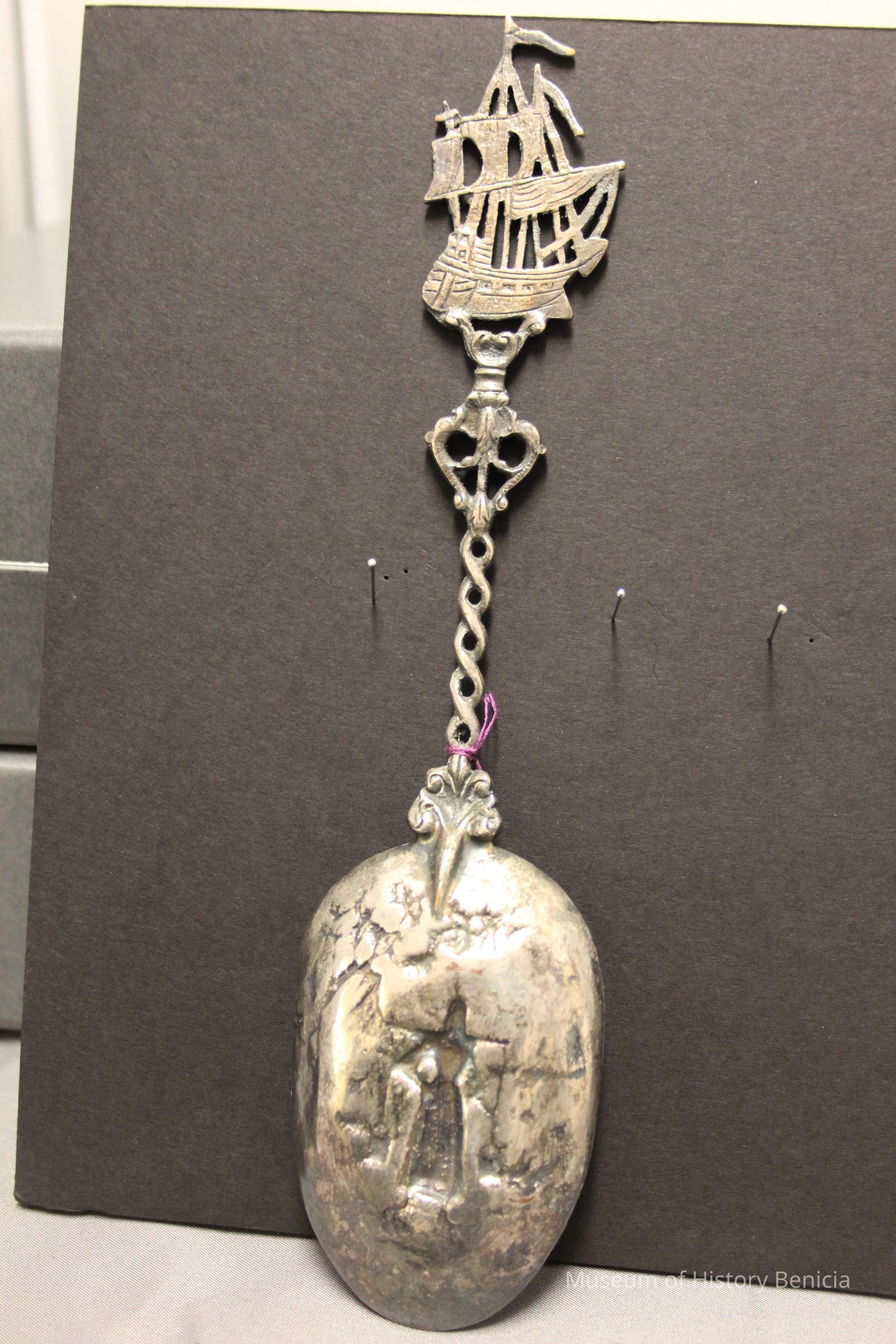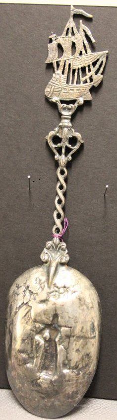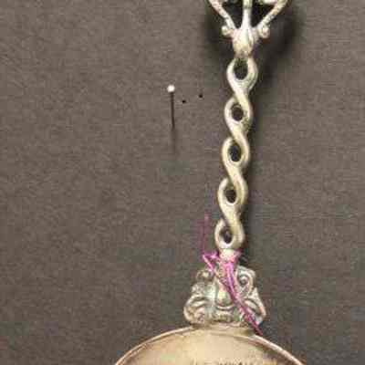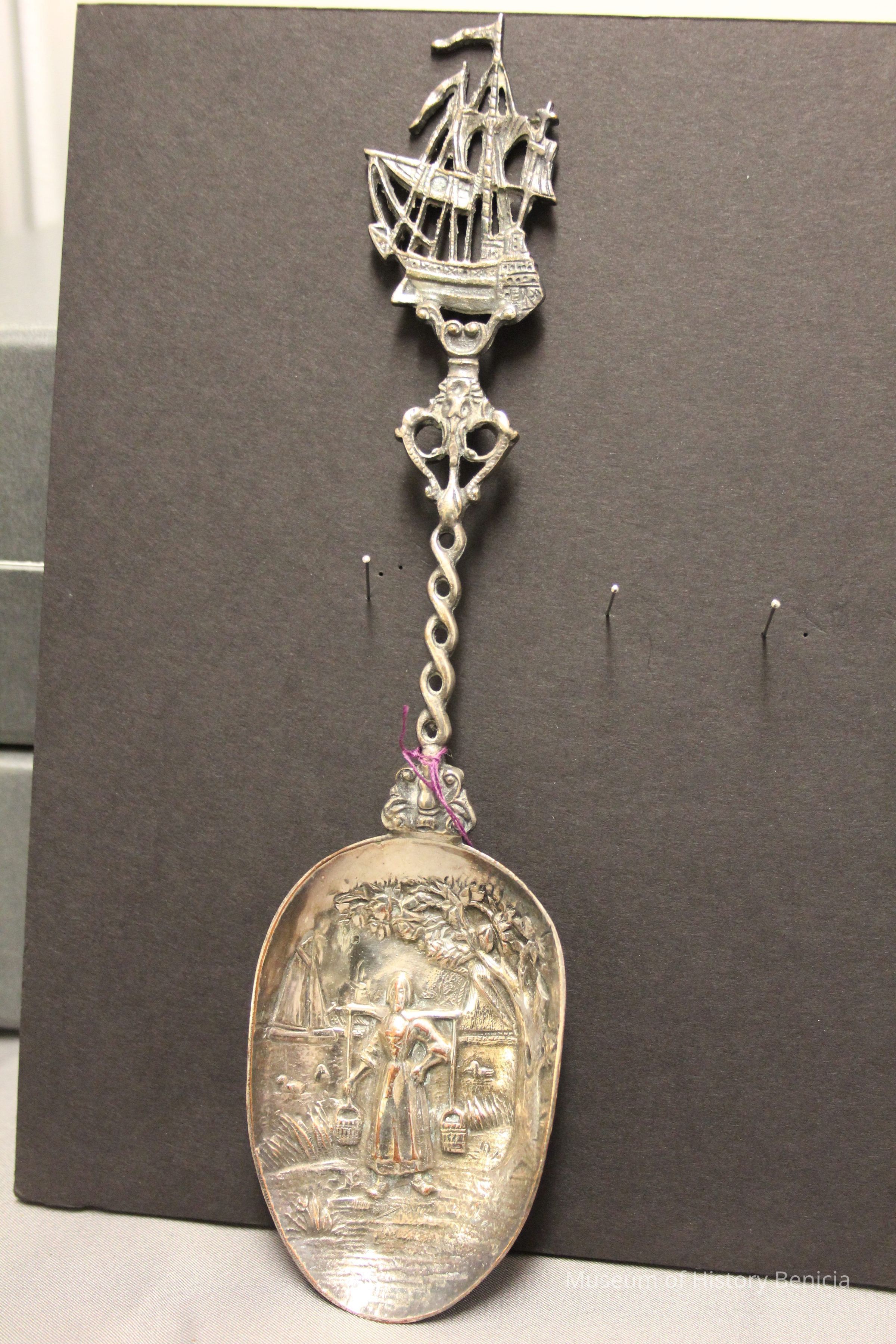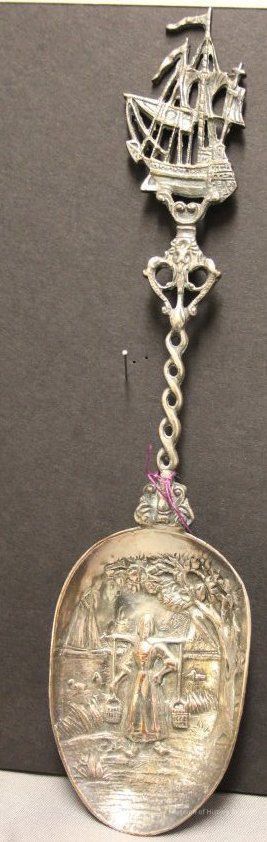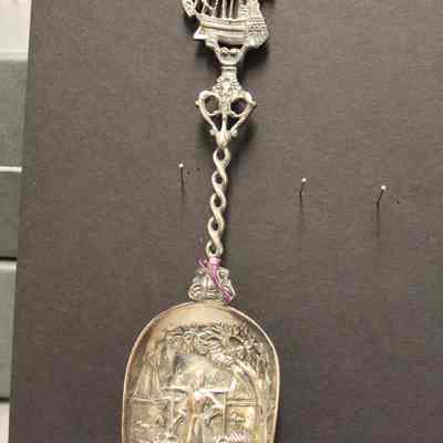 Souvenir spoon from Myrtle Mann collection. This spoon has a woman carrying water pails in the bowl, twisted design on the shaft and a large sailing ship at the end of the handle. It is 9.0" long.