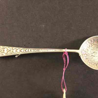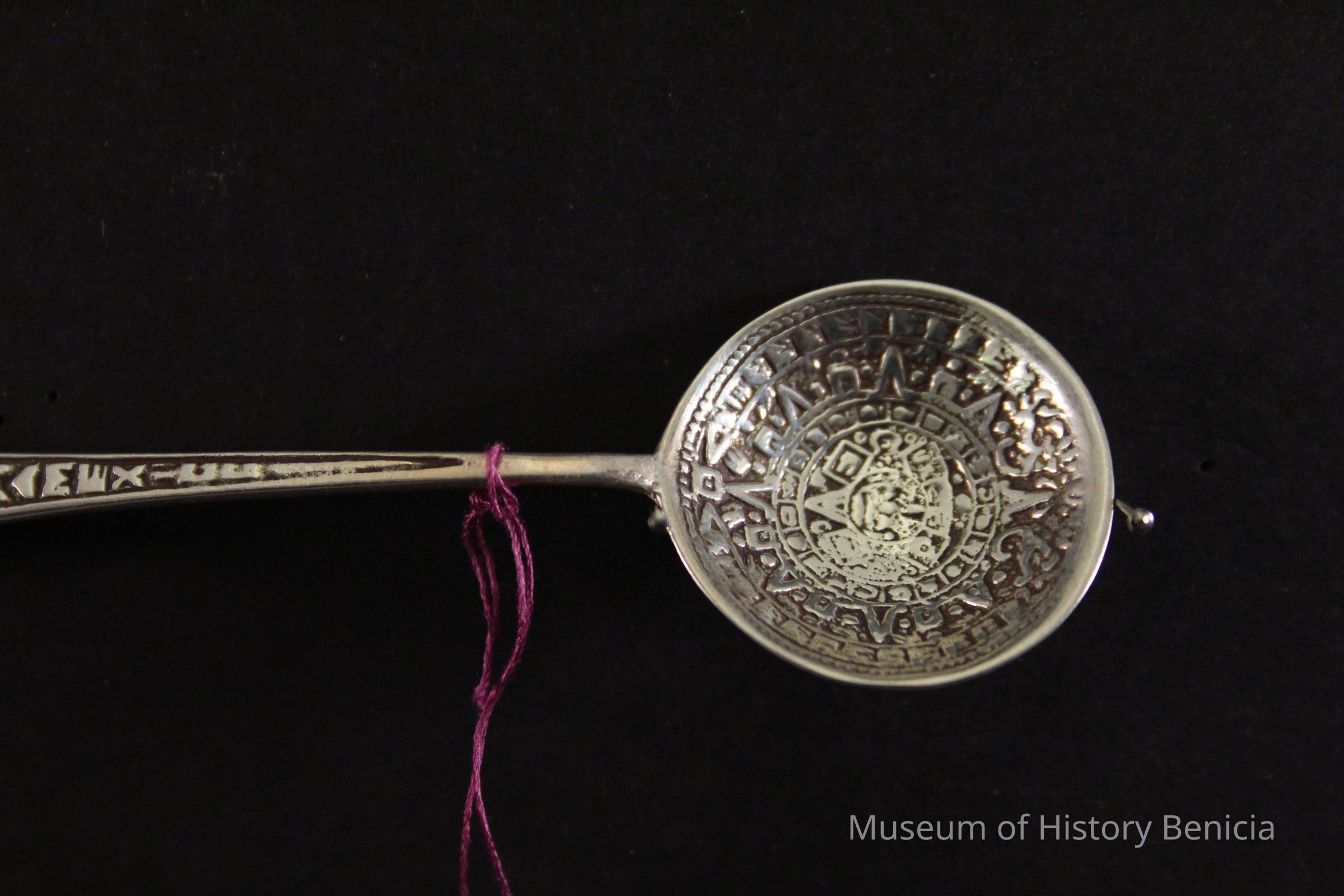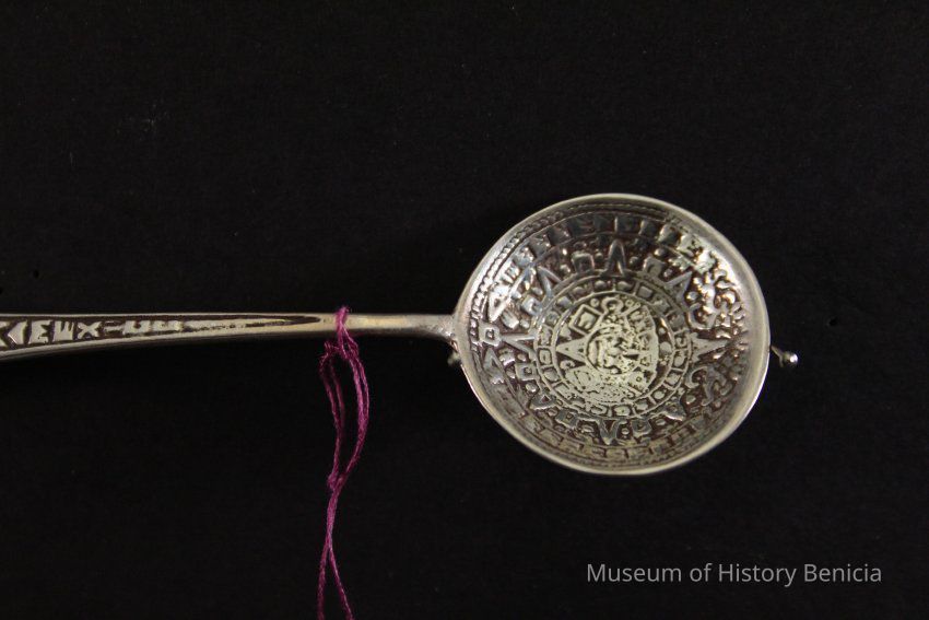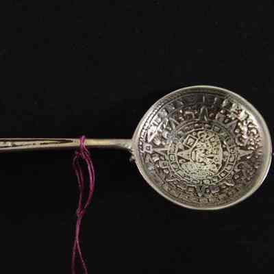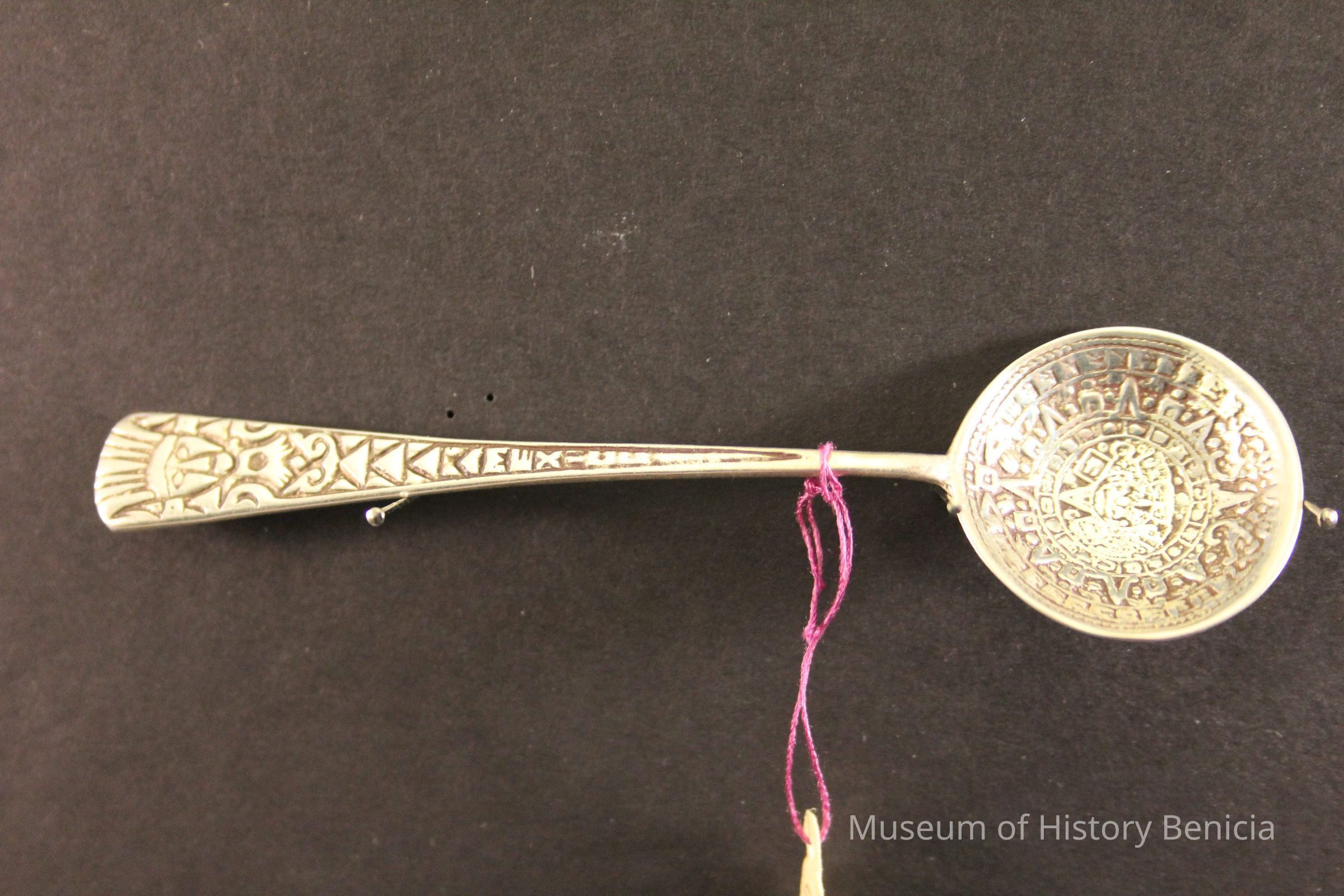 Souvenir spoon from Myrtle Mann collection. This spoon is from Mexico. It has an Aztec figure on the handle. The bowl has a design in it. It is 4." long.