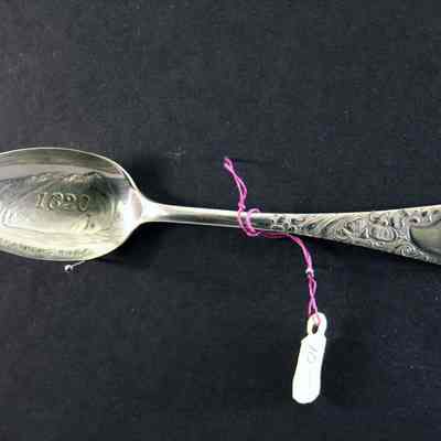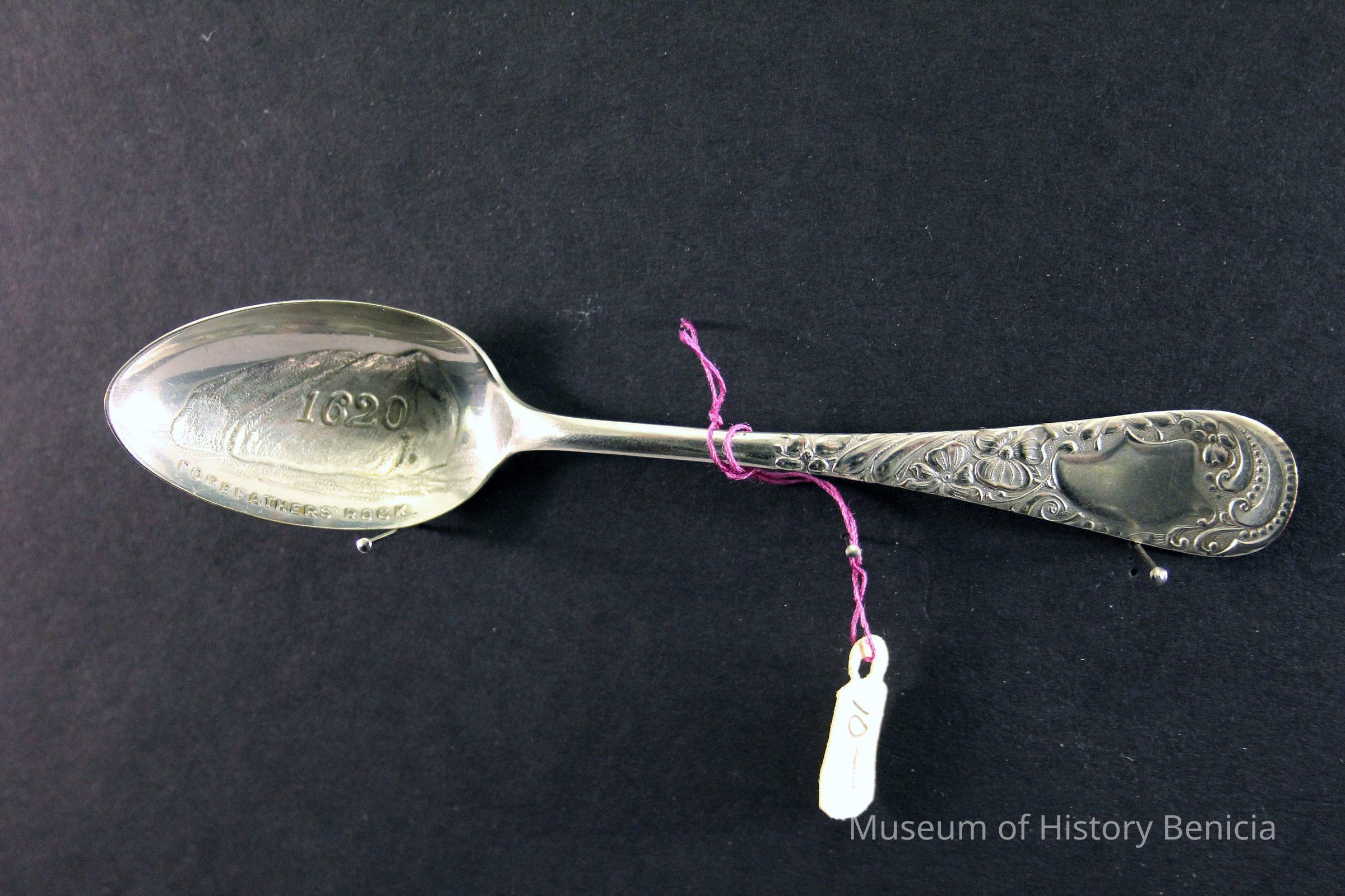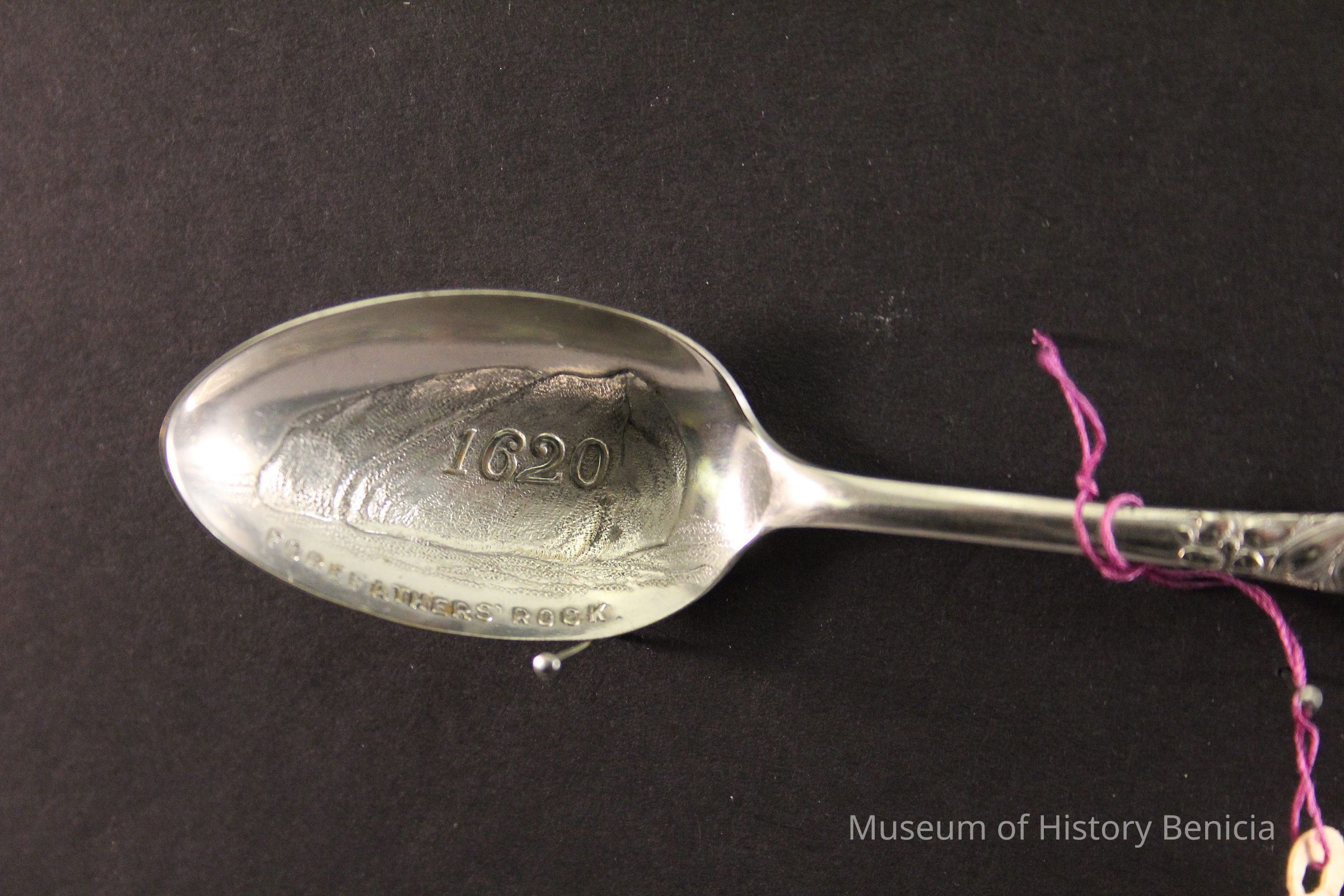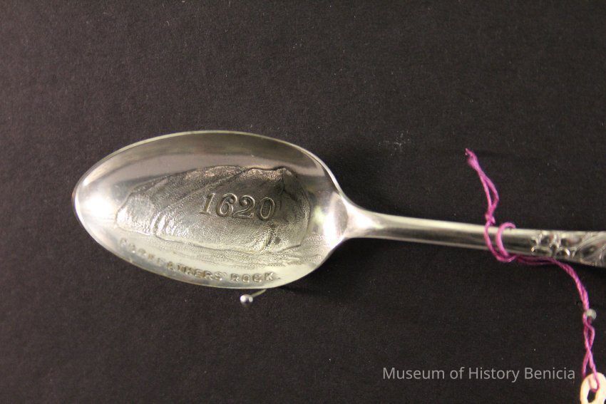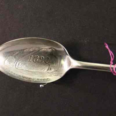 Souvenir spoon from Myrtle Mann collection. This spoon is from Forefather's rock, Mass. It has a view of the rock and the date 1620 in the bowl. The handle is scroll work.. It is 4.25." long.