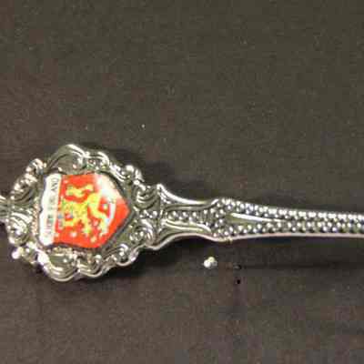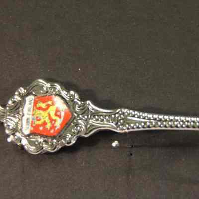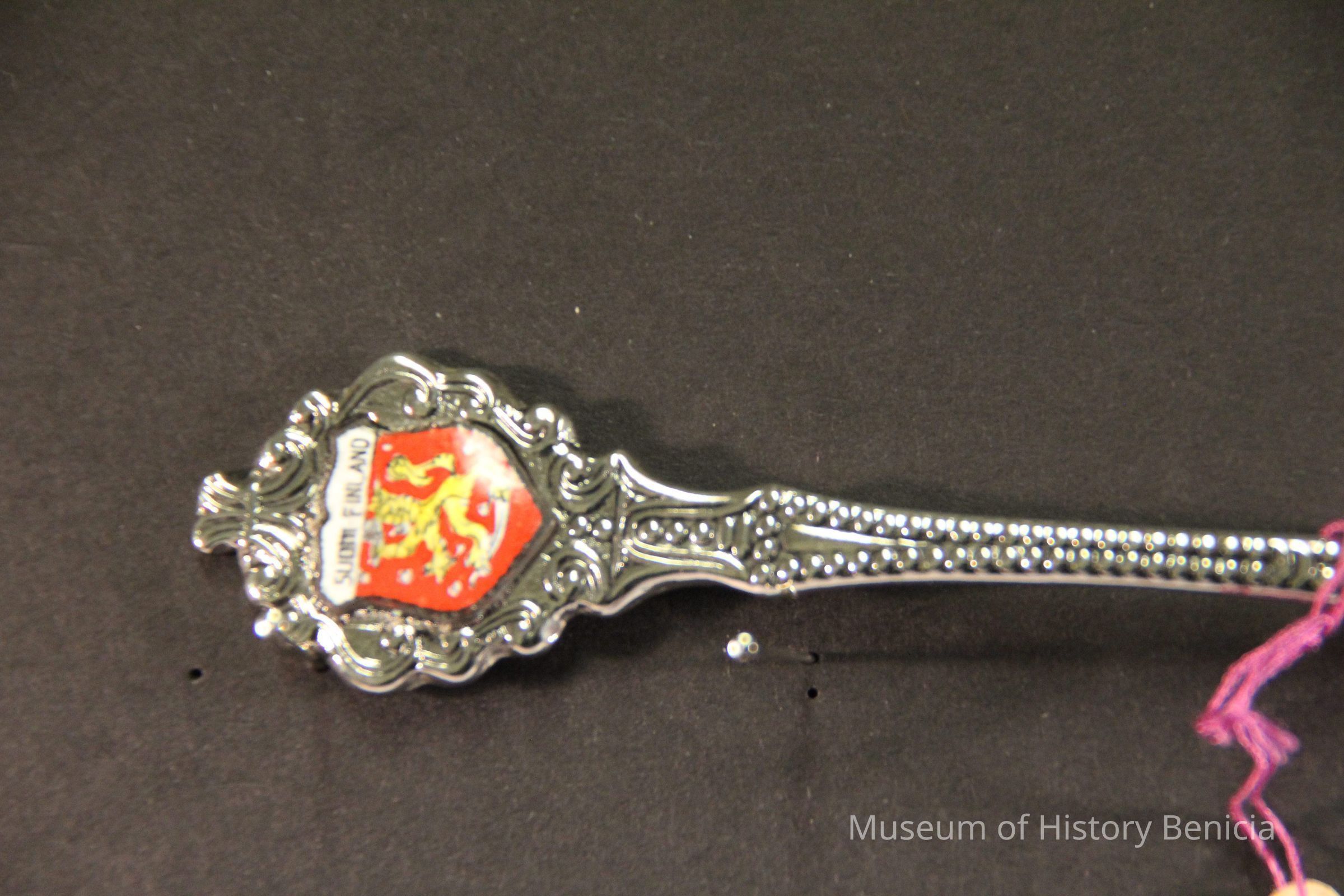 Souvenir spoon from Myrtle Mann collection. This spoon is from Finland. It has a shield and lion crest on end with the words "Sudmi Finland". The handle is beaded. It is 4.75." long.