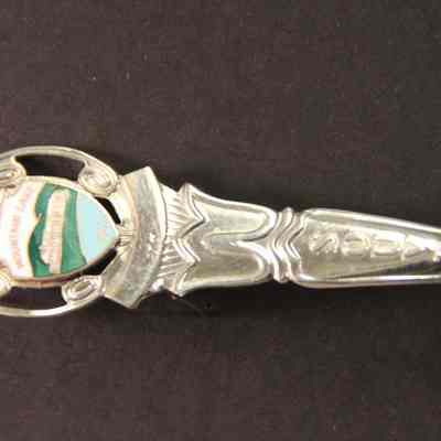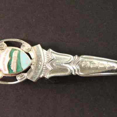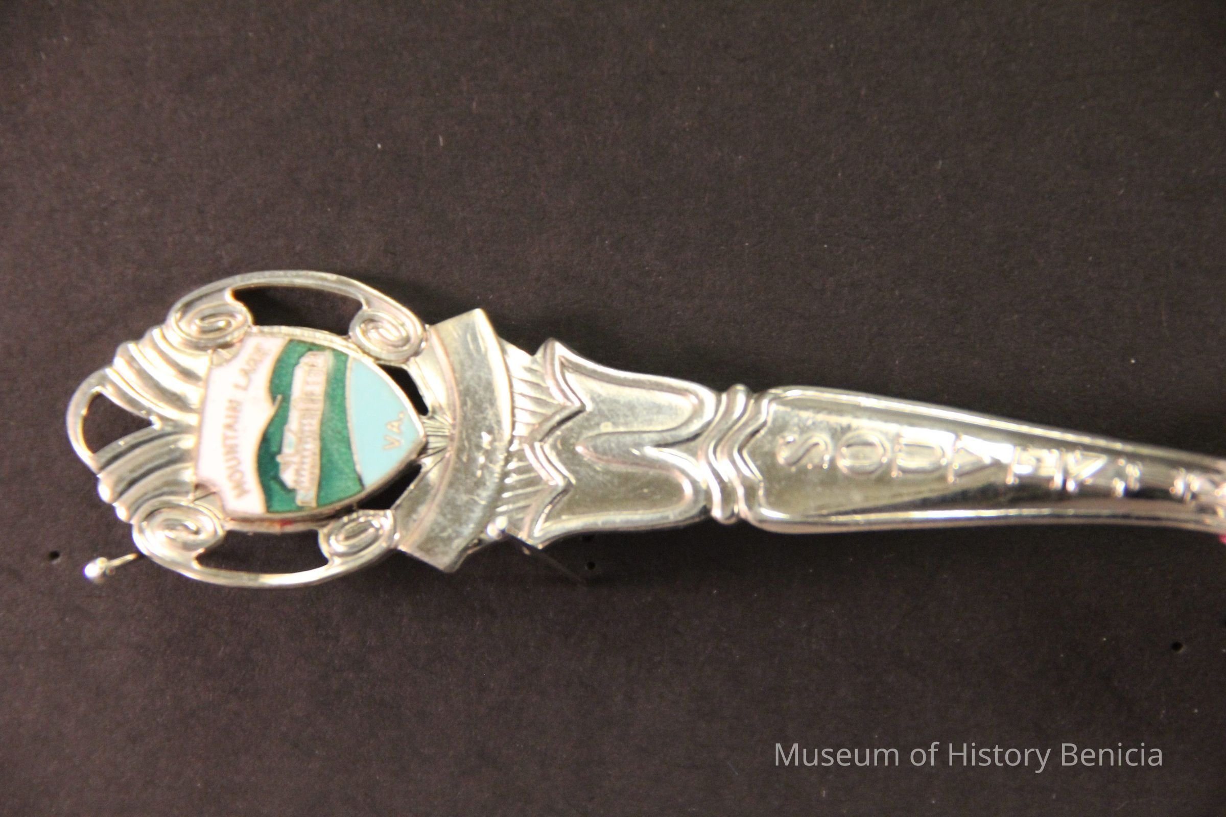 Souvenir spoon from Myrtle Mann collection. This spoon is from Moutain Lake VA.. It has those words on end and the word "Souvenir" on the handle. There is an enameld design on the end of the spoon showing a hotel. It is 4.50." long.