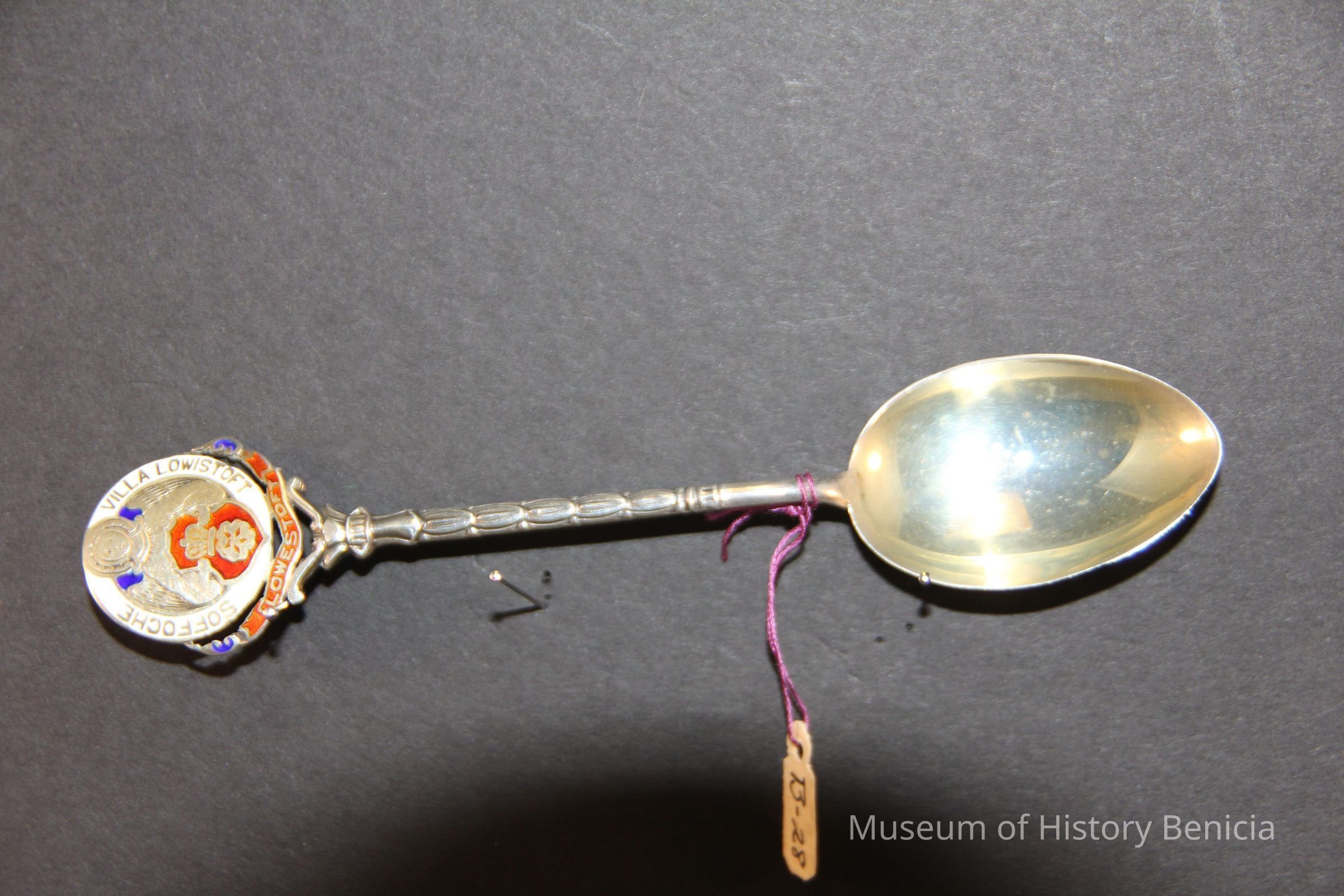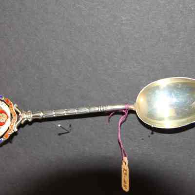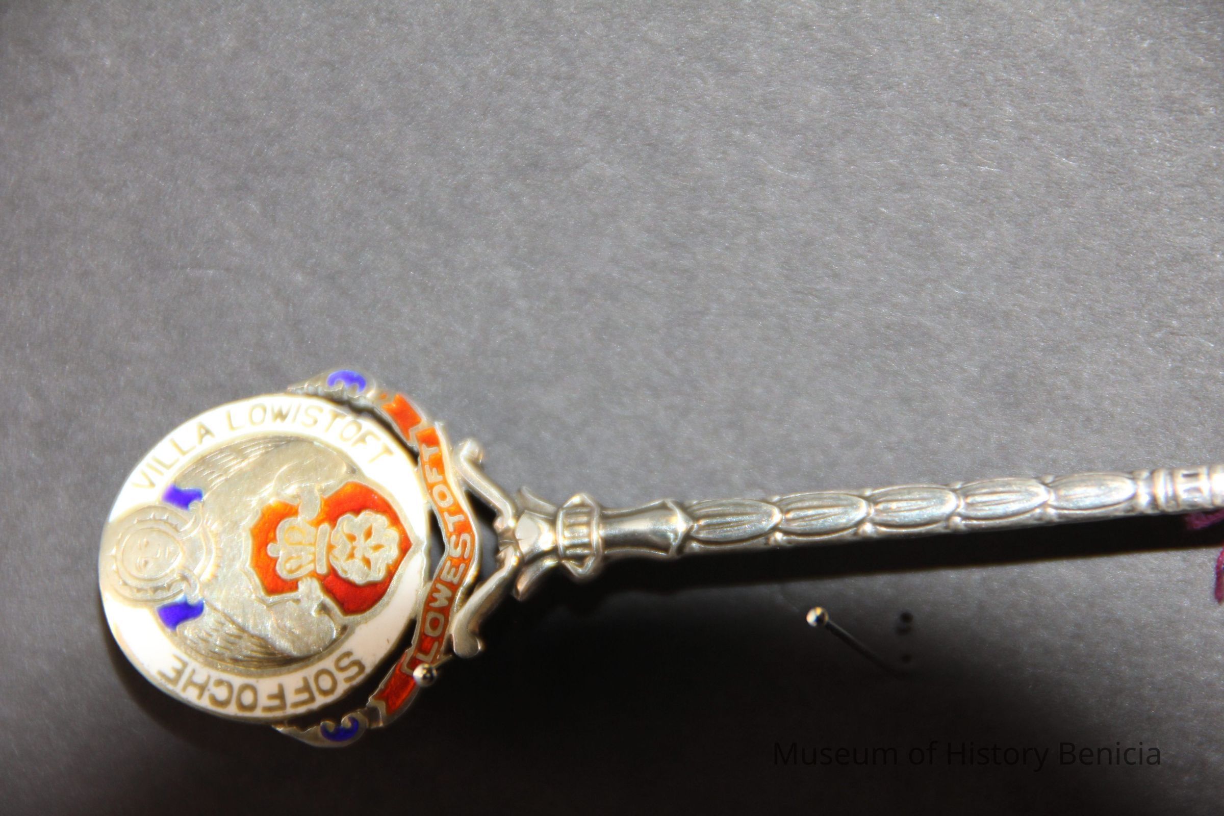 Souvenir spoon from Myrtle Mann collection. This spoon is from Soffoche Villa Lowistoft. It has those words on end of the handle. There is an enameld design on the end of the spoon showing an angel and a crown. It is 5.0." long.