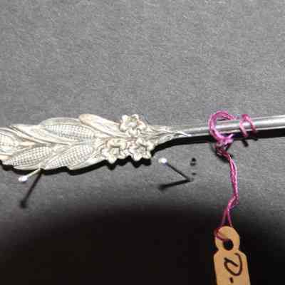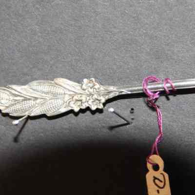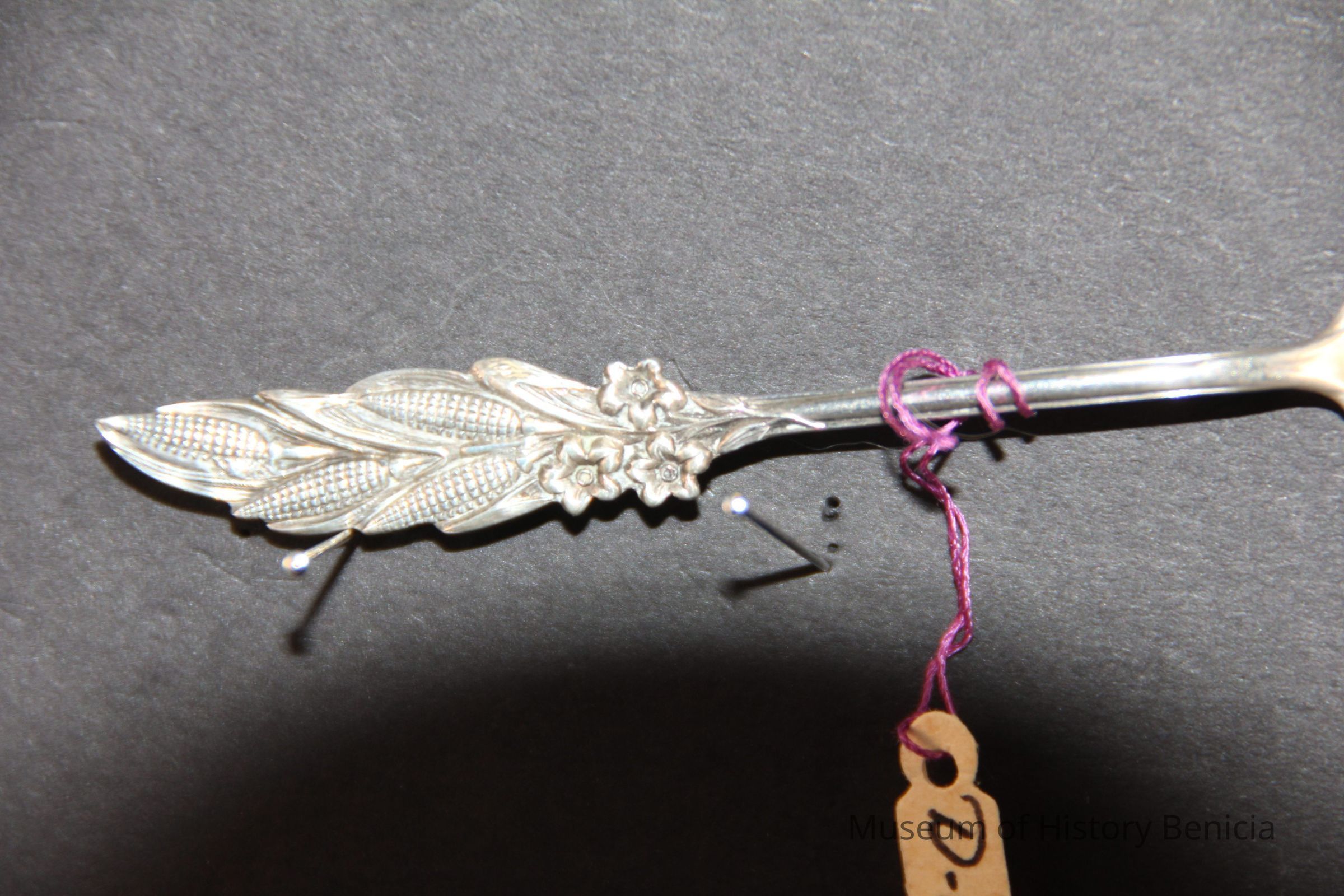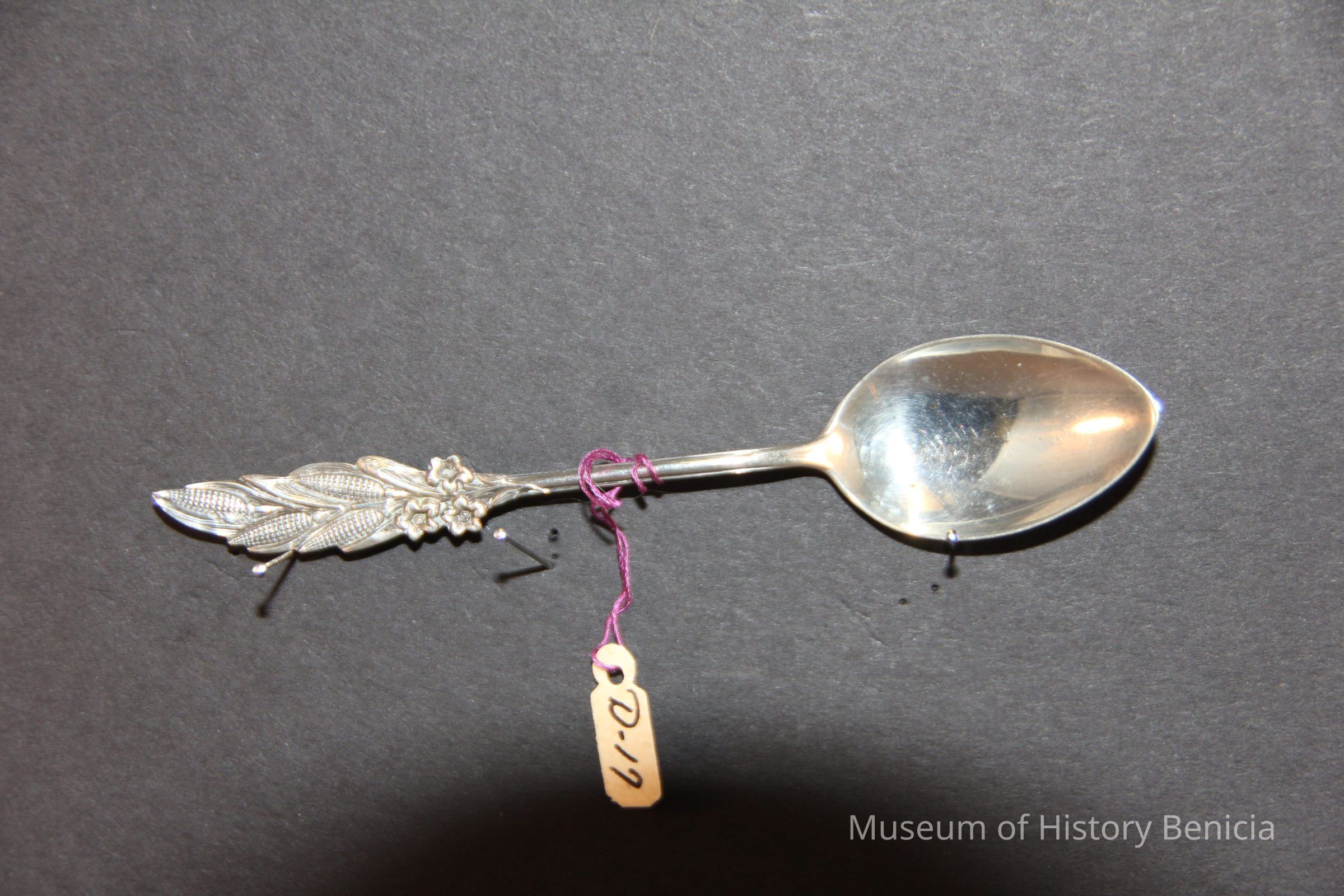 Souvenir spoon from Myrtle Mann collection. This spoon is unidentified. It has corn ears and flowers on the stem. It is 4.25" long.
