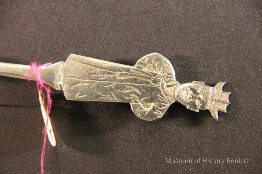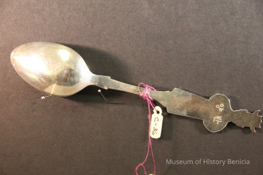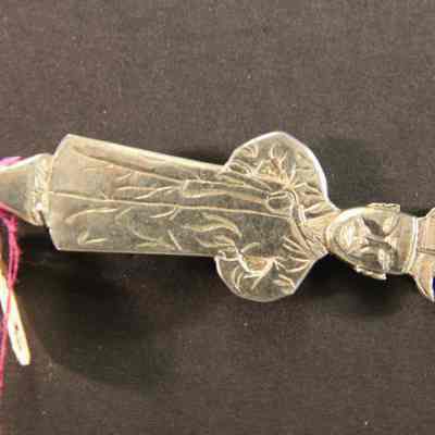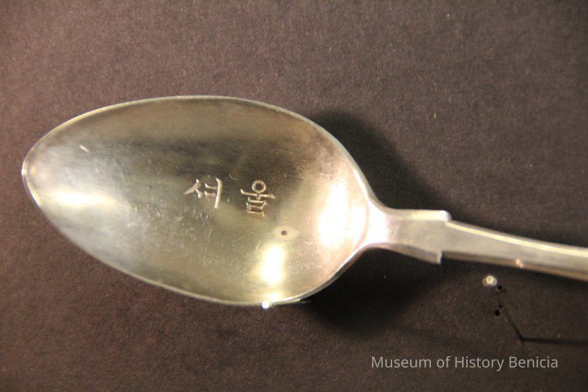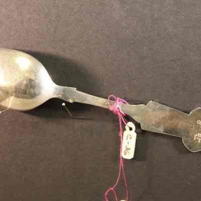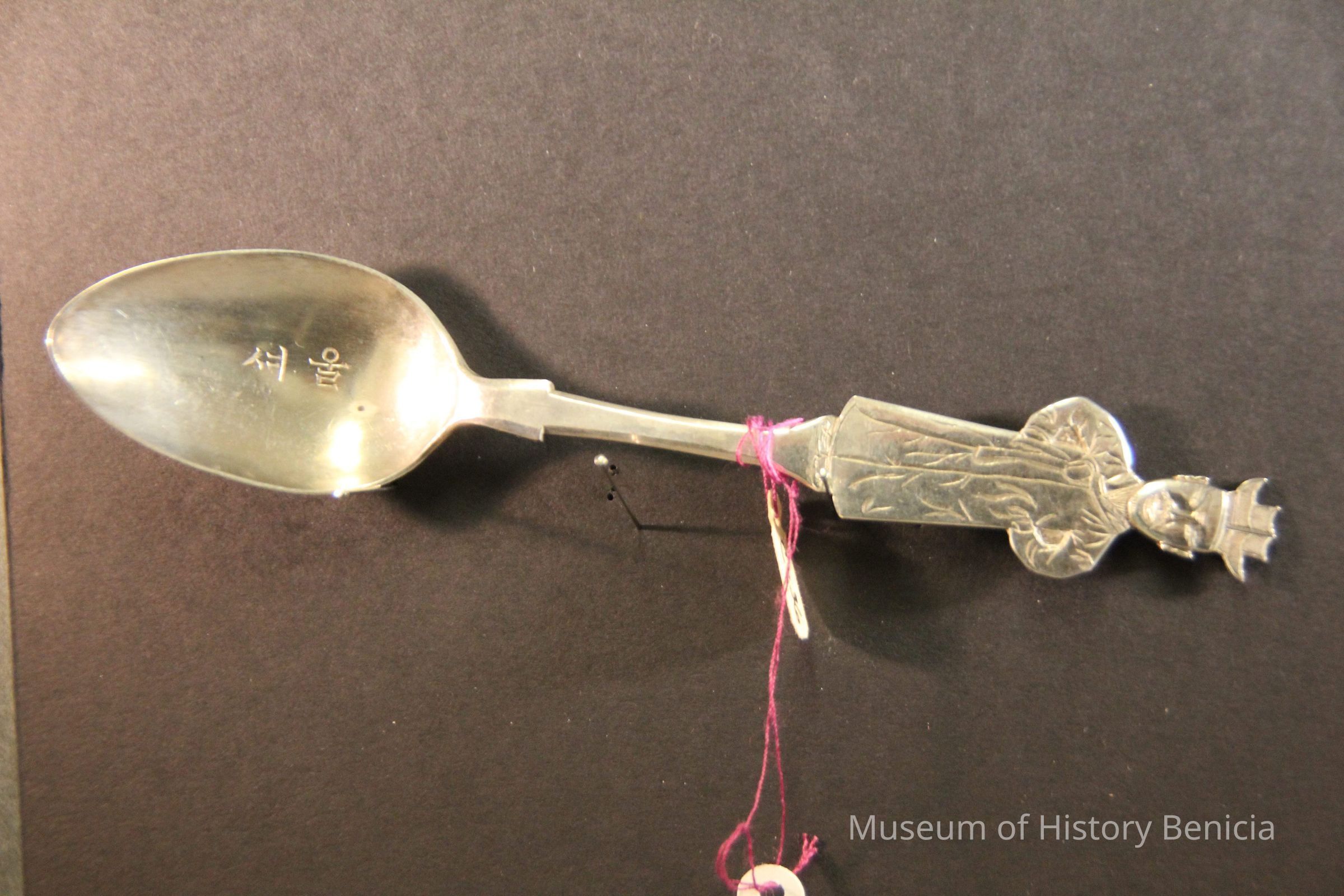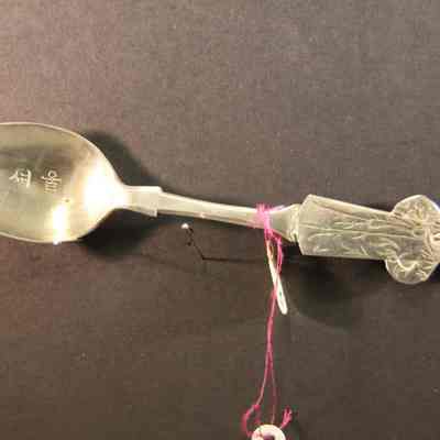 Souvenir spoon from Myrtle Mann collection. This spoon is from Korea. It has an image of a man dressed in robes and wearing a pointed hat on the end of the spoon. There are two Chinese characters in the bowl and several on the reverse. It is 6.00" long.