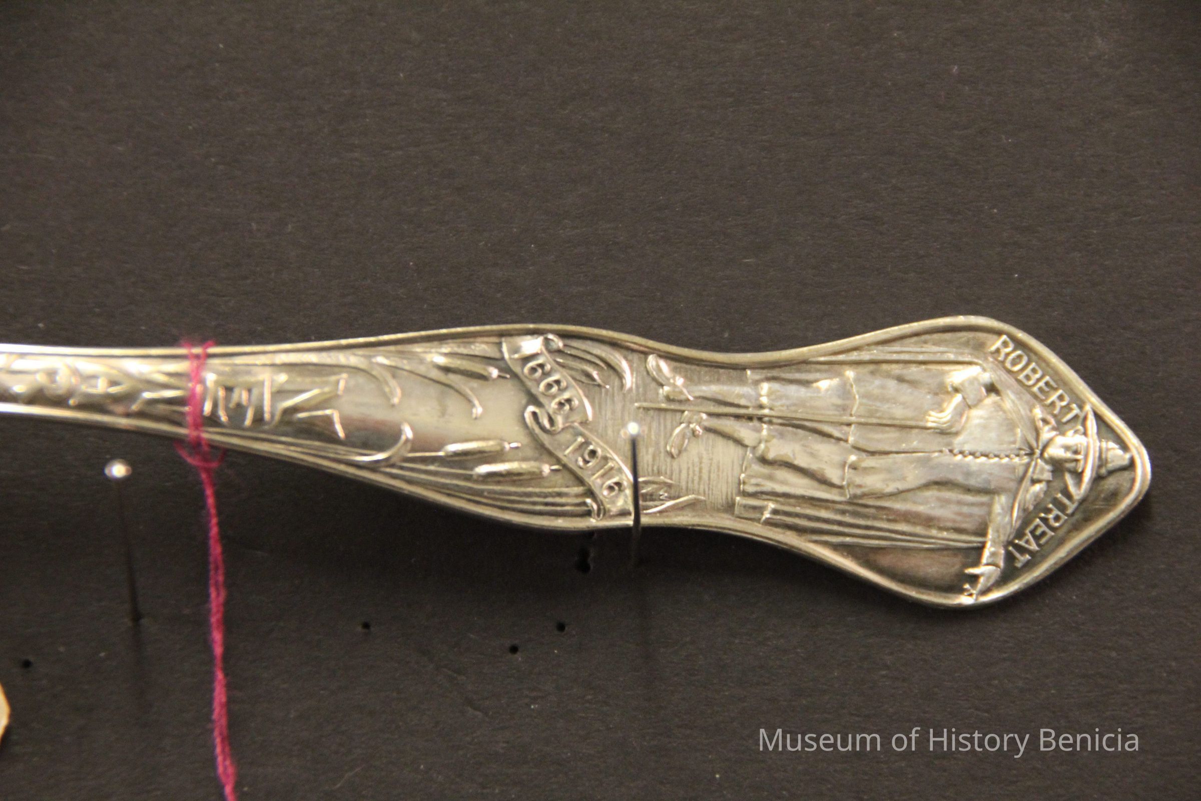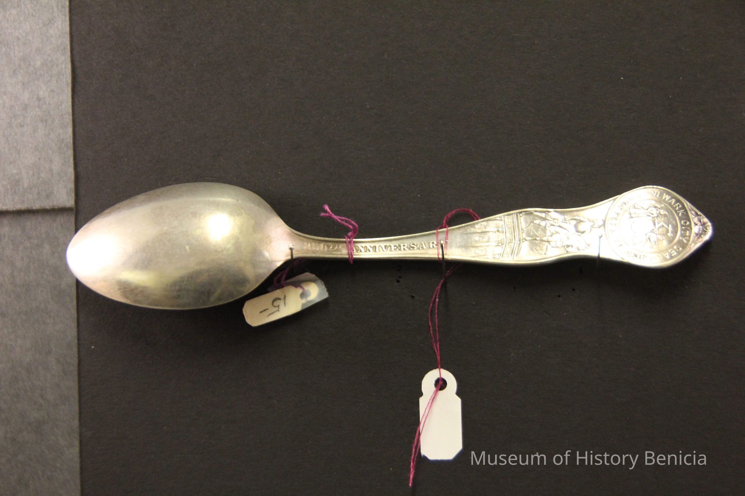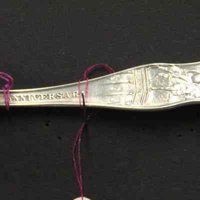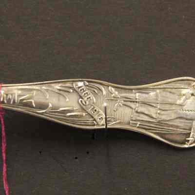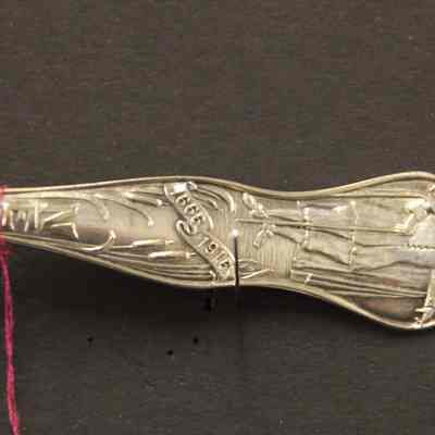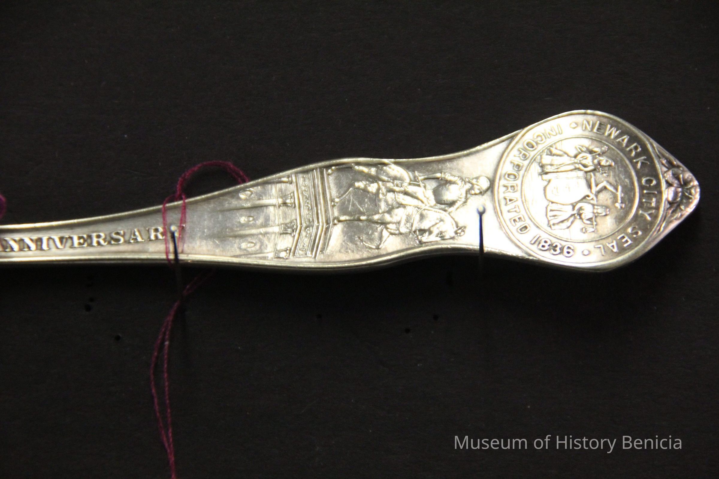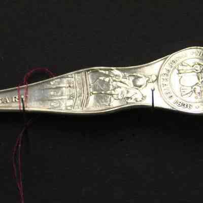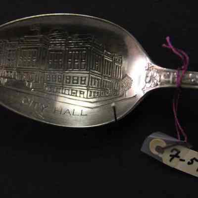 Souvenir spoon from Myrtle Mann collection. This spoon is from Newark New Jersey. There is a seal on the end and the words New Jersey on the stem. It commemerates the 250th anniversary of the founding of the city. The bowl shows an engraving of the city hall. It is 6.00" long.