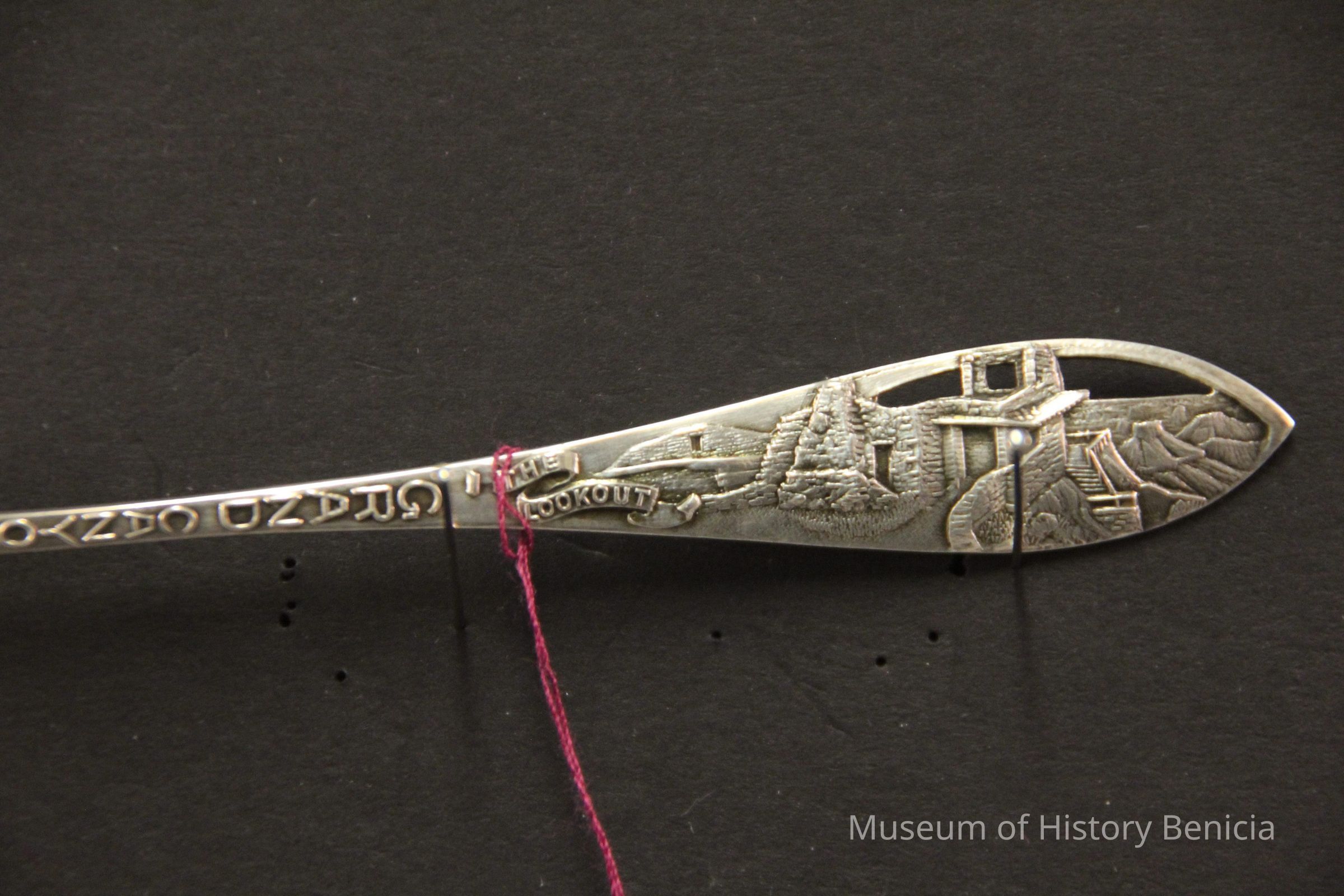 Souvenir spoon from Myrtle Mann collection. This spoon is from the Grand Canyon, Az. It says that on the stem and has a cut-out view of the lookout with the words "lookout" on the end. It is 6.00" long.