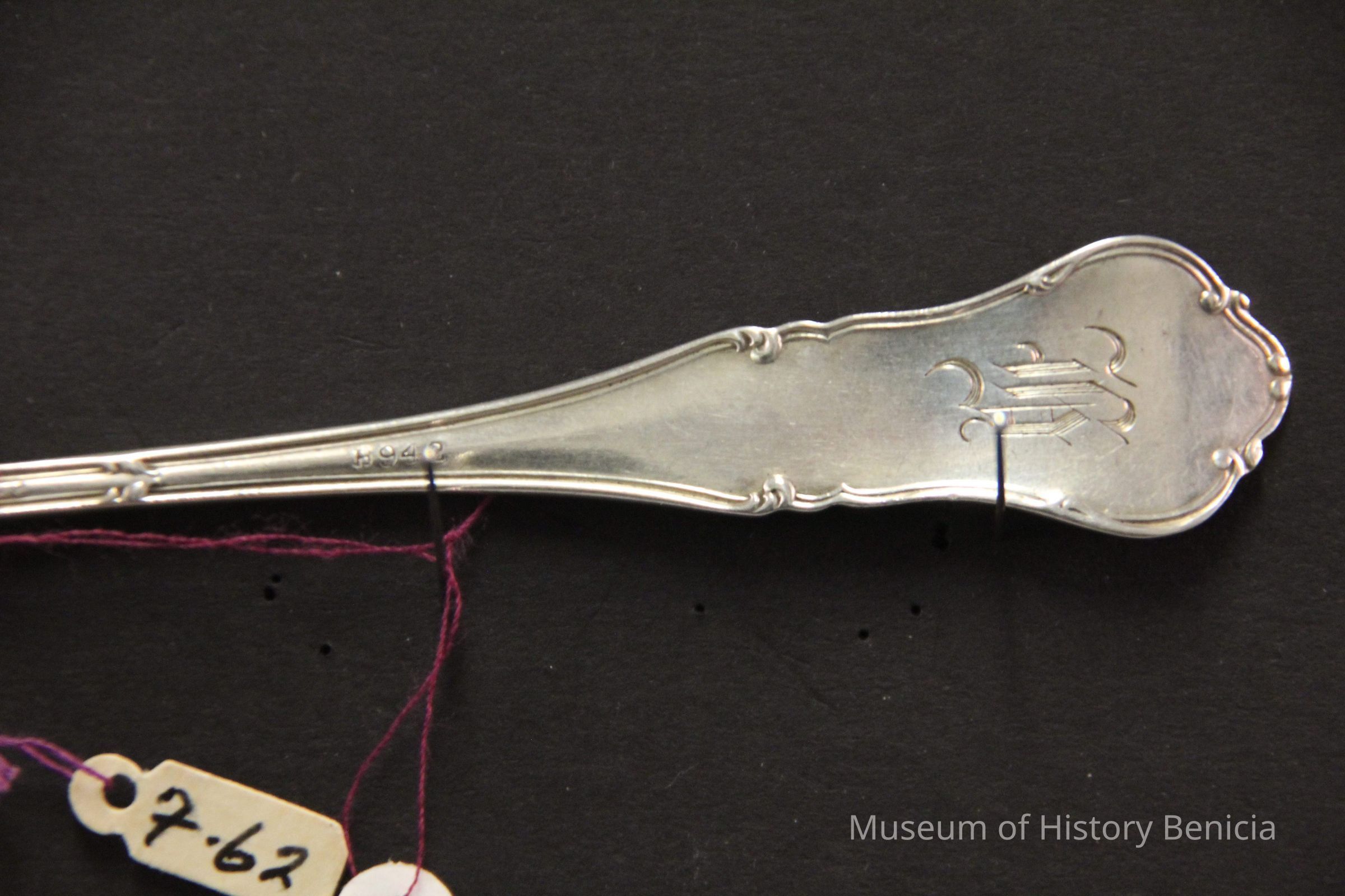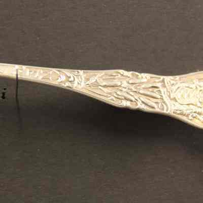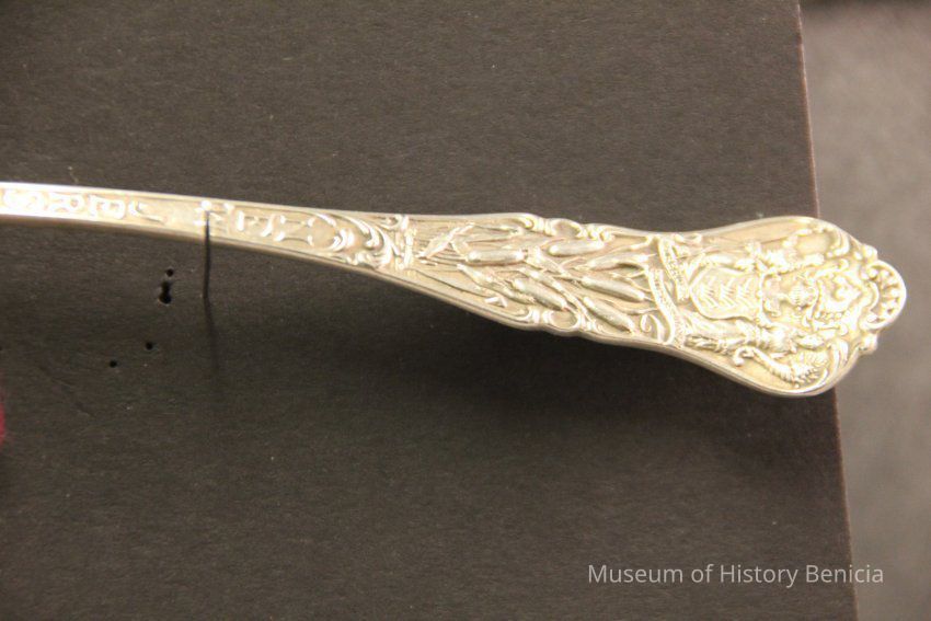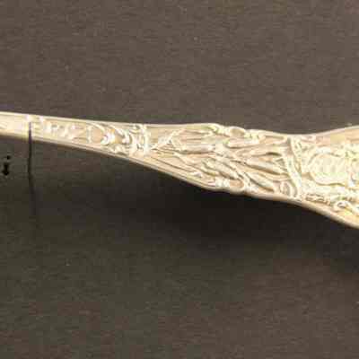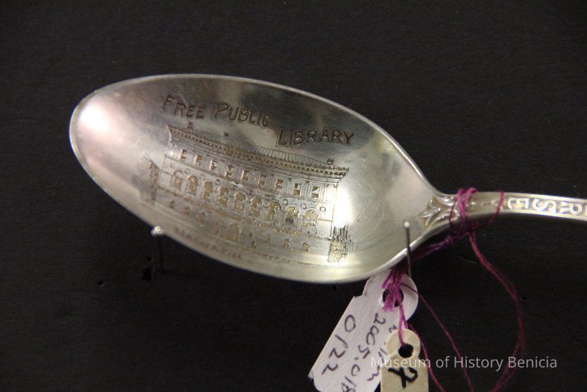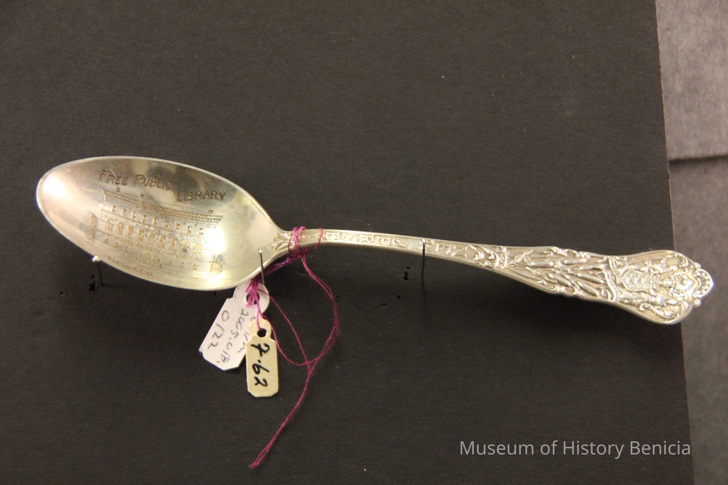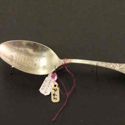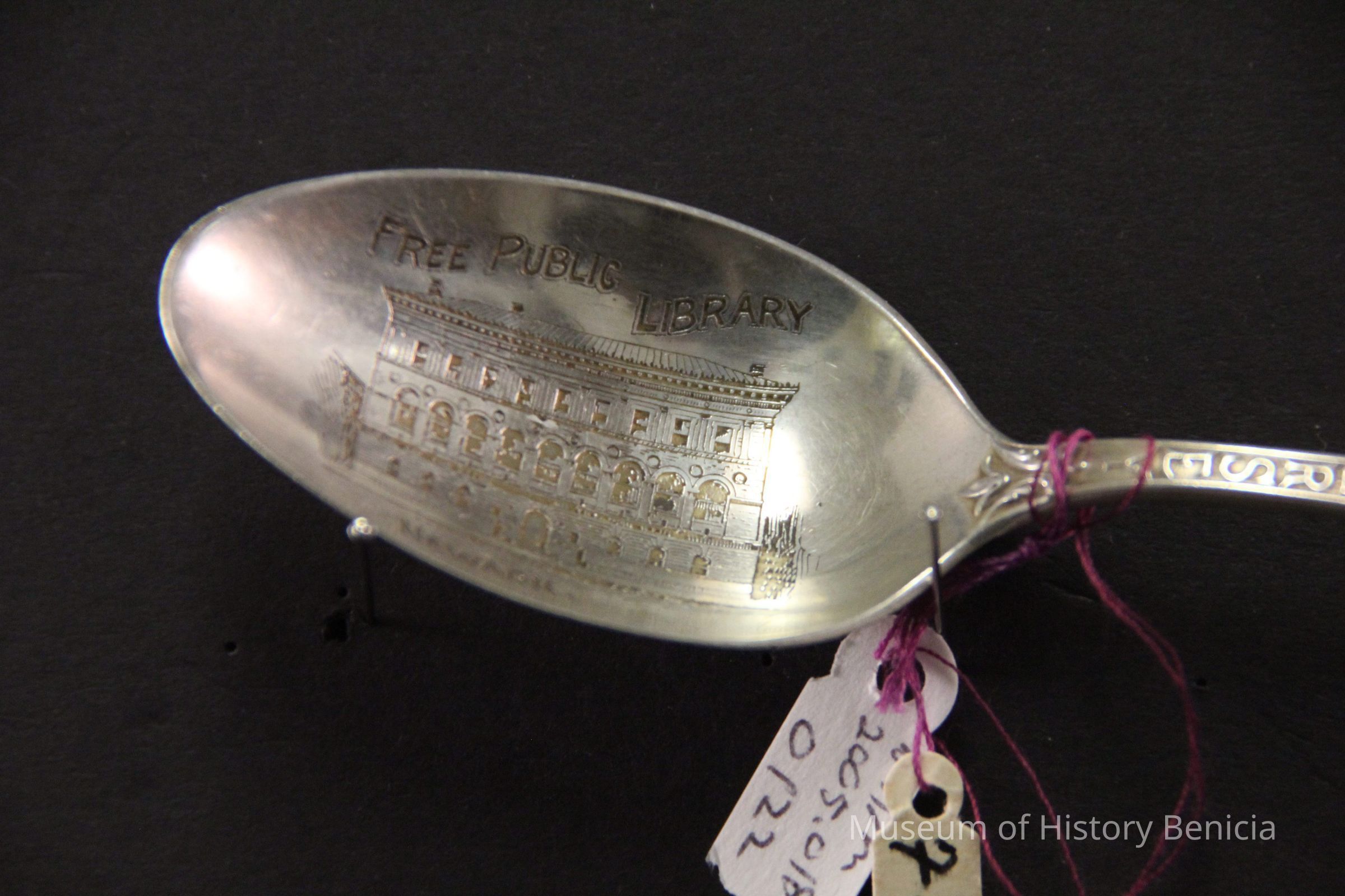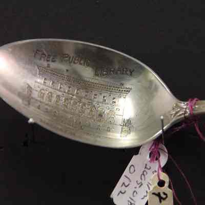 Souvenir spoon from Myrtle Mann collection. This spoon is from Newark New Jersey. There is a seal on the end and the words New Jersey on the stem. It commemerates the Free Public Library of Newark. The bowl shows an engraving of the library. It is 6.00" long.
