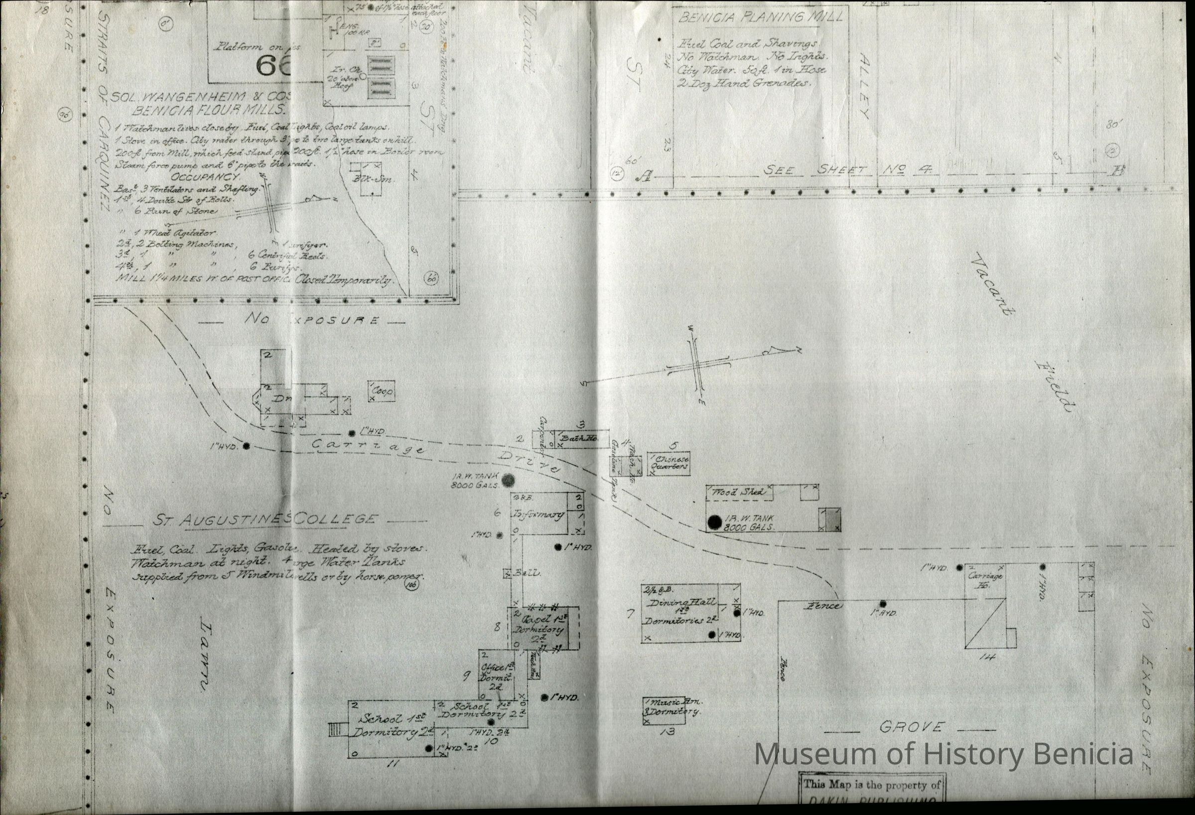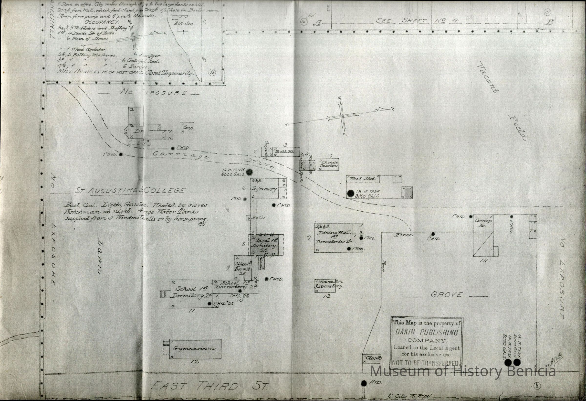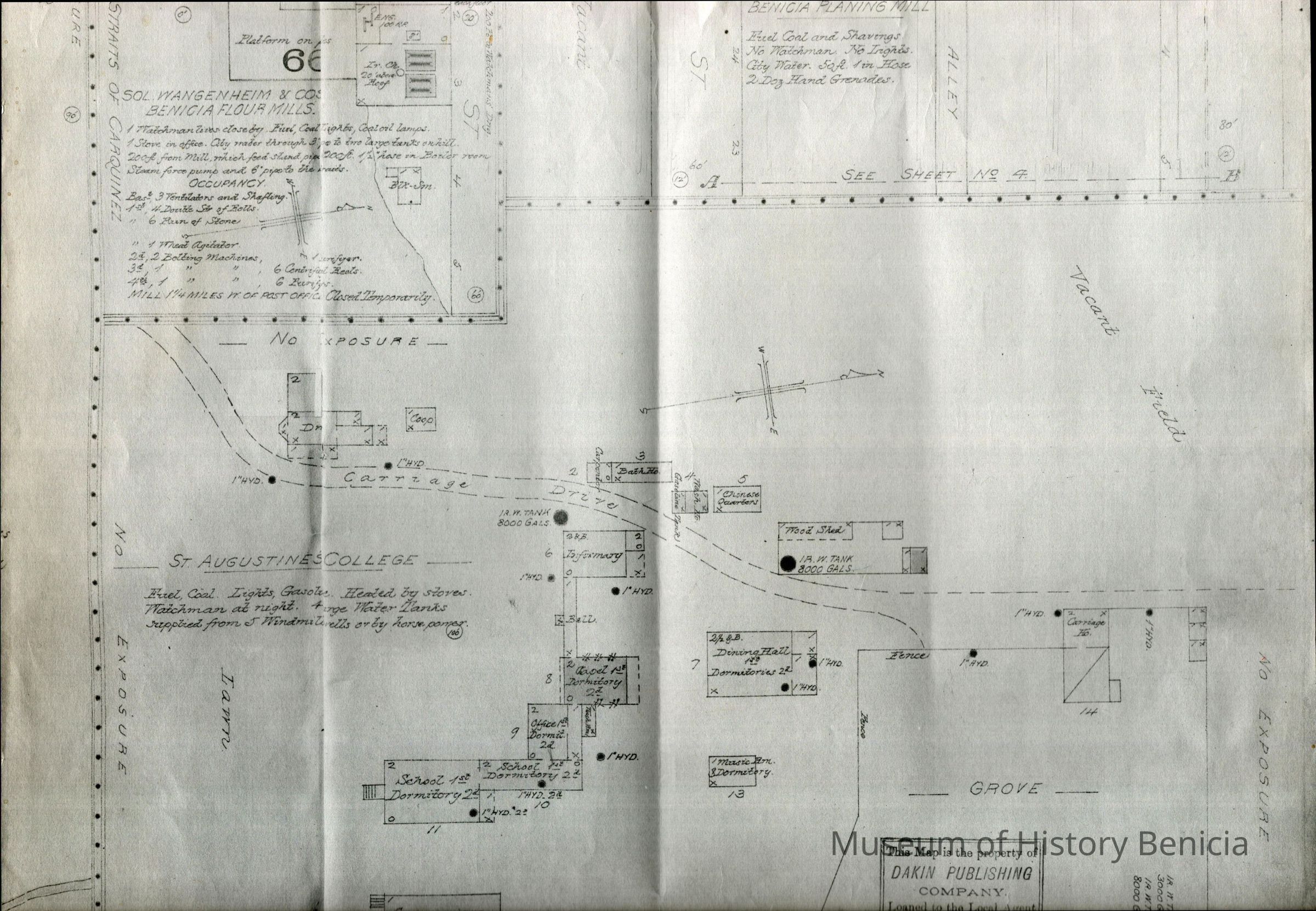 This is a map of parts of early Benicia/ It was made by the Dakin Publishing company. It shows the campus of St. Augustine's school, the Benicia Flour Co. and the Benicia "Planing" Mill. It is part of a series of maps possibly having to do with safety concerns.