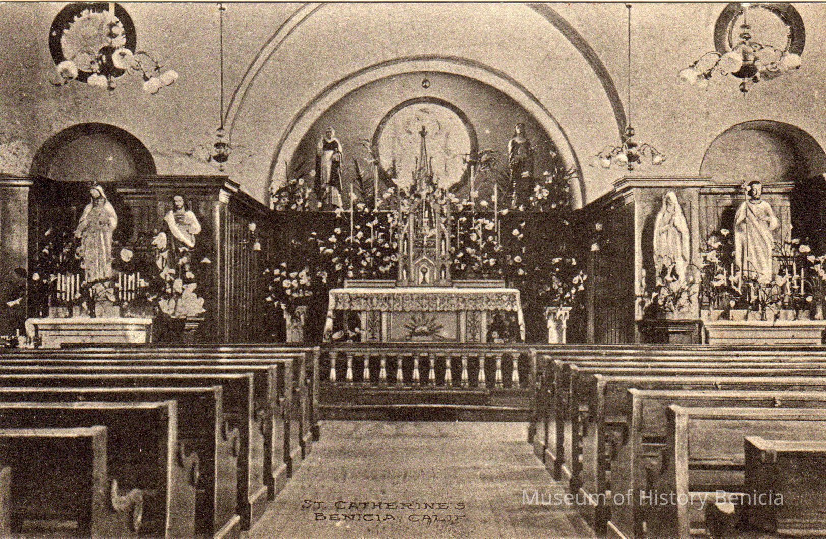 B/W image of the interior of St. Catherine's Chapel, Benicia.