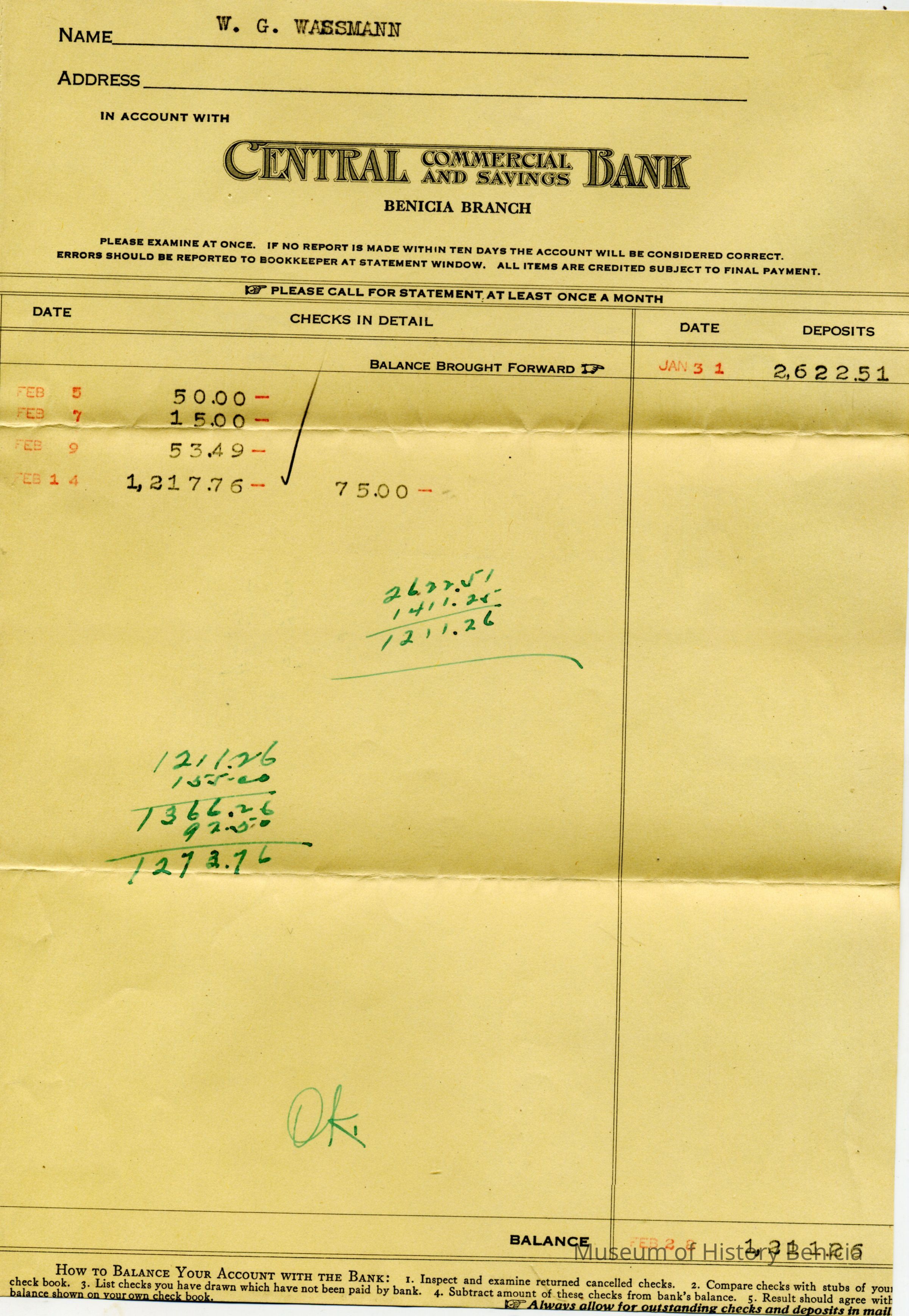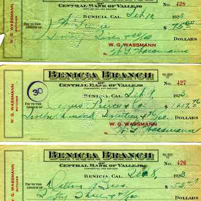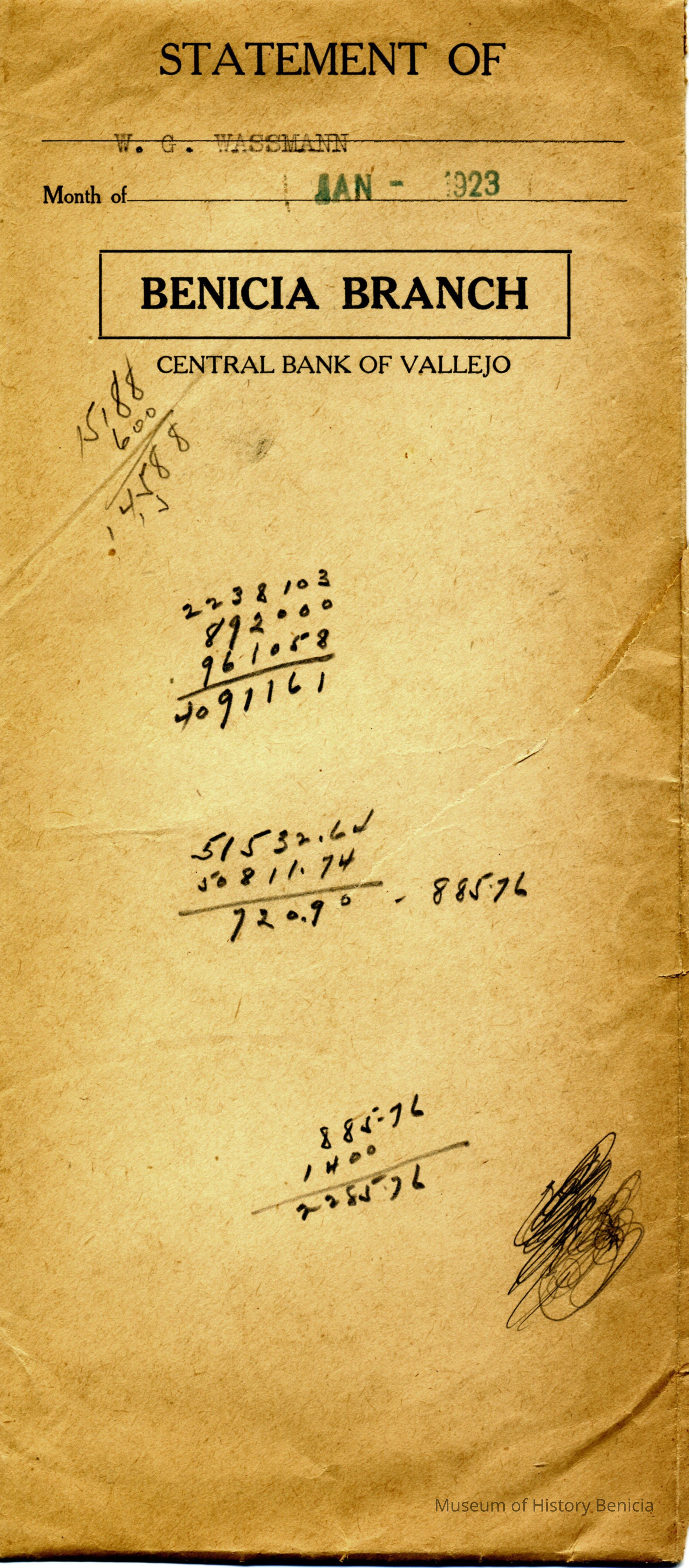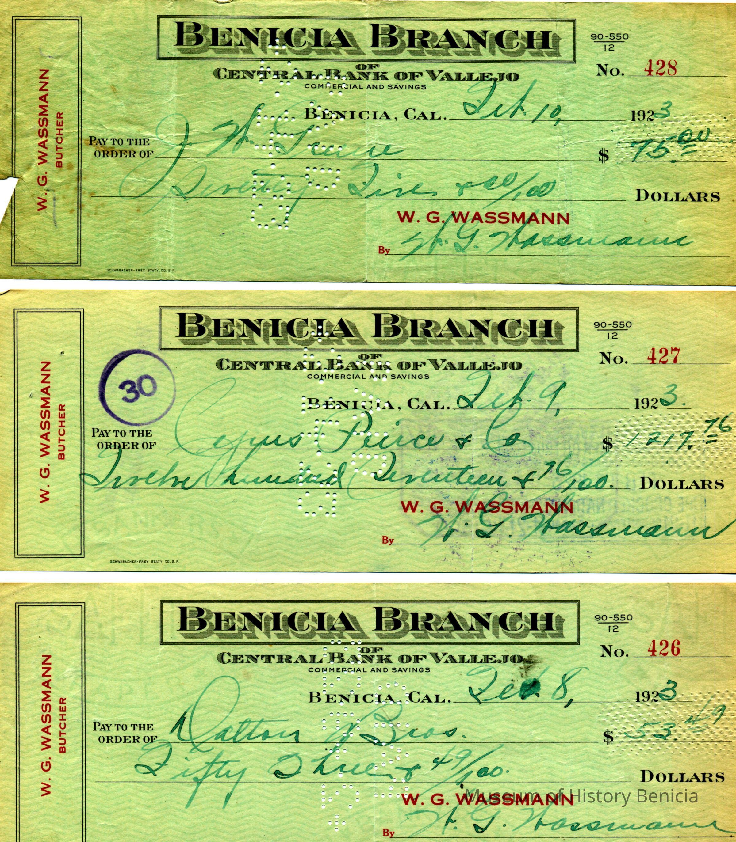 This is a statement and checks from the Central Commercial and Savings Bank of Vallejo- Benicia Branch in 1923. It shows a statement and several checks written on an account of W.G. Wassmann a local butcher.Collection