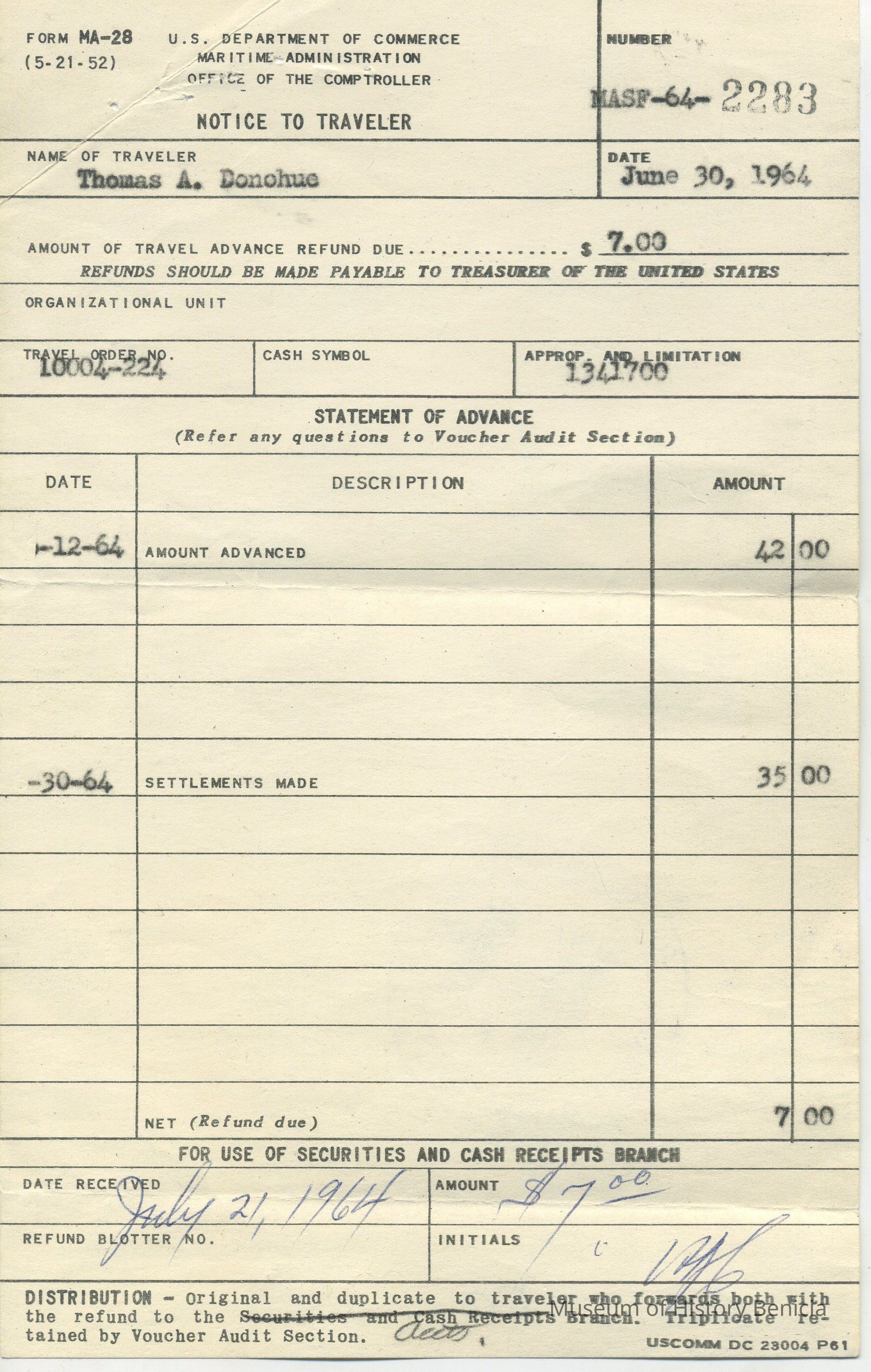 #MASF-64-2283 to traveler Thomas A. Donohue dated