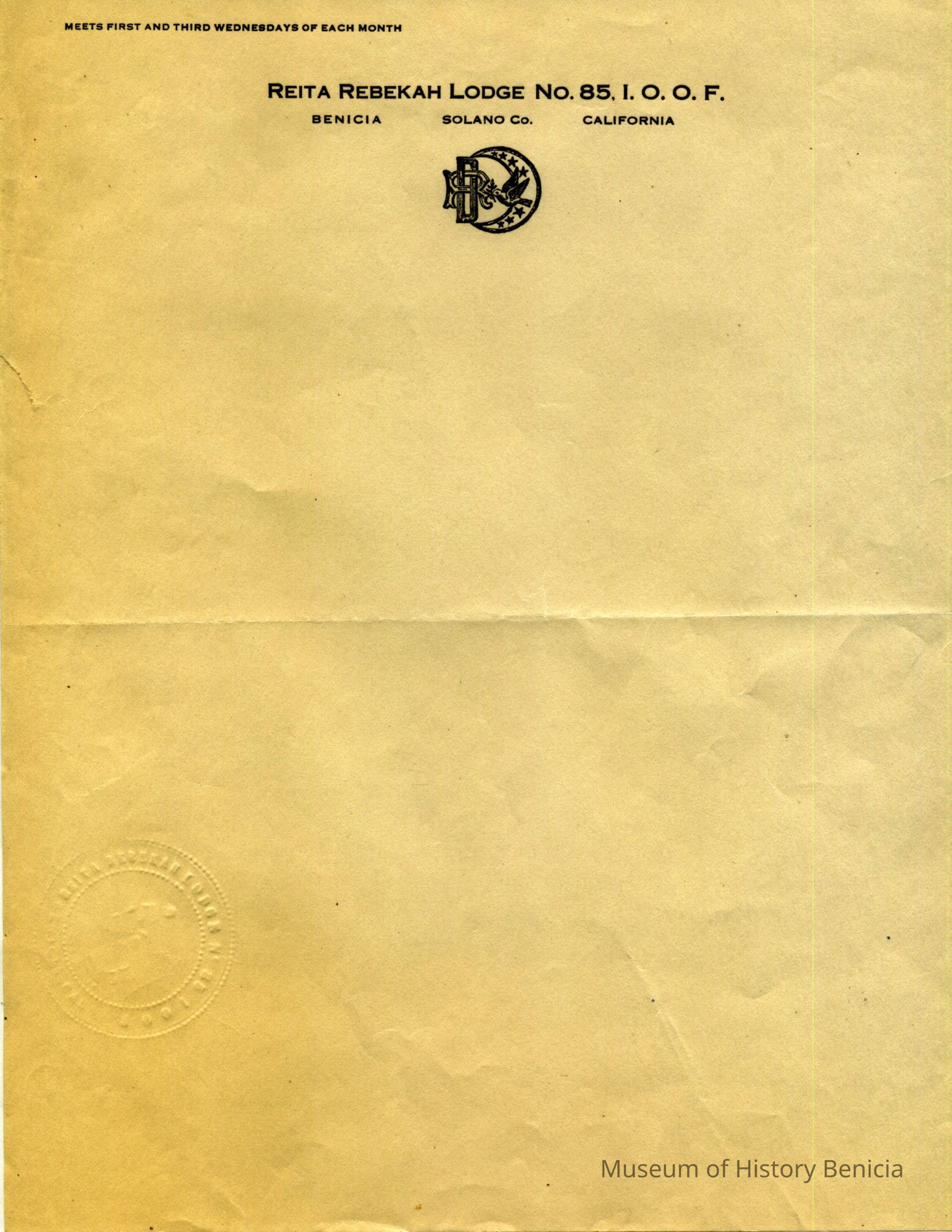 This is a sheet of stationary from the Rebekah Lodge #85 in Benicia associated with the Solano Odd Fellows Lodge #22.Collection