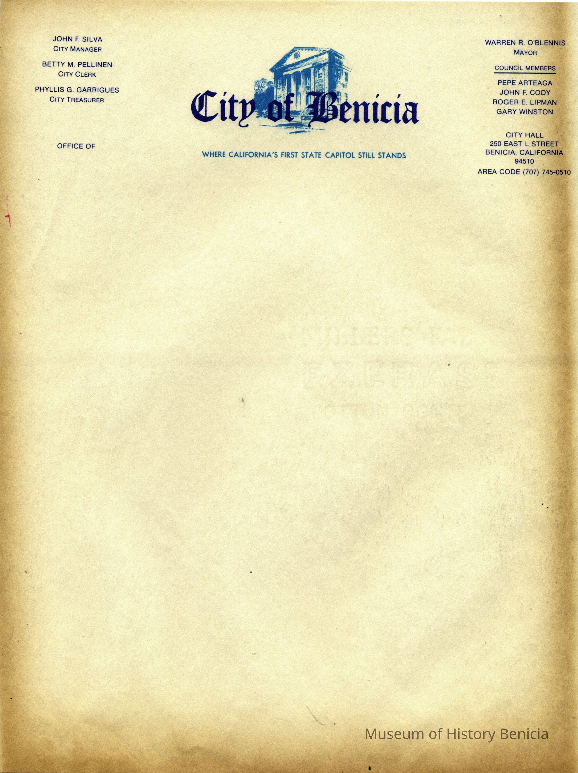 This is a piece of Benicia City government stationary from the time when Warren R O'Blennis was mayor of Benicia. Council Members were: