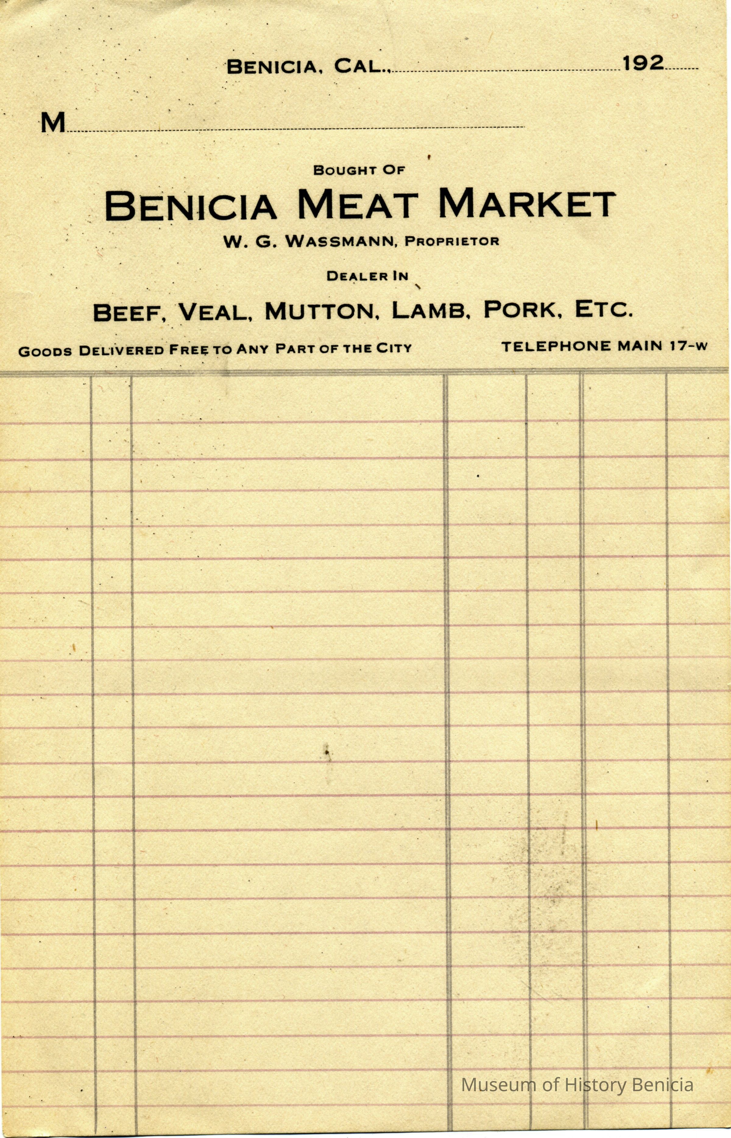 This is a piece of blank stationary (receipt) from the Benicia Meat Market owned by W.G. Wassmann. It is from the 1920's.