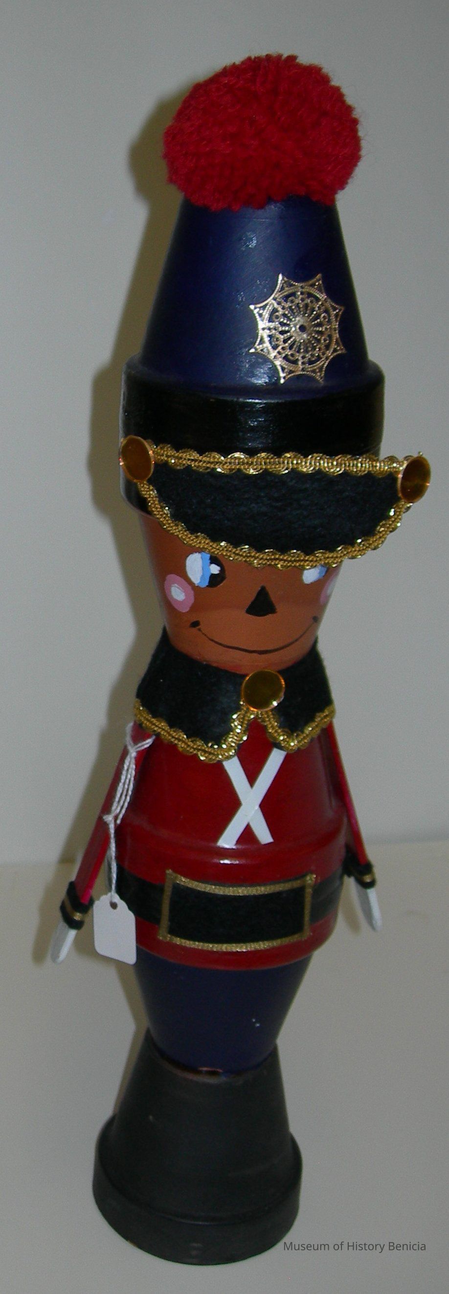 Twin of 2011.005.0011. Nutcracker made of painted flower pots. Five flower pots stacked together, with various crafty additions - pom-pom for hat, popsicle sticks for arm, felt for collar and belt, etc. Part of hat has come unglued. Other than that, in good condition. This was made by Lillian Eggen.Collection