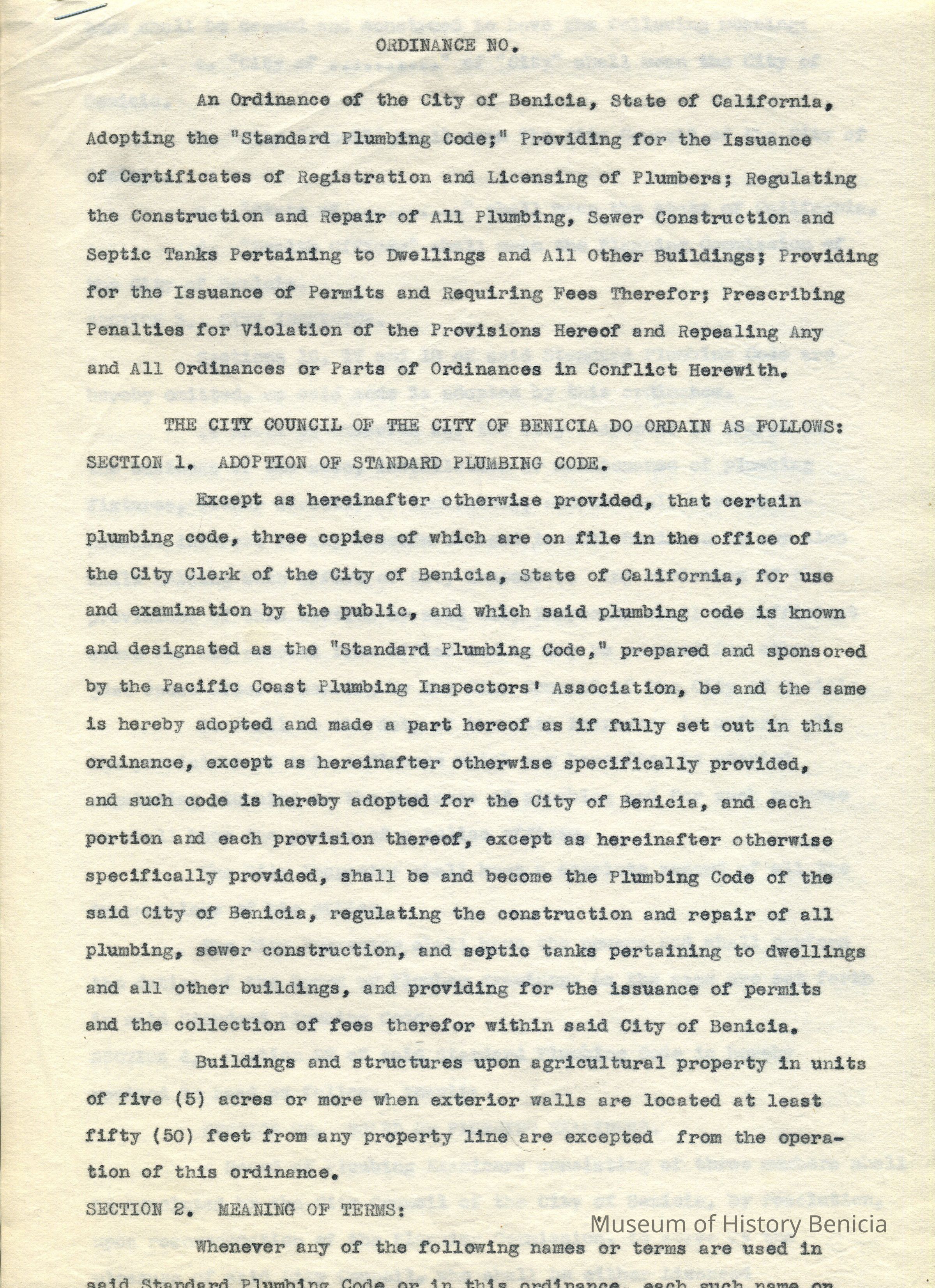 Seven page (undated) ordinance adopting the Standard Plumbing Code. Document titled 'Ordinance No." and signed on the last page by Mayor Thomas Wright.