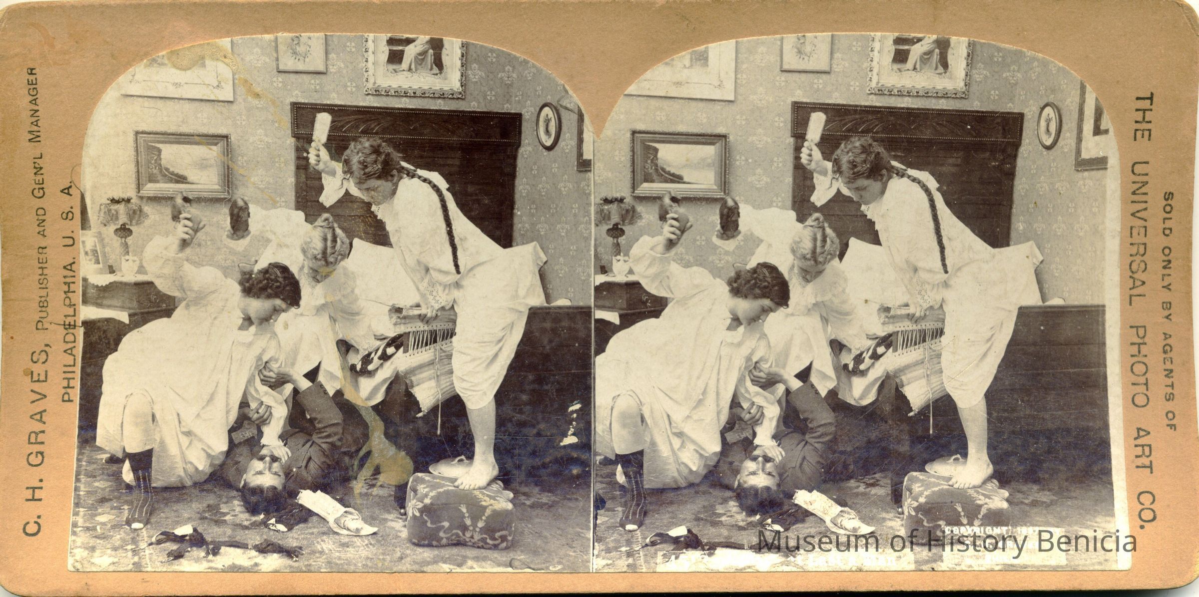 This is a stereocard made by C H. Graves of Philadelphia and copyrighted 1897. It is no. 4518 " At Last a Man". It shows women in night clothes attacking a man. It was sold by the Universal Photo Art Co.Collection