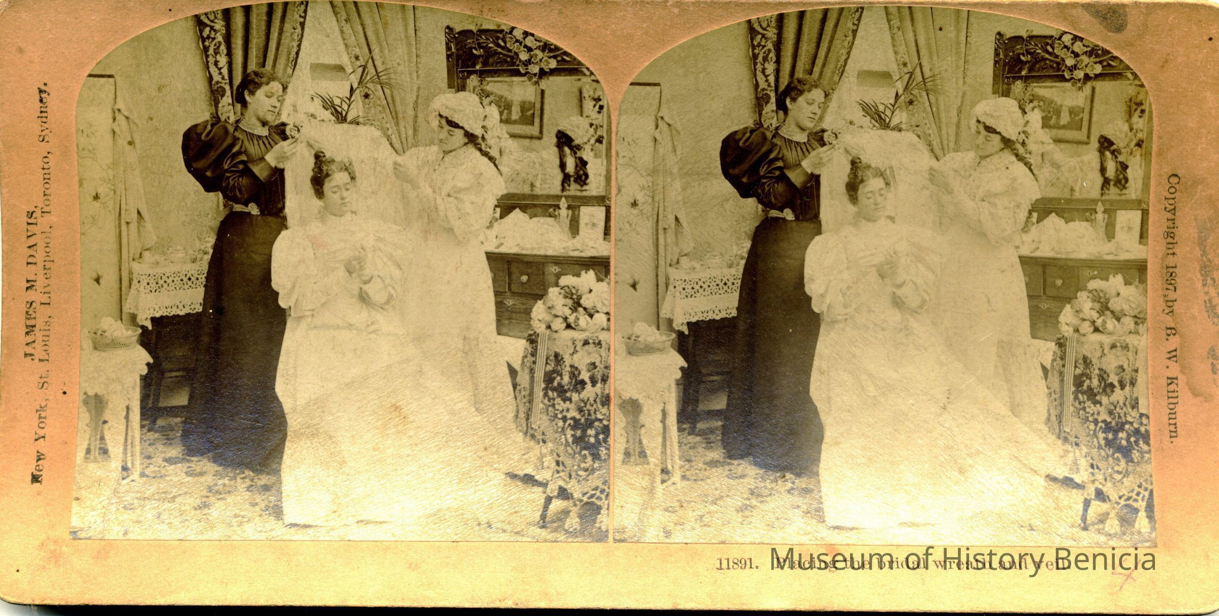 This is a stereocard made by B.W. Kilburn of Littleton, N.H. and copyrighted 1897. It is no. 11891 "Placing the Bridal Wreath and Veil". It shows a woman getting dressed for her wedding. The photographer is James M. Davis.Collection