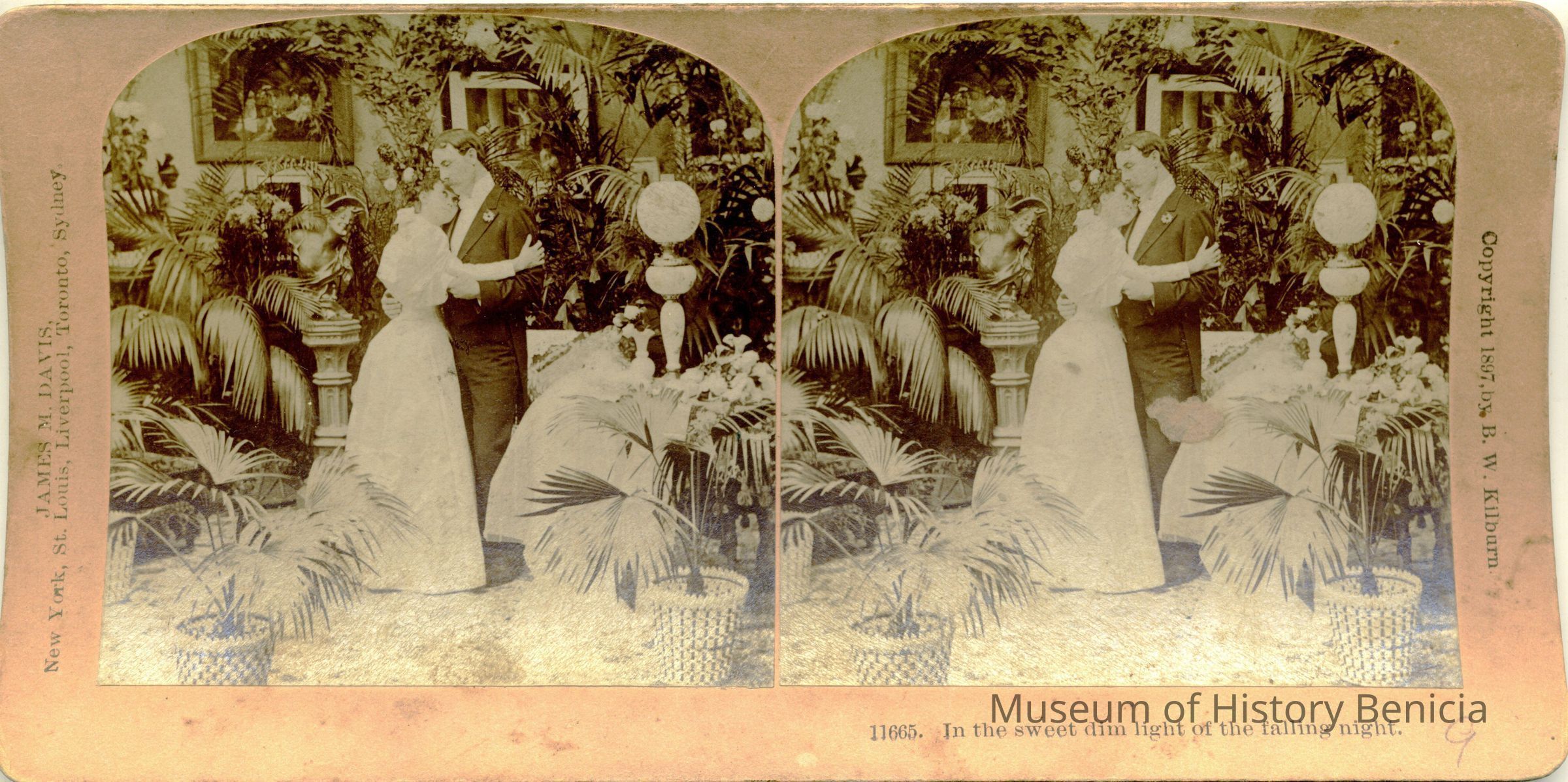 This is a stereocard made by B.W. Kilburn of Littleton, N.H. and copyrighted 1897. It is no. 11665 "In the Sweet Dim Lght of the Falling Night". It shows a couple dancing. The photographer is James M. Davis.Collection