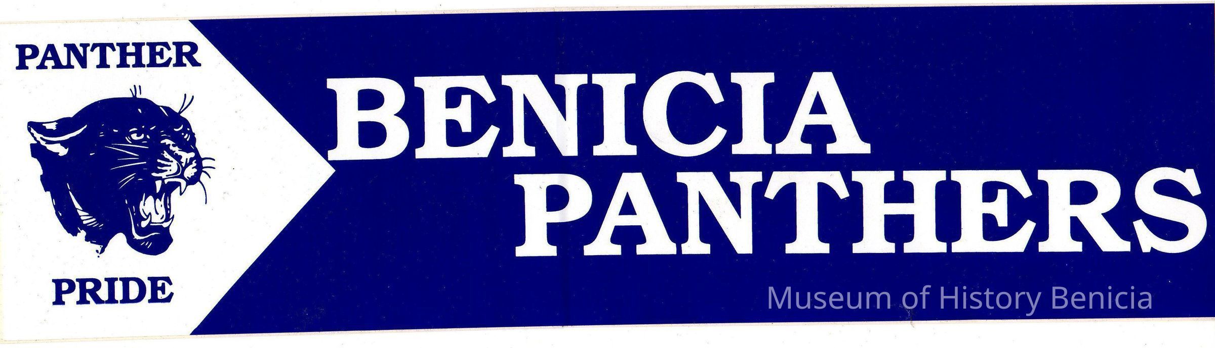Bumper sticker. "Panther Pride- Benicia Panthers" with picture of a panther head. White on Blue