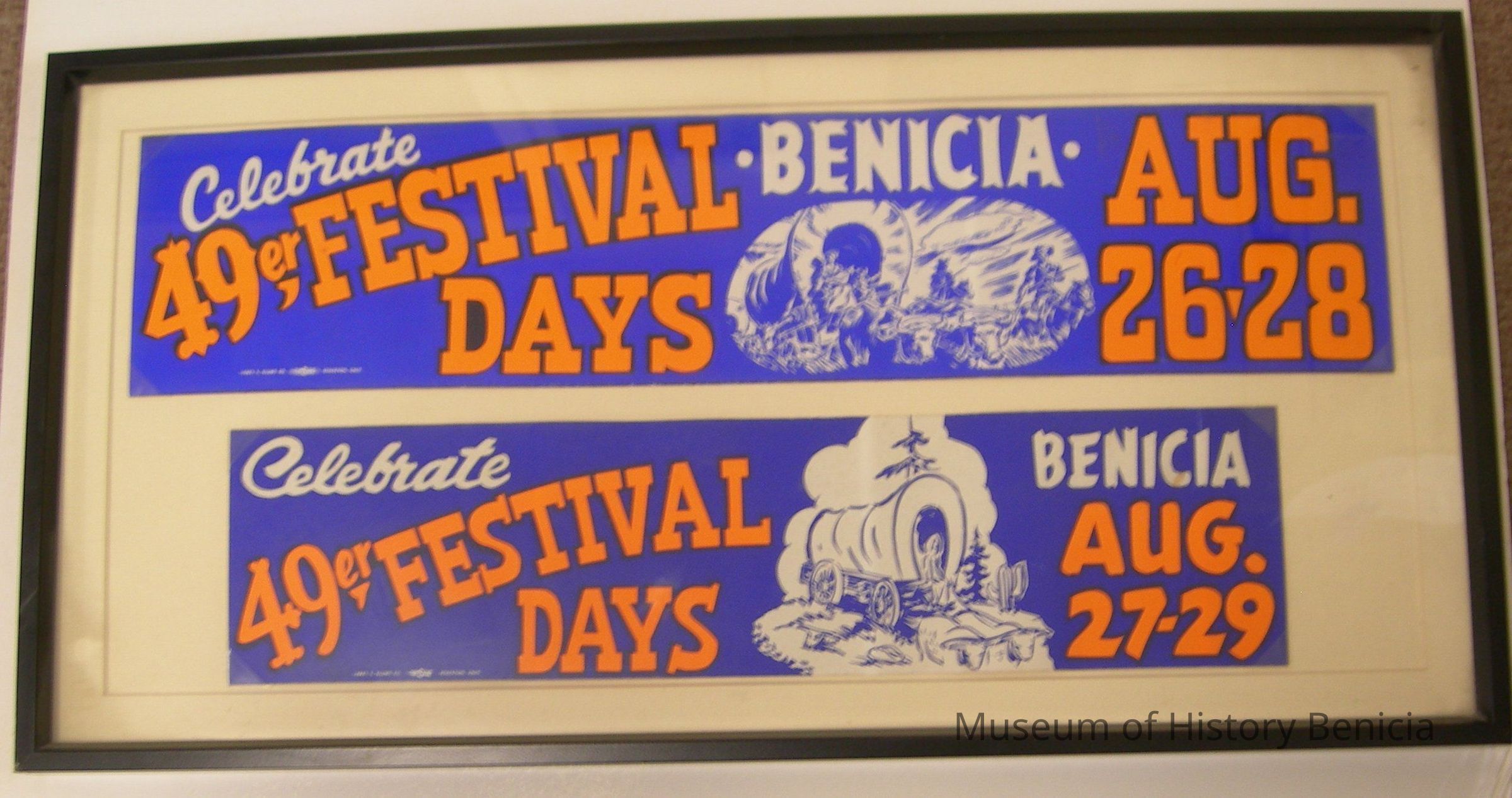 Two bumper stickers advertising and promoting the Celebrations of '49er days in Benicia; the stickers were printed by