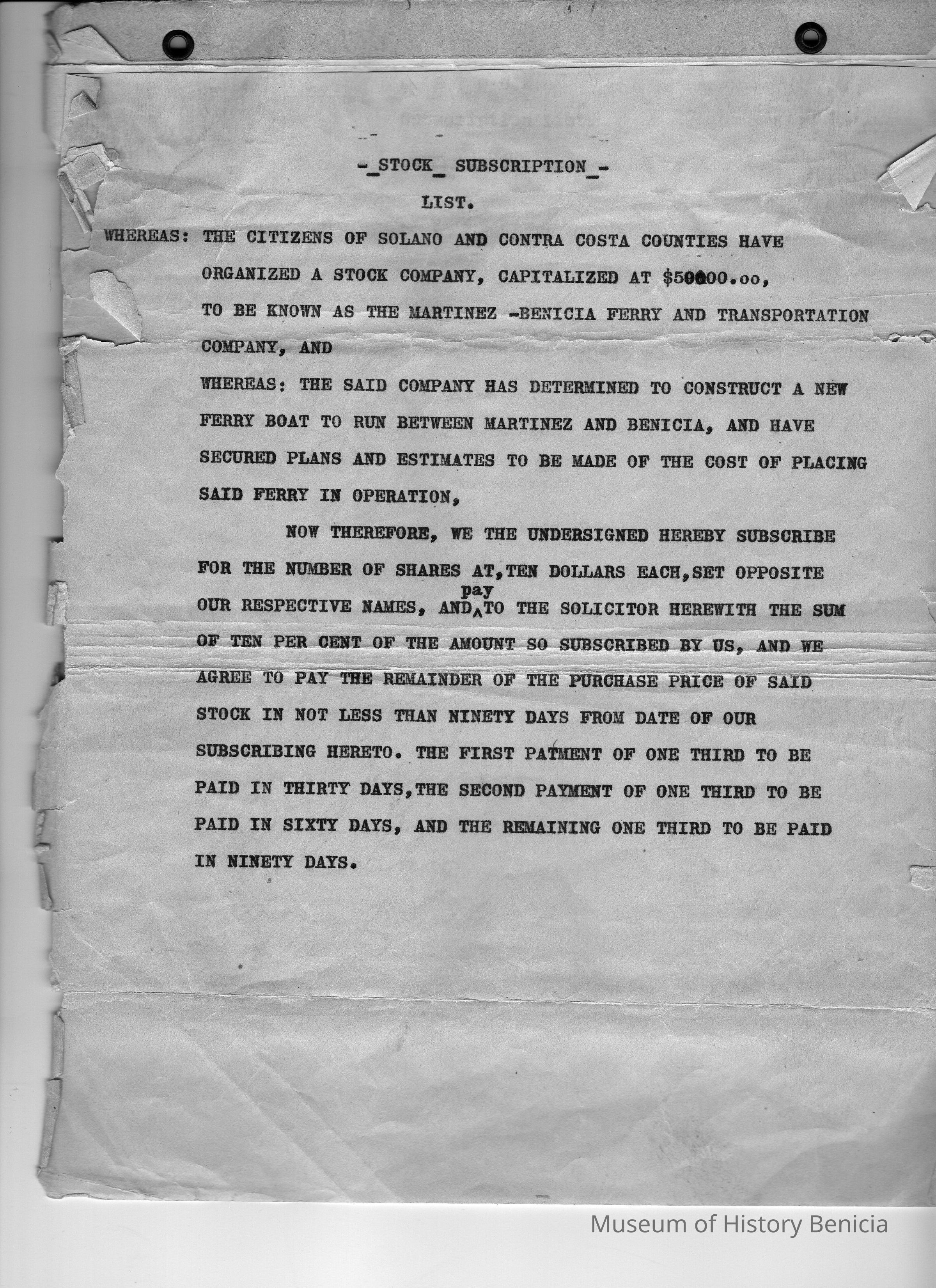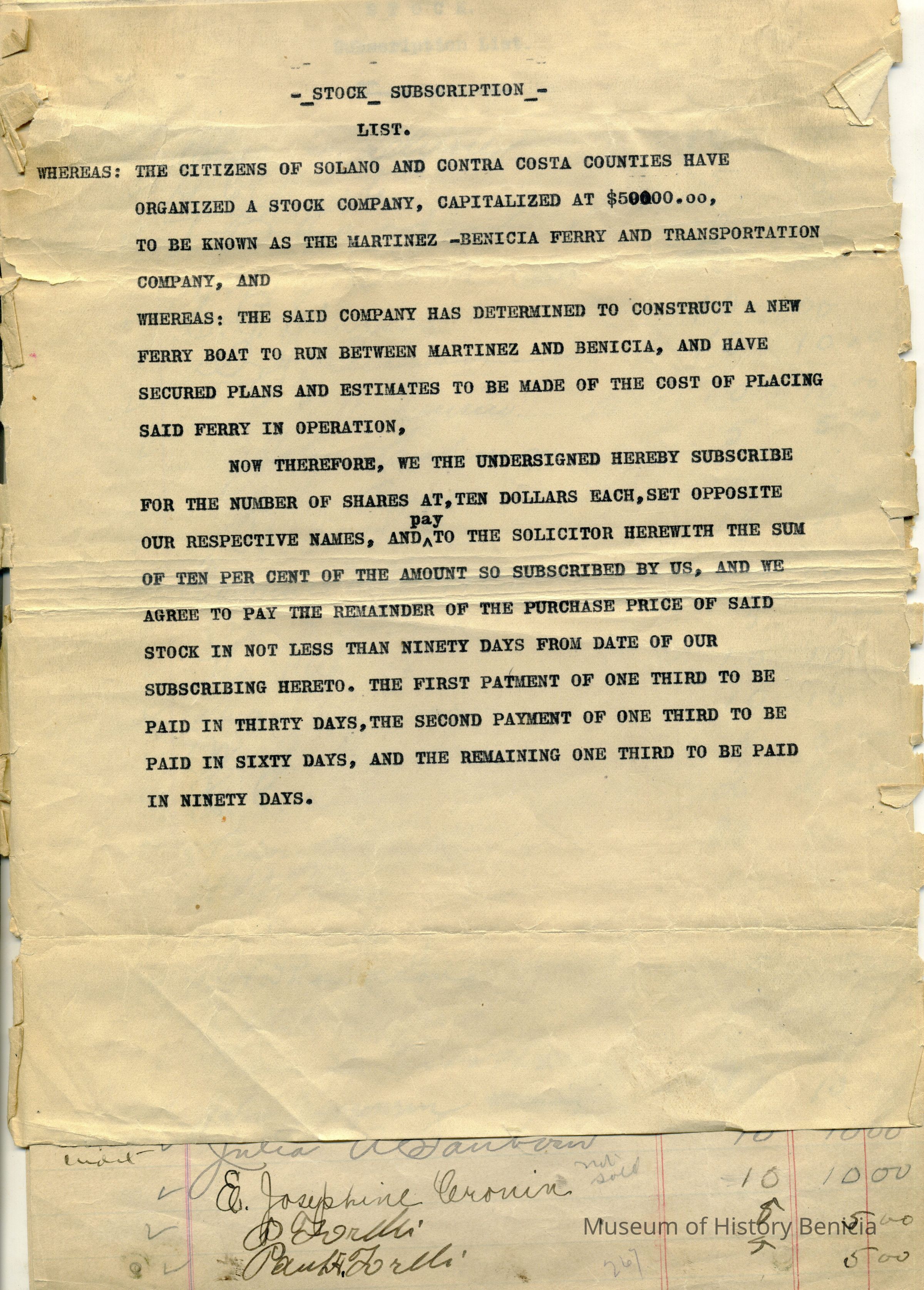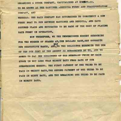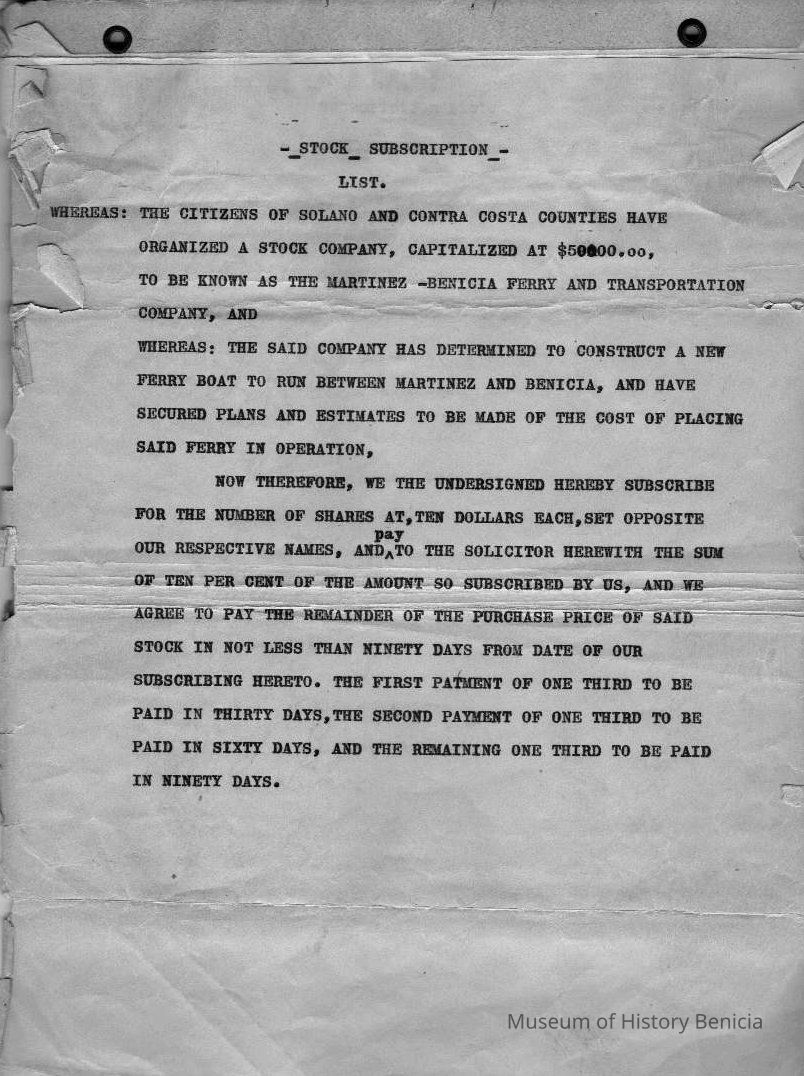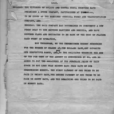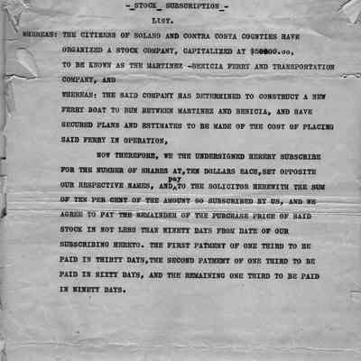 Whereas: The citizens of Solano and Contra Costa Counties have organized a Stock Company. Capitalized at $50000.00, to be know as The Martinez and Benicia, and have secured plans and estimates to be made of the cost of placing said ferry in operation. Now therefore, we the undersigned hereby subscribe for the number of shares at, ten dollars each, set opposite our respective names, and pay to the solicitor herewith the sum of ten per cent of the amount so subscribed by us, and we agree to pay the remainder of the purchase price of said stock in the not less than ninety days from date of our subscribing hereto. The first payment of one third to be paid in sixty days, and the remaining one third to be paid in ninety days.