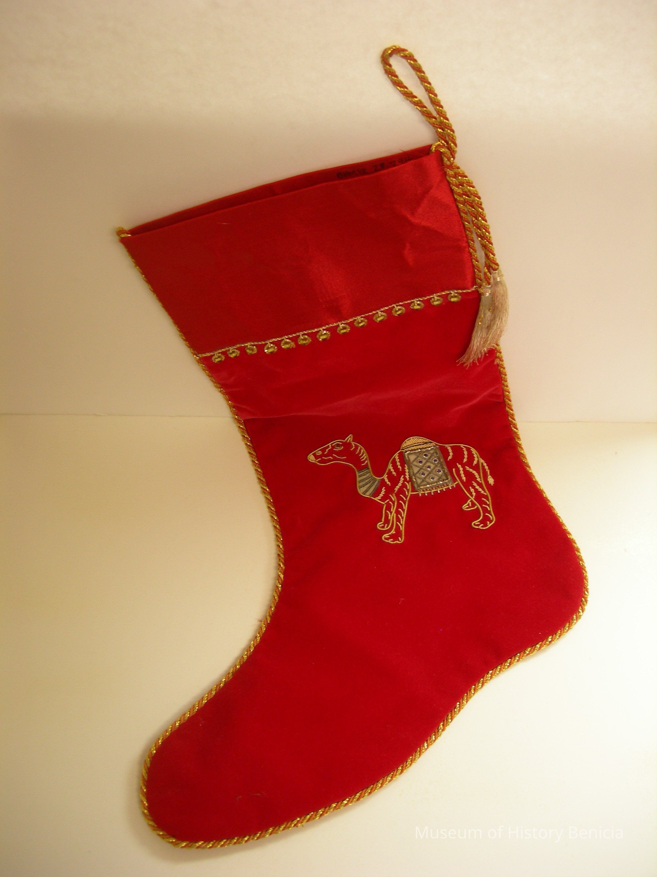 Christmas Stocking - red satin and velvet with gold braid trim and embroidered camel; has hanging loop and tassels 17" long