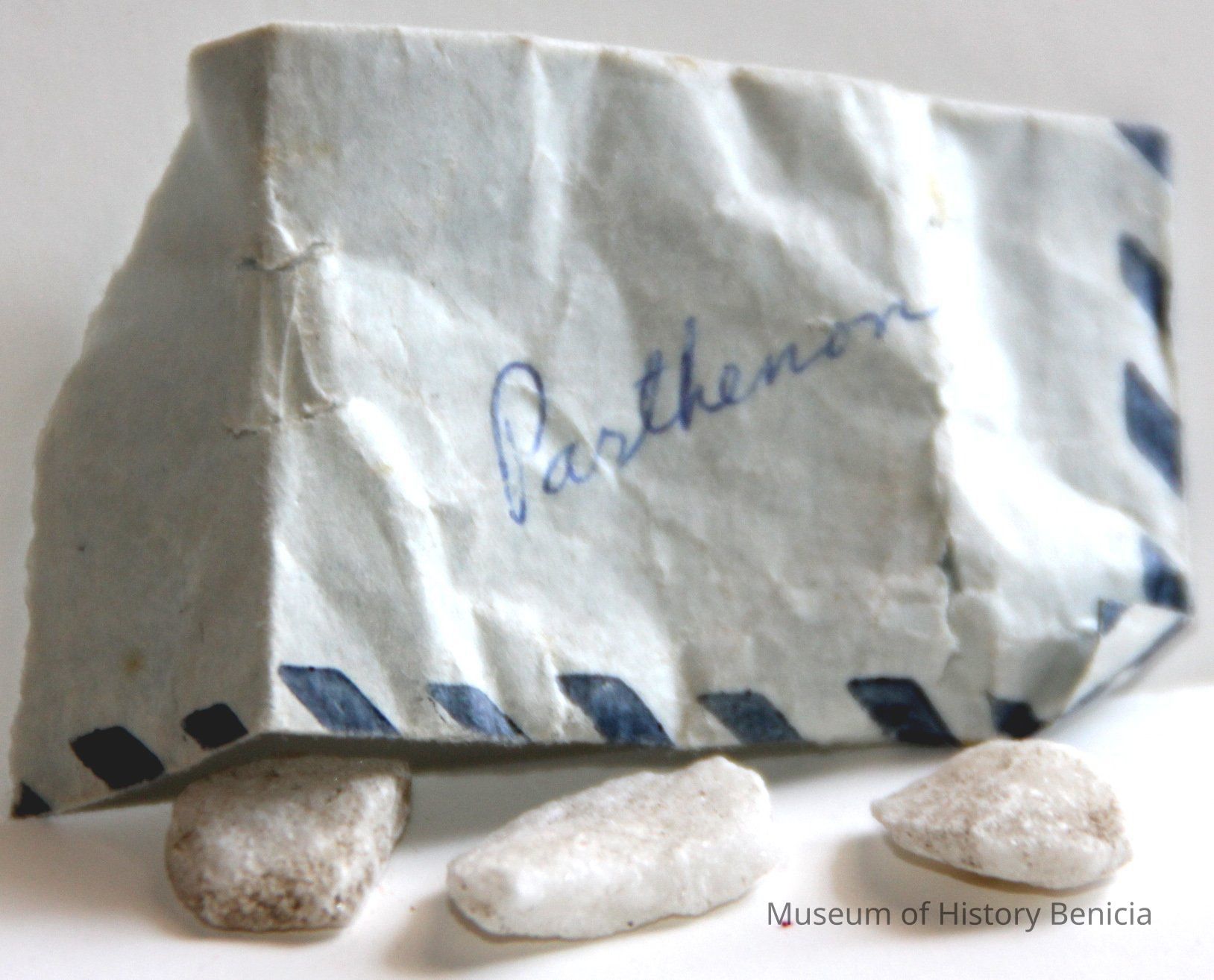 Rock from the Parthhenon. Three rocks in a part of an envelope.