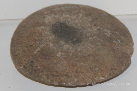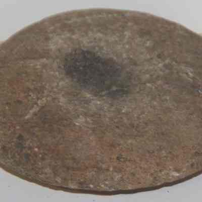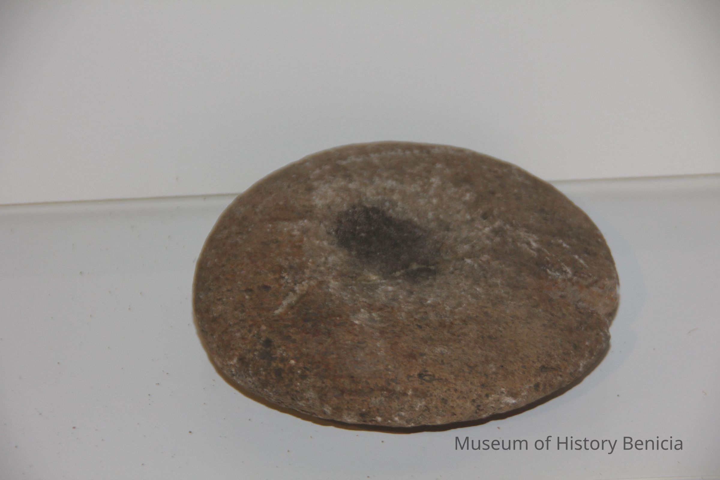 flattened oval of granite (?) w/darkened depression in center of one side. Tape on bottom #46