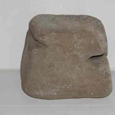 generally square piece of grey-tan rock (sandstone?) three sides have grooves worn into them; according to donor it is a sharpenin stone