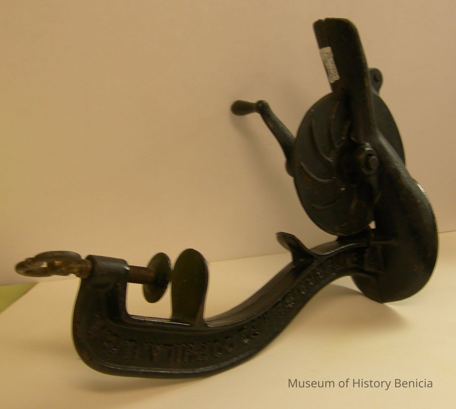 Cherry stoner, black iron, No 16, hand crank, can be attached to table or counter with a screw key; Enterprise Mfg. Co. Phila. U.S.A.; "Needs No Adjusting" on one side; 12" longCollection