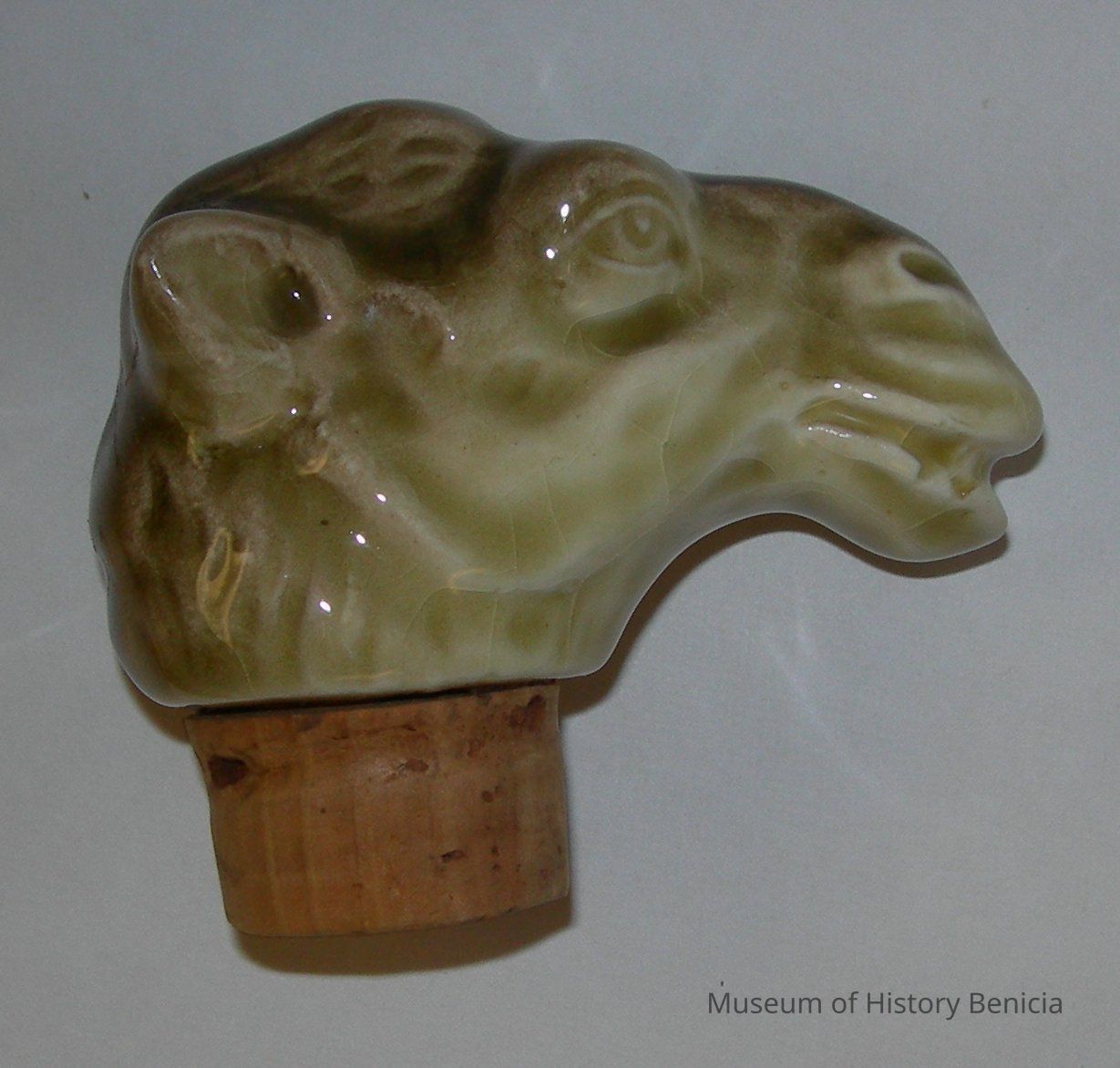 Ceramic camel head bottle stopper, several shades of brown with cork around end that goes in the bottle not with bottle