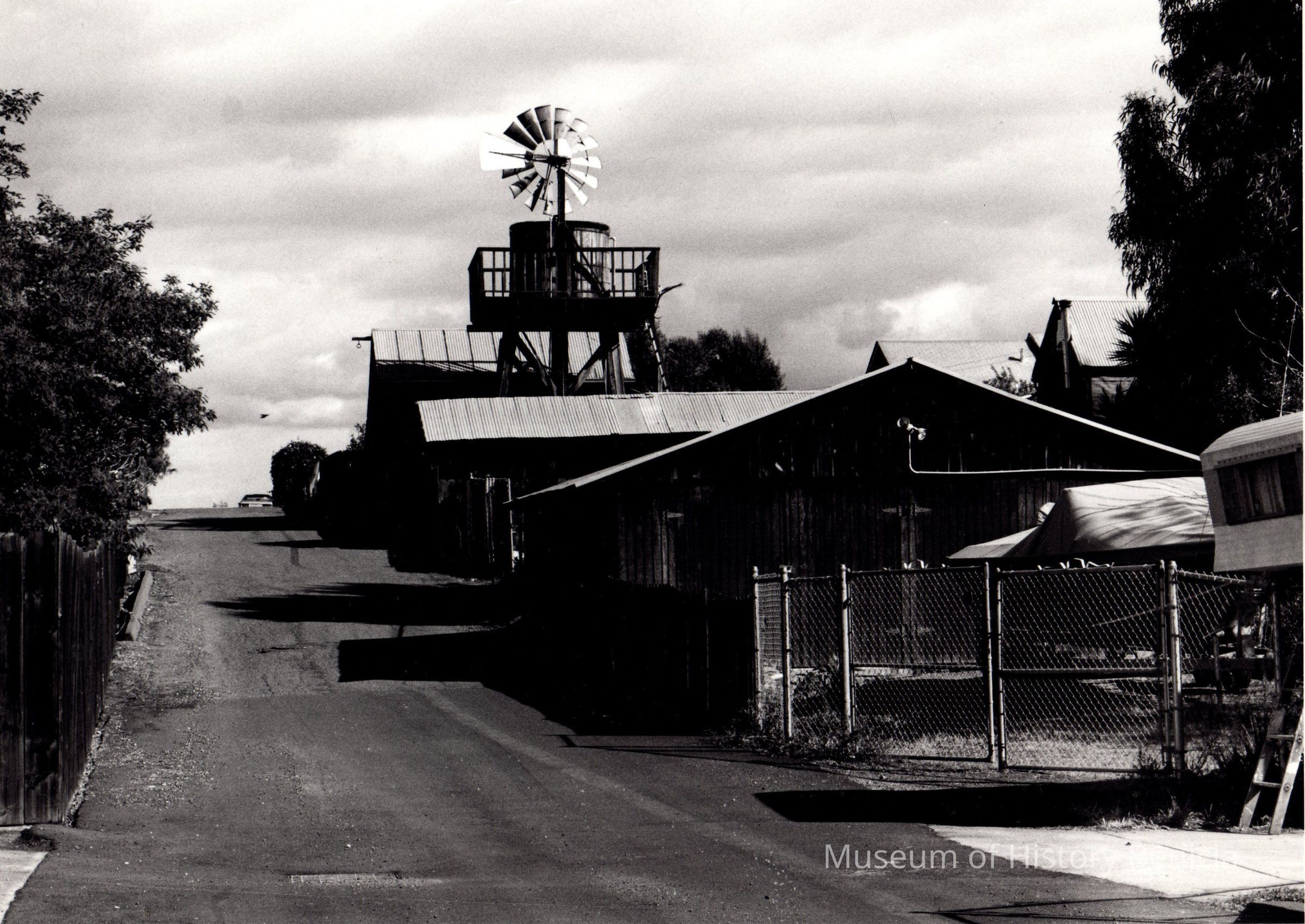 B/W Photograph: "Street with Windmill" possibly an alley in the vicinity of the Yuba complex (address is 553 East "G" street).