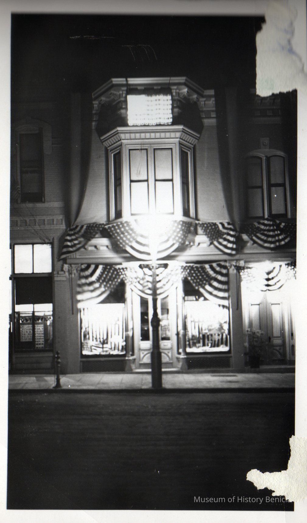 Original B/W photograph. Nighttime view of Stumm's Jewelry Store on First Street. Photo was taken from across the street and the Stumm's is decorated with American flag bunting on and above the windows.Collection