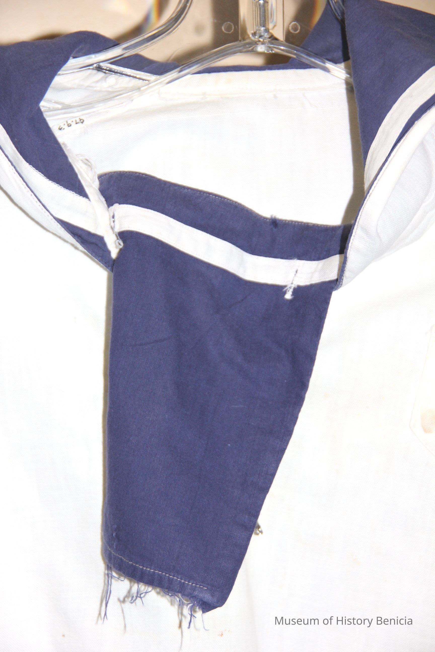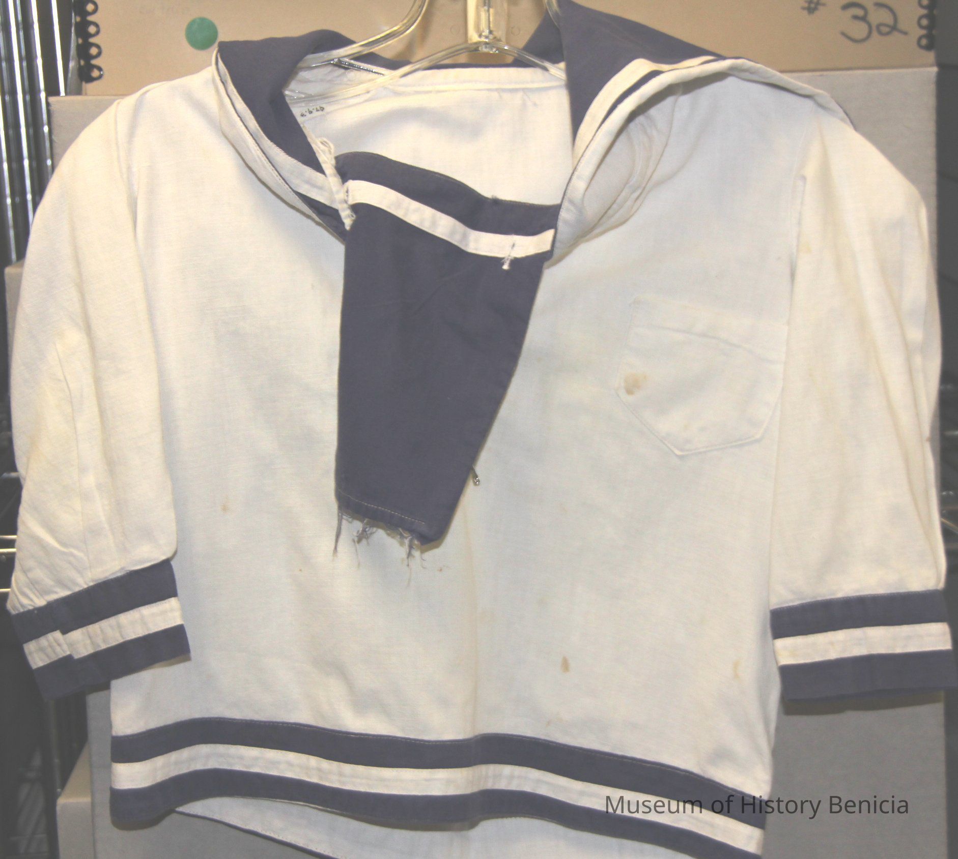 Navy blue sailor collar white blouse with laced front. Blue stripes on sleeves and around bottom.